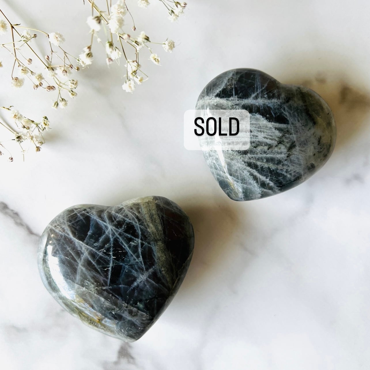 白いラインの模様が素敵なラブラドライトのハート型パームストーンです。