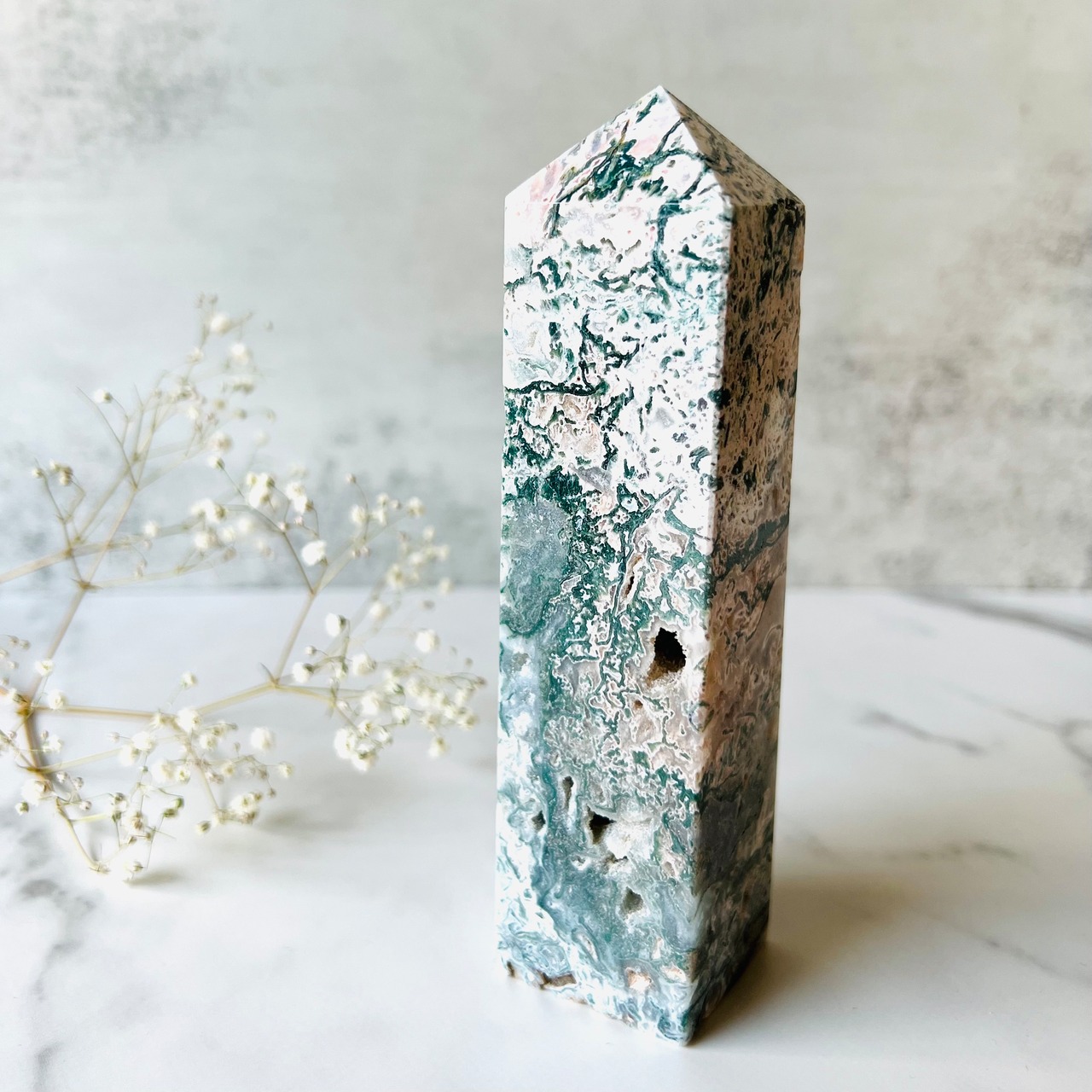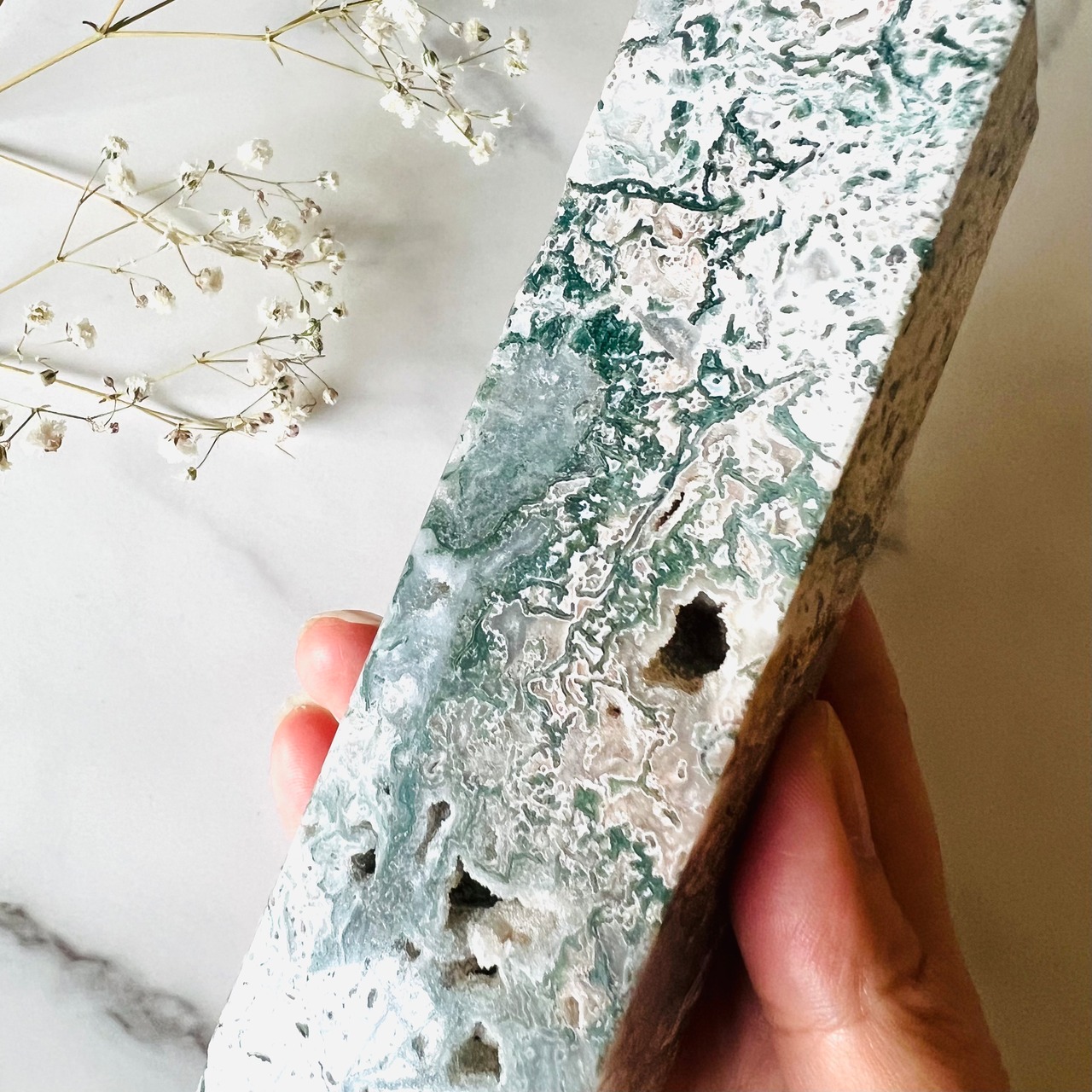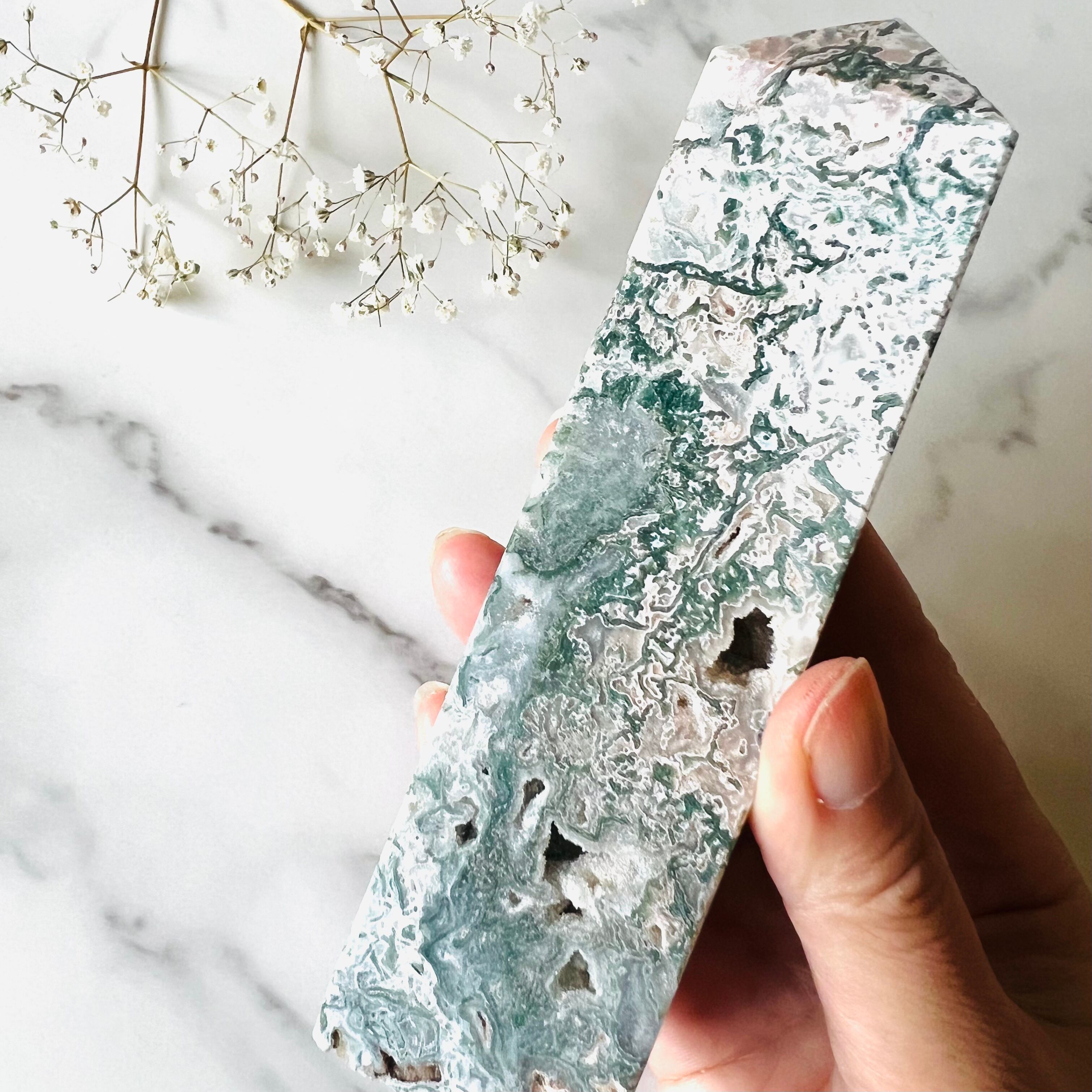 モスアゲートは、癒しの石として知られています。感情の乱れを整え、エゴや執着を解き放ち、心身を安定した状態に保ち、生活に疲れた人に平和で穏やかなパワーをもたらしてくれます。森林浴と同じ効果があると言われており、持ち主に自然の恵みを与え、富と繁栄をもたらすパワーストーンです。