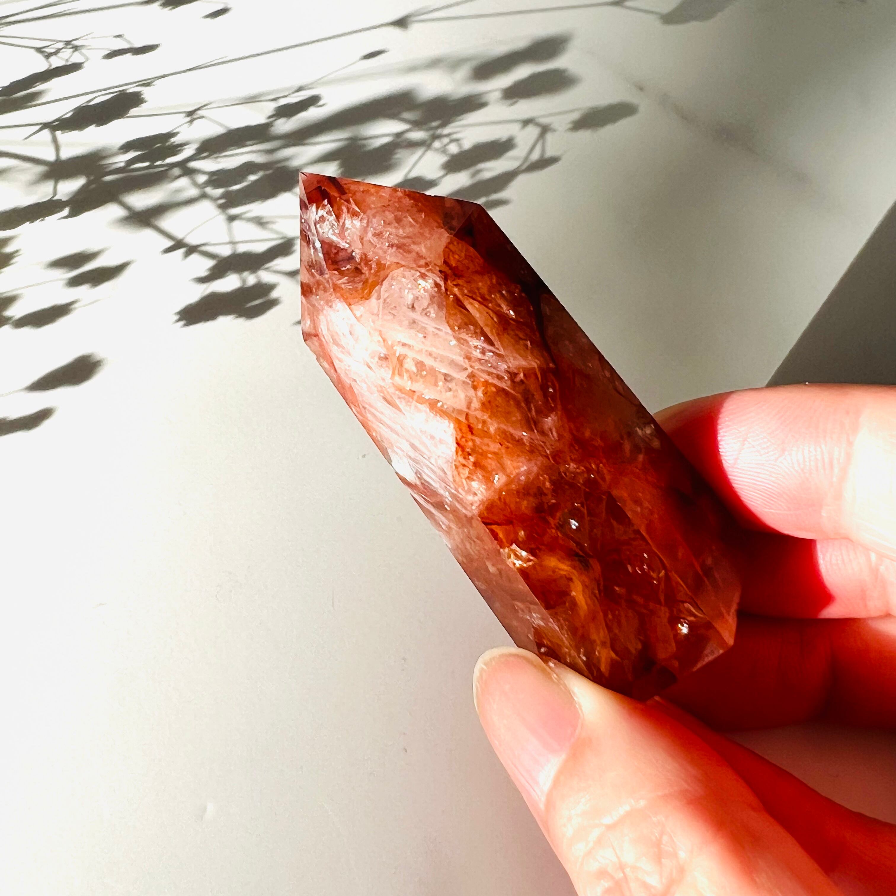濃い赤に明るいオレンジ、白や透明なクォーツのグラデーションが美しく、どの面から見てもラメや虹が輝き、元気づけてくれます。