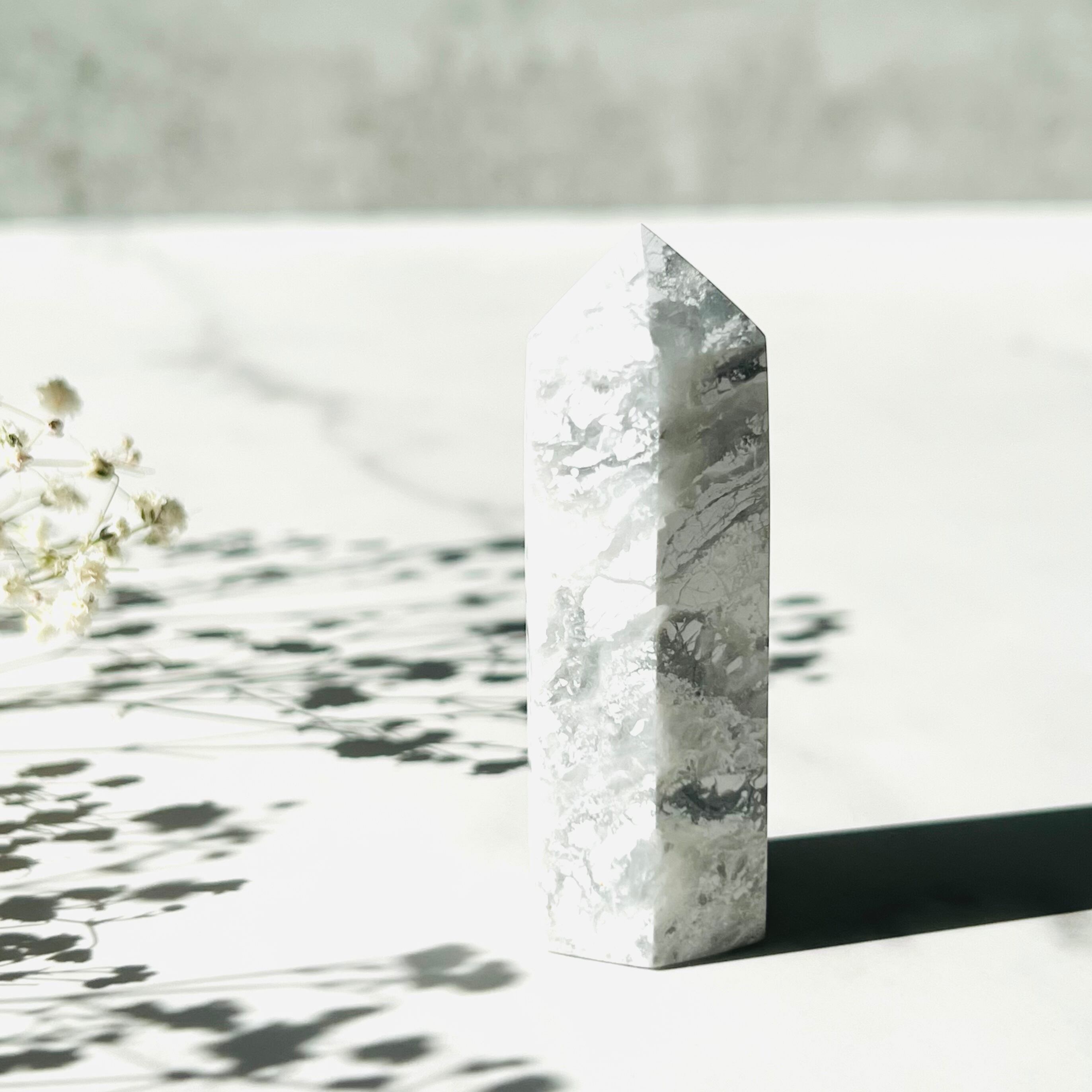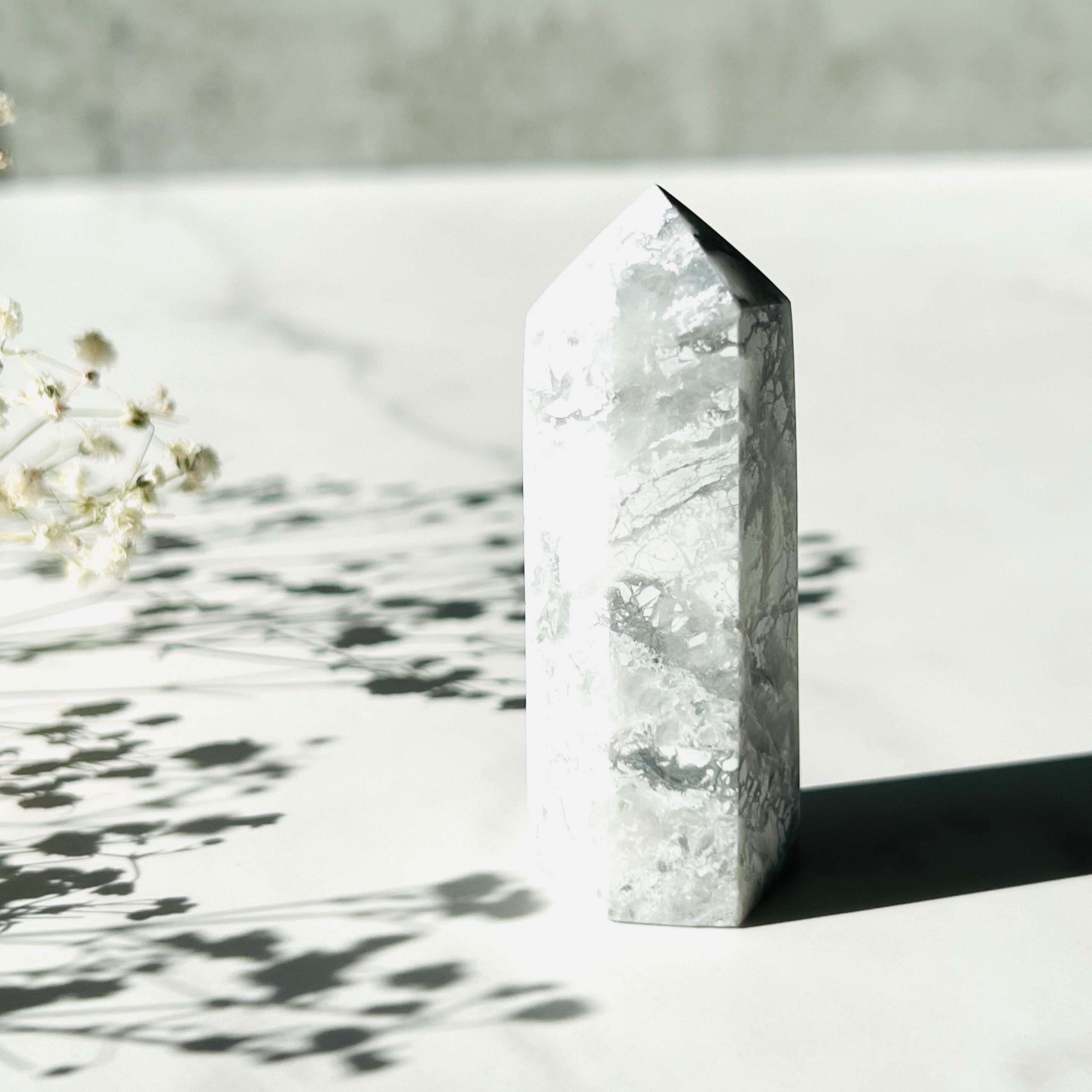 ハウライトといえば石膏のようにマットな印象ですが、このアイテムはクォーツが多めに入っており、マットな層と透明感があるがマーブル模様に混じり合い魅力的なテクスチャを見せてくれます。光にかざすとクォーツ部分がキラキラと瞬いてとっても綺麗です。