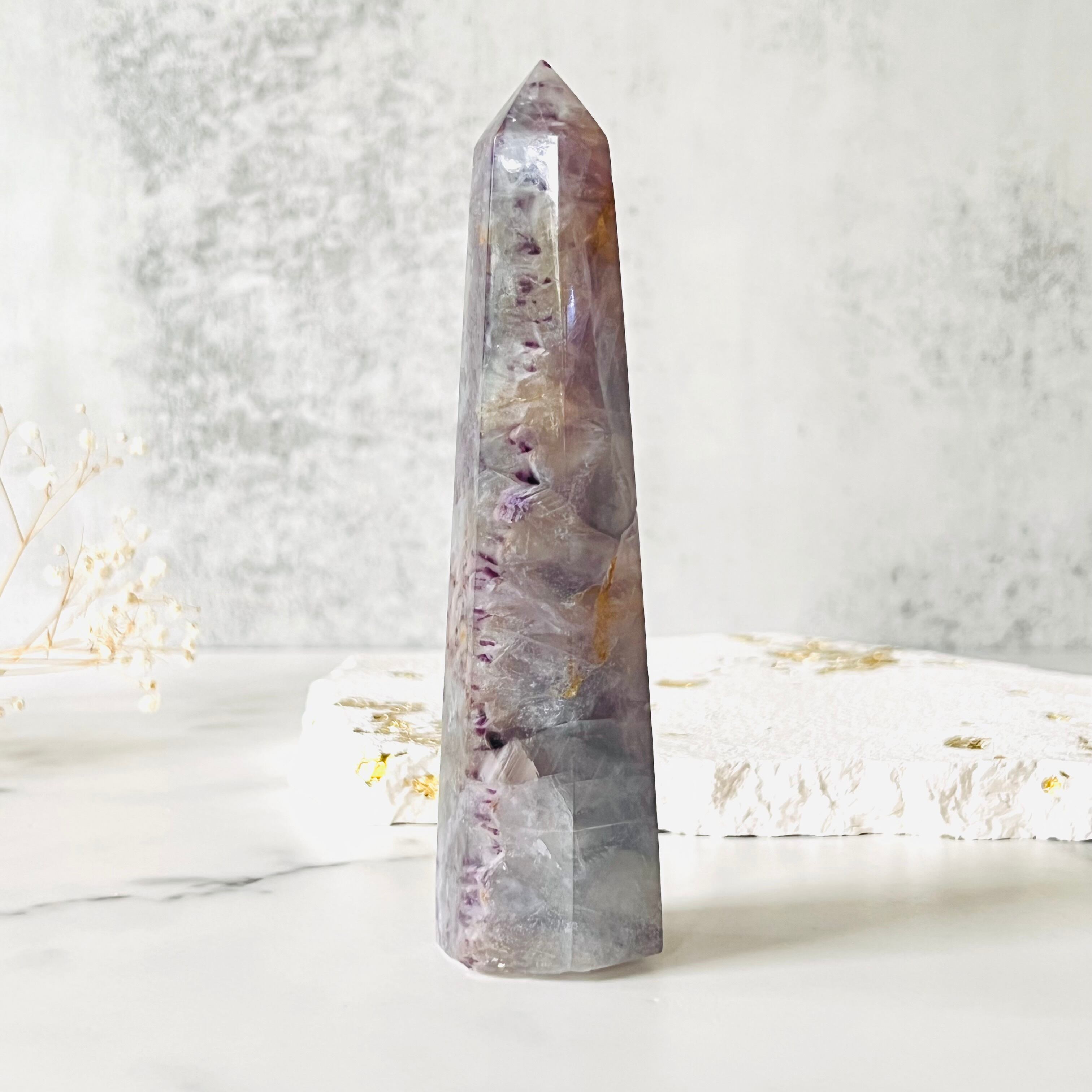 淡くシックなパープルカラーが美しいフローライトのタワーです。