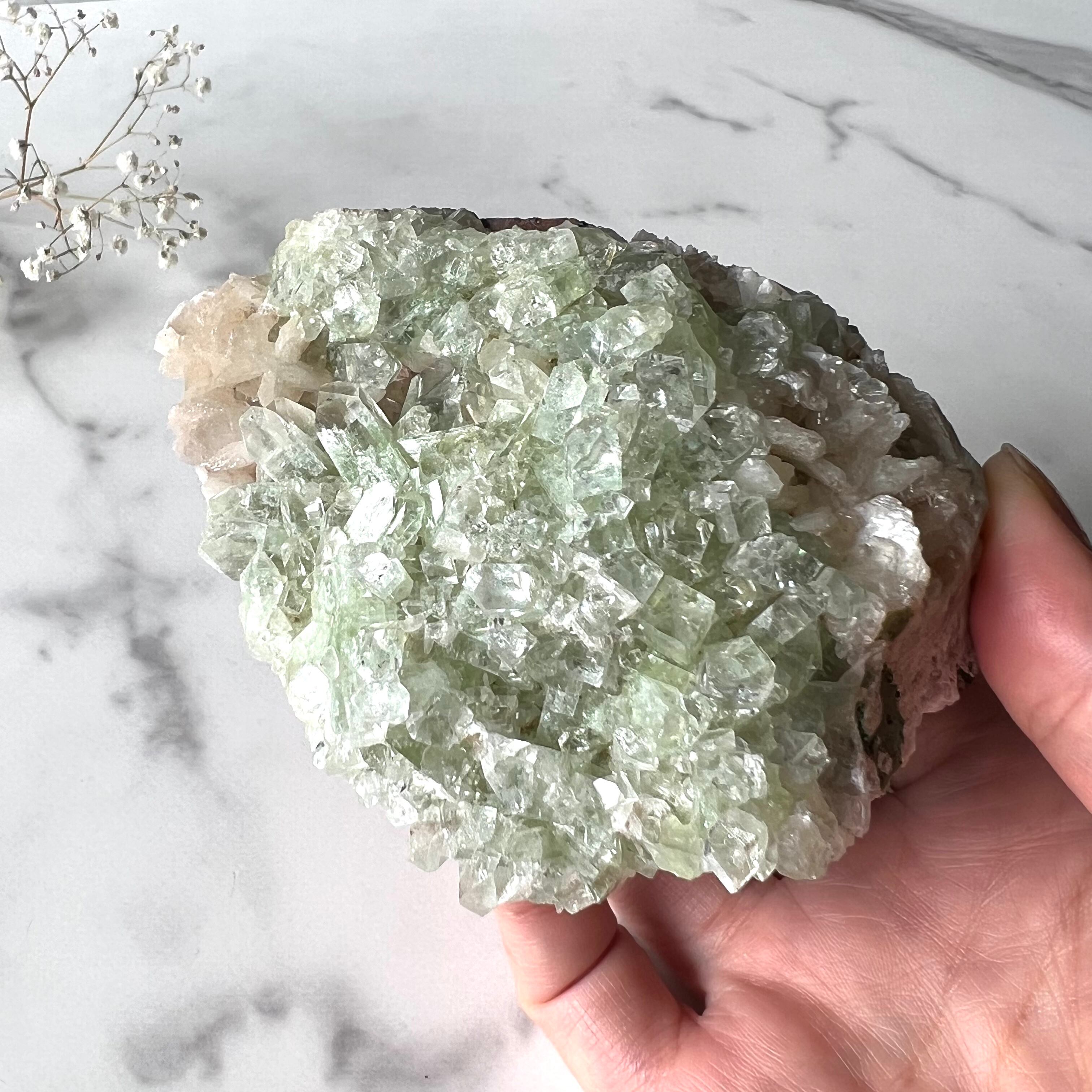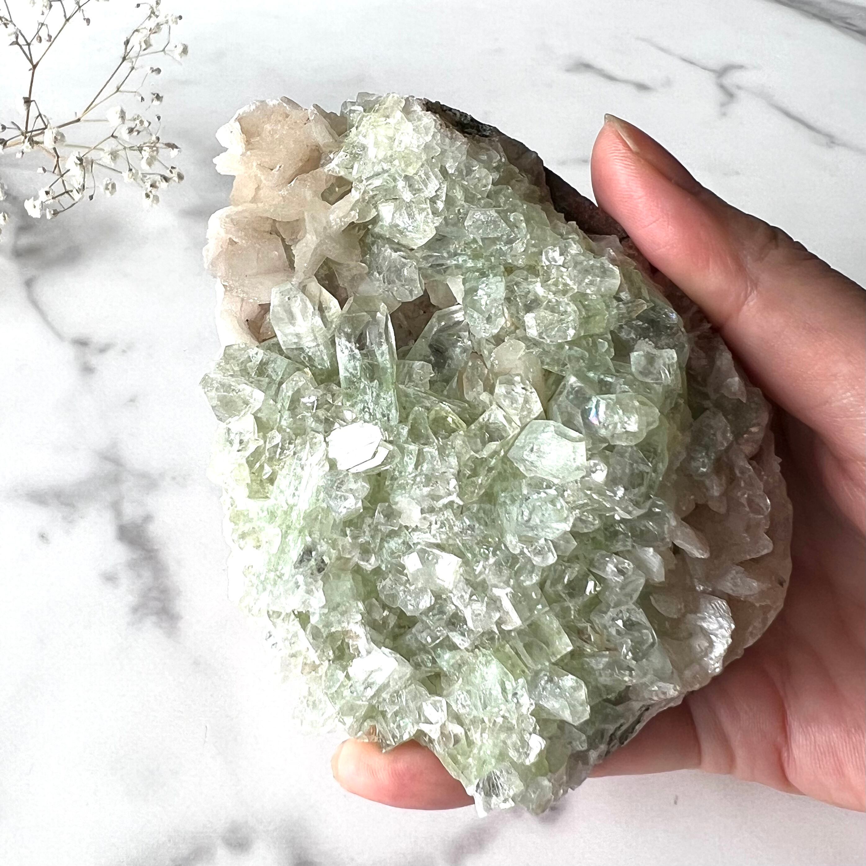 グリーンアポフィライトは強いヒーリング効果を持っていると言われており、忙しい毎日の中で本来の自分の状態を取り戻すのにとても役立つと言われ、瞑想などにもオススメの石です。