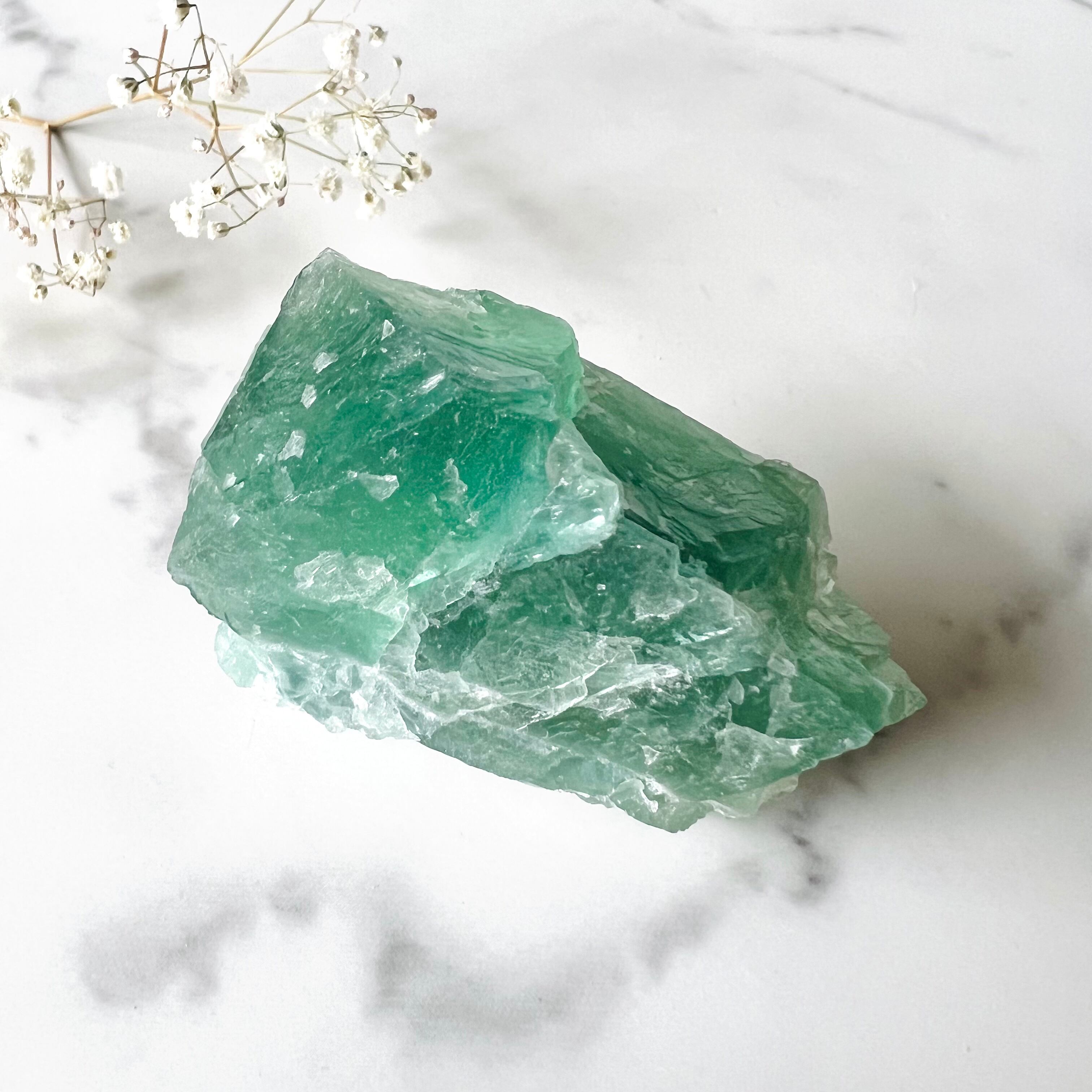 透き通ったグリーンが美しいフローライトのラフカット。透明感がありながらも濃淡のあるグリーンのグラデーションは、まるで美しい湖の底を覗き込んでいるかのようです。