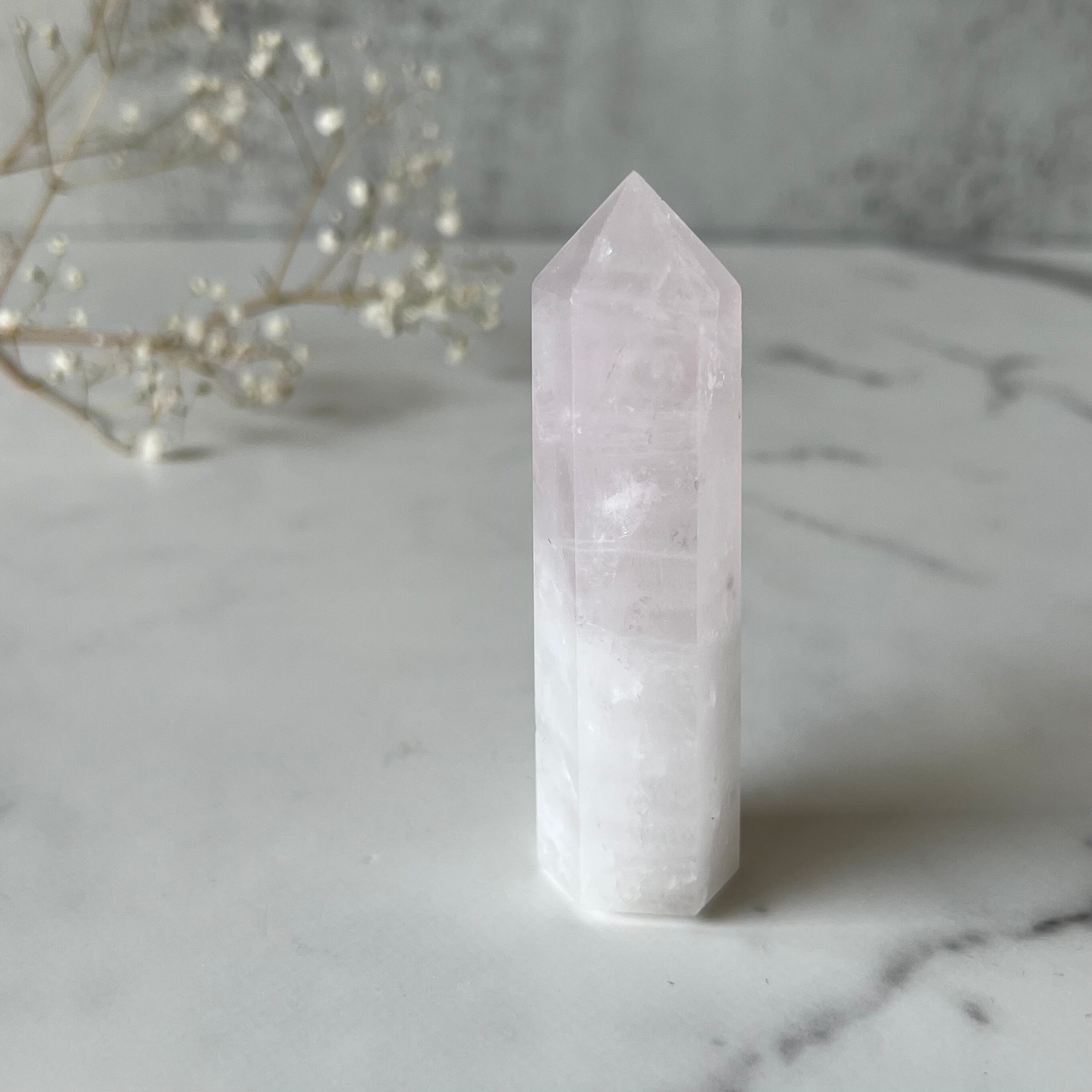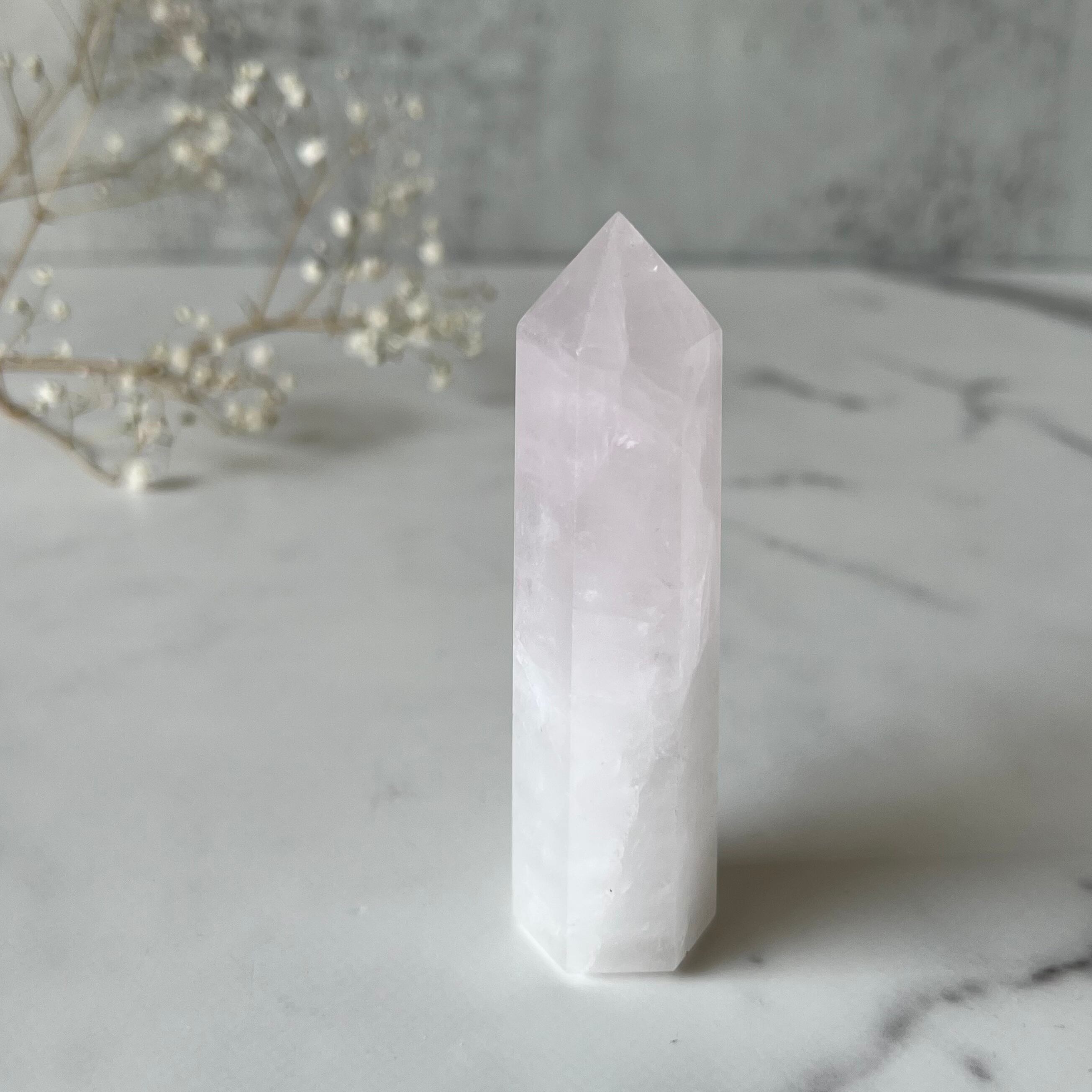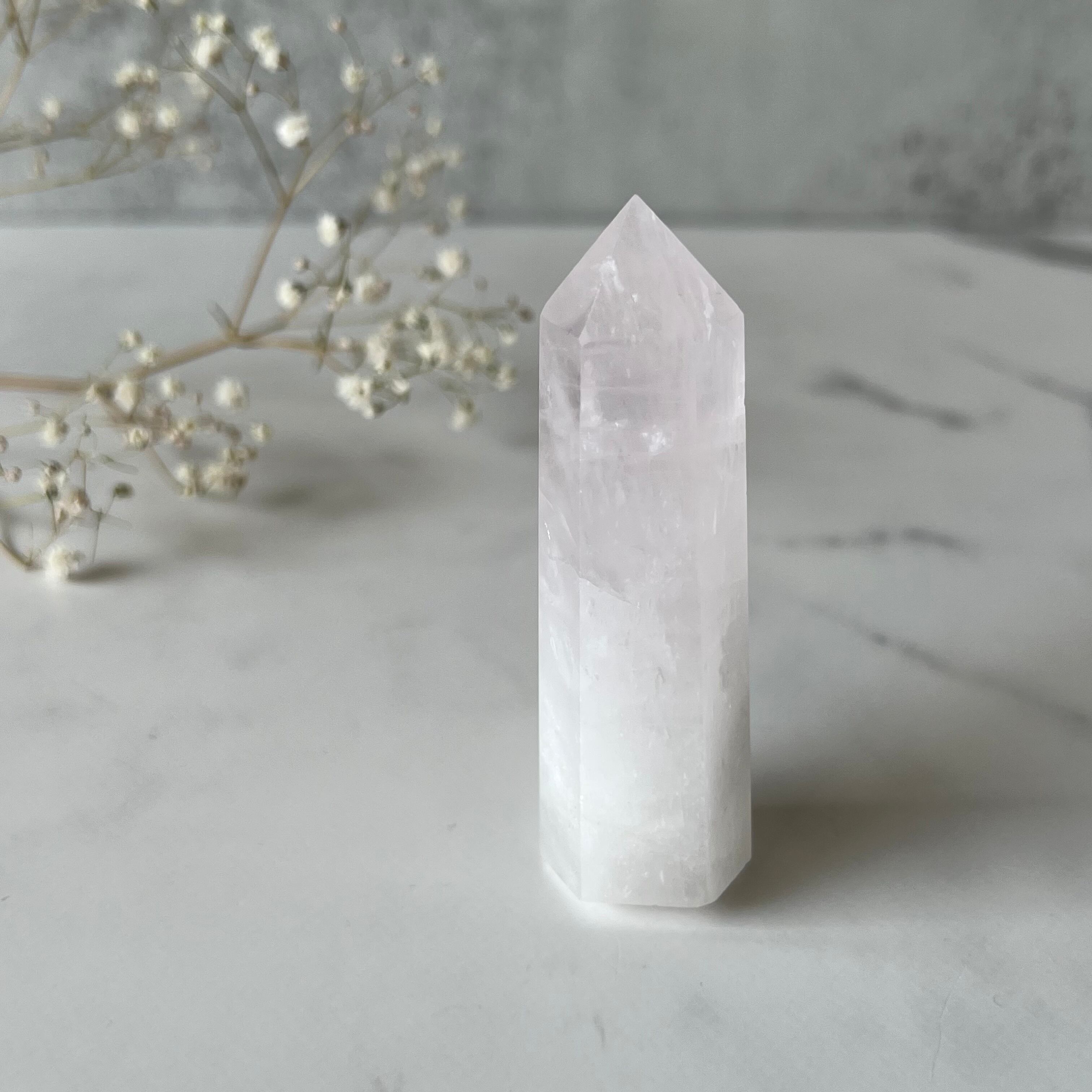 トップは透明感があり、ボトムは白く霧がかっています。遠目に見ると白にも見えるほど、ごくごく淡いピンク色が美しいローズクォーツです。純真無垢な少女のようなあどけなさと儚さをもつピュアな印象のアイテムです。