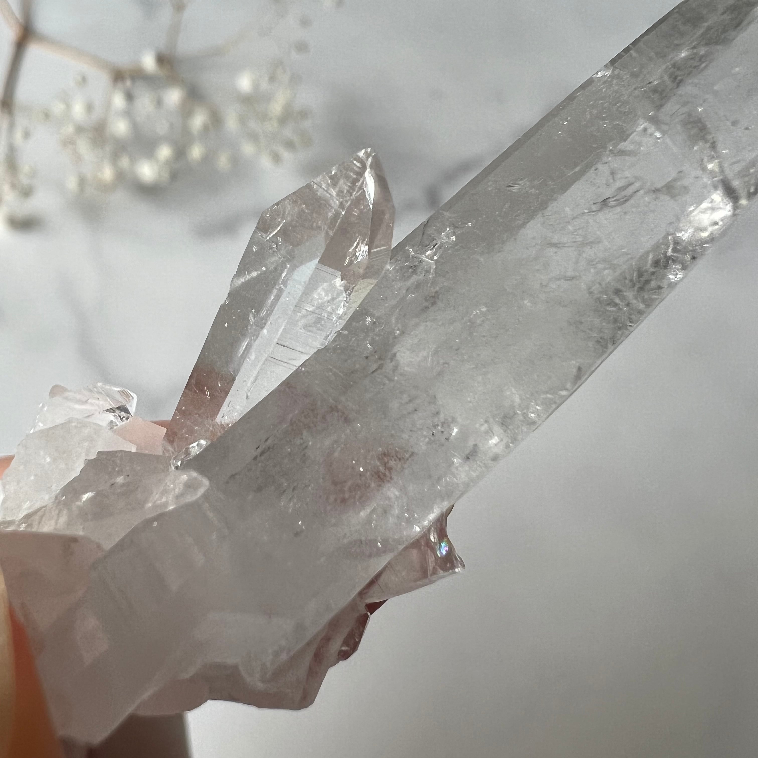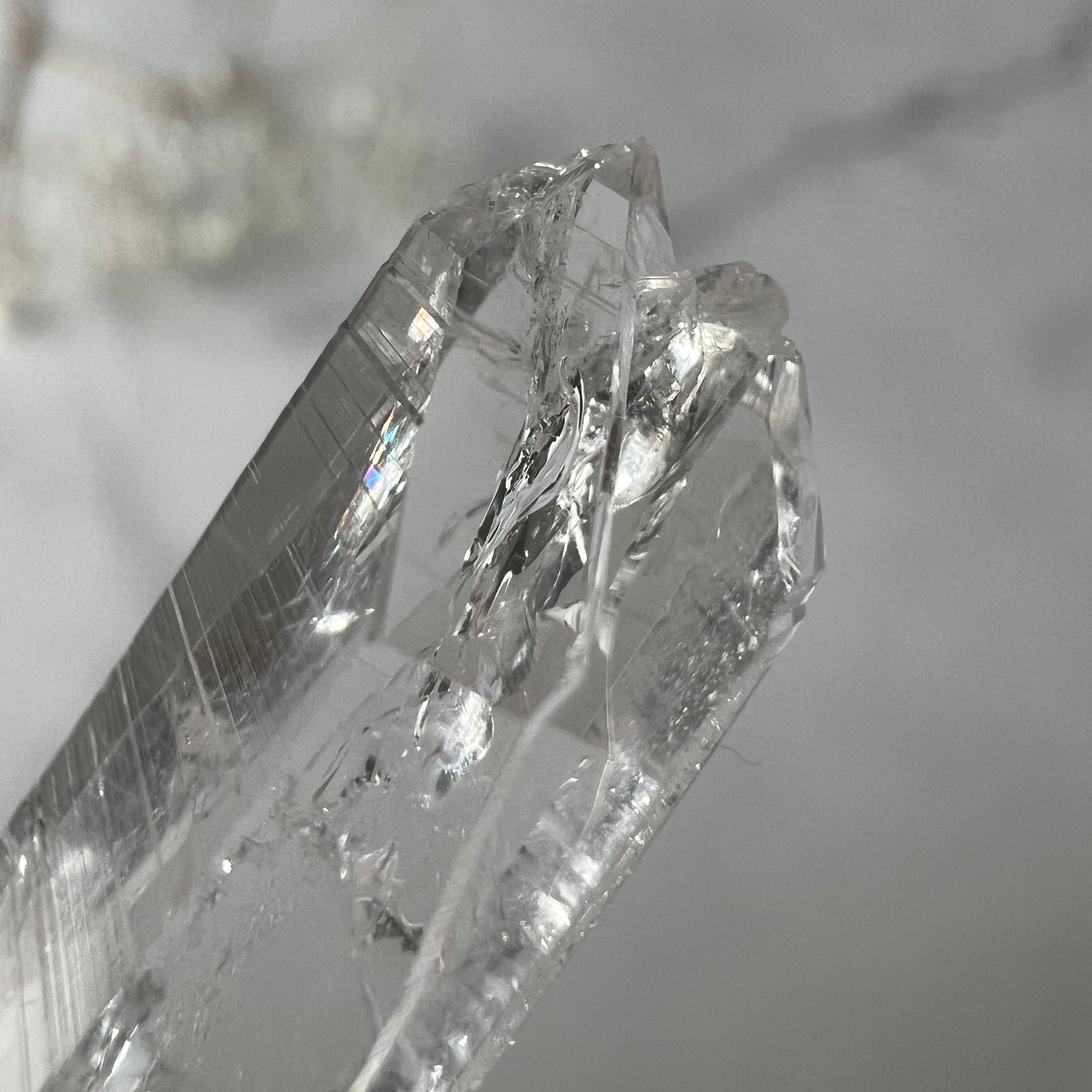 先端はツインになっており、よく見ると二つの先端の間にもうひとつ結晶が挟まっていて、仲良し親子のようです。柱面に刻まれたレムリアンリッジの美しさはいうまでもなく、あちこちに虹を内包したみずみずしいレムリアンです。