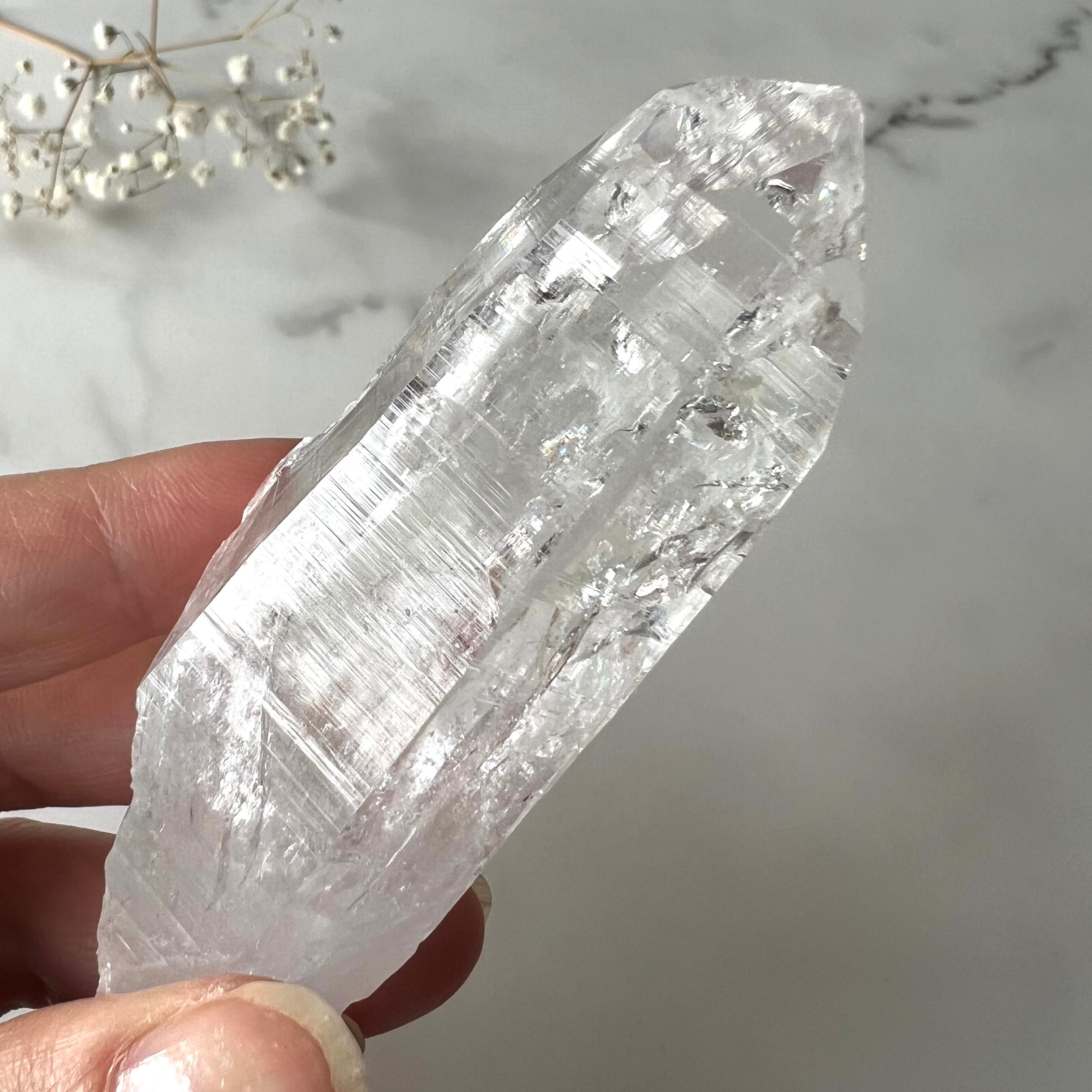 クリアにスッキリと透き通ったクォーツは最高品質の透明度を誇ります。天然のクラックが映し出す清らかで美しい無数の虹たち、柱面に刻まれたレムリアンリッジ。また滑らかで握りやすい石肌はひんやりと心地よく、神秘のメッセージを心の奥底にそっと届けてくれます。