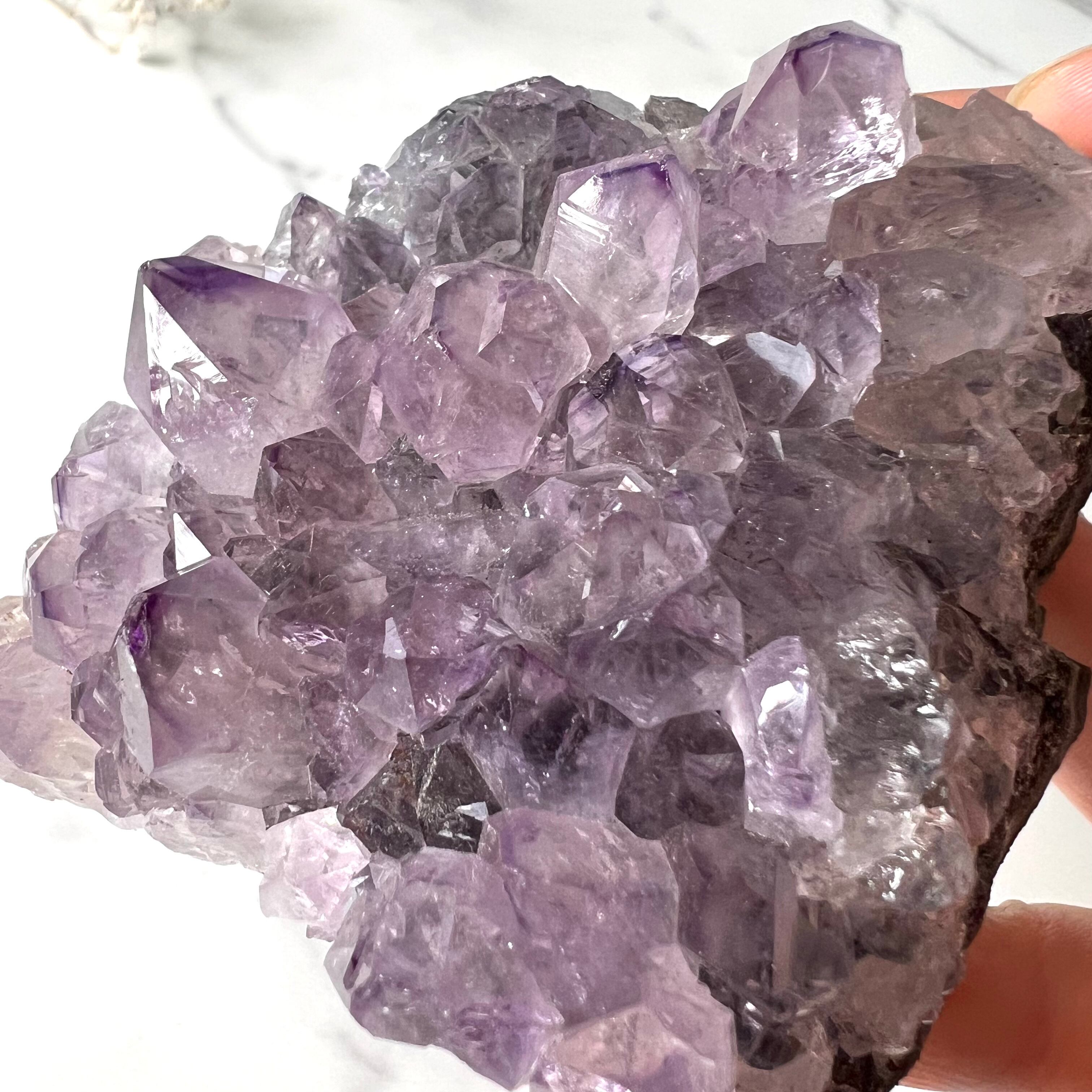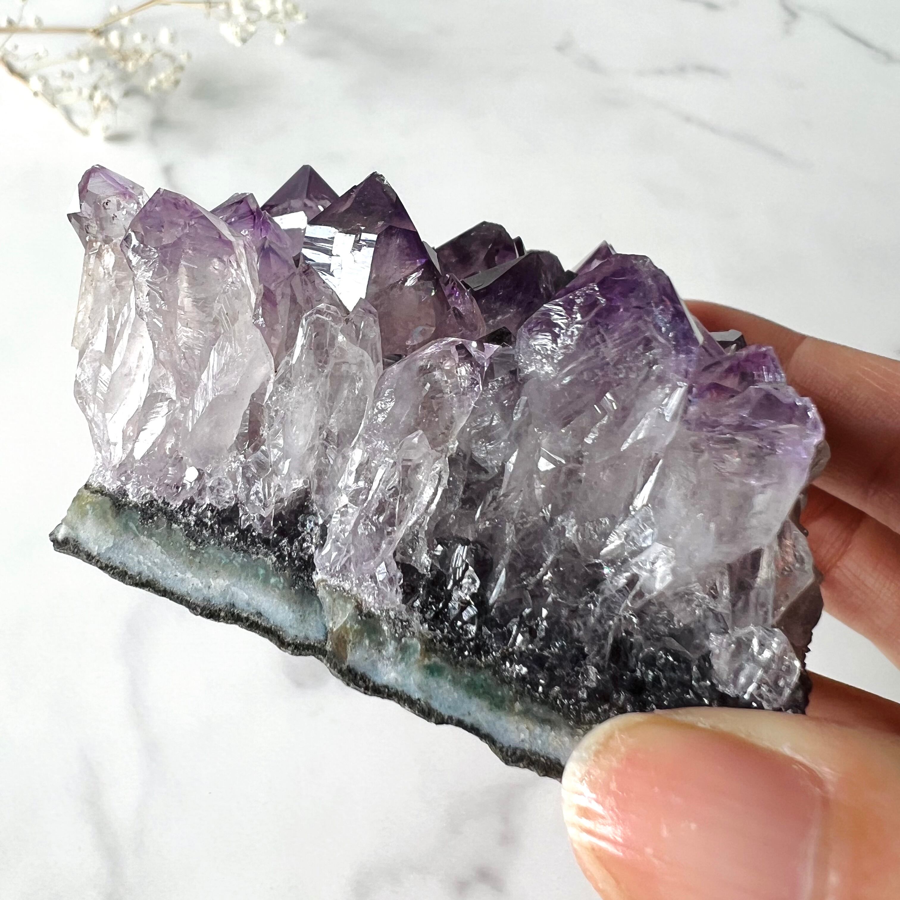 色合いはやや青みがかった淡いパープル。結晶のひとつひとつが透き通っていてとても美しいです。シックで艶っぽいアメジスト。ところどころに虹も楽しめます。