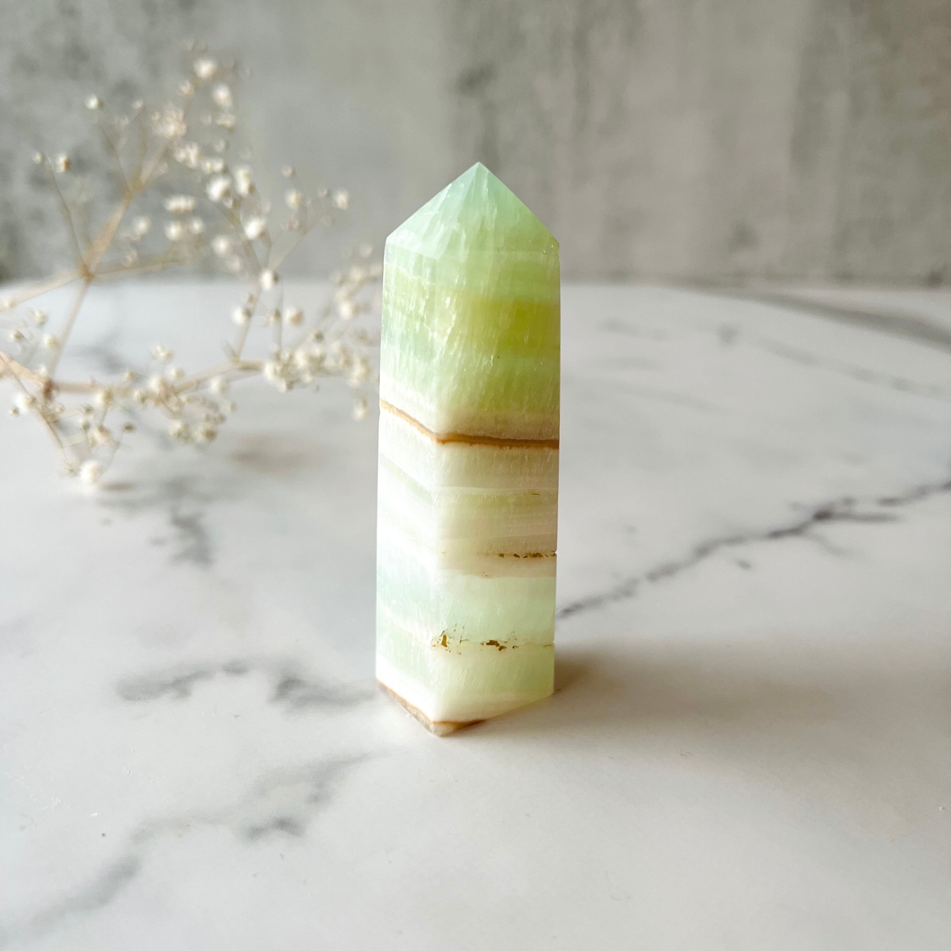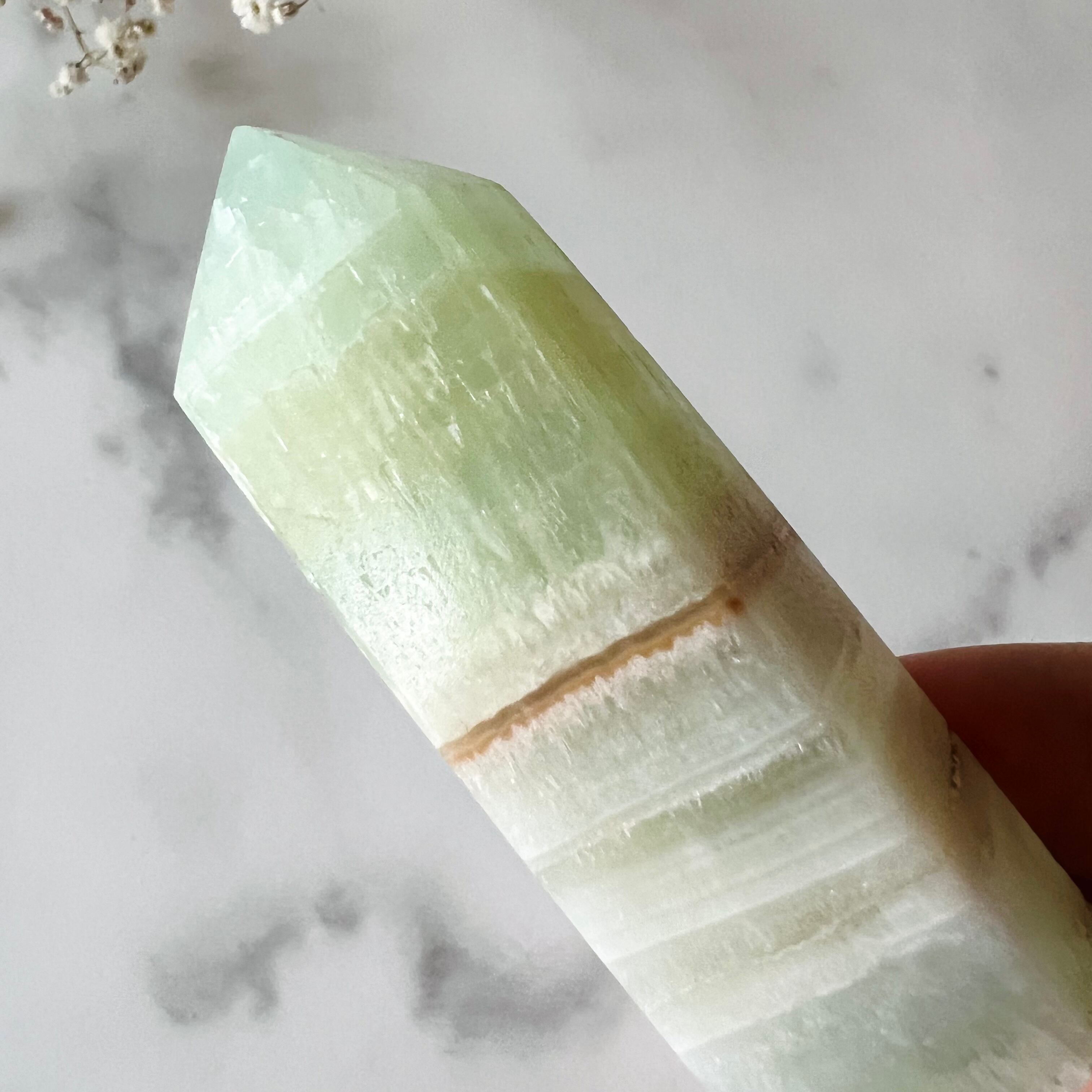 淡く透け感のあるグリーンがとても綺麗なグリーンカルサイト。光を含んでキラキラと輝きます。白、ブラウンの層が重なり合ったウエハースのような断面もかわいいです。カルサイトは波動が穏やかで、気づかないほどに優しく心身に癒しを与えてくれます。