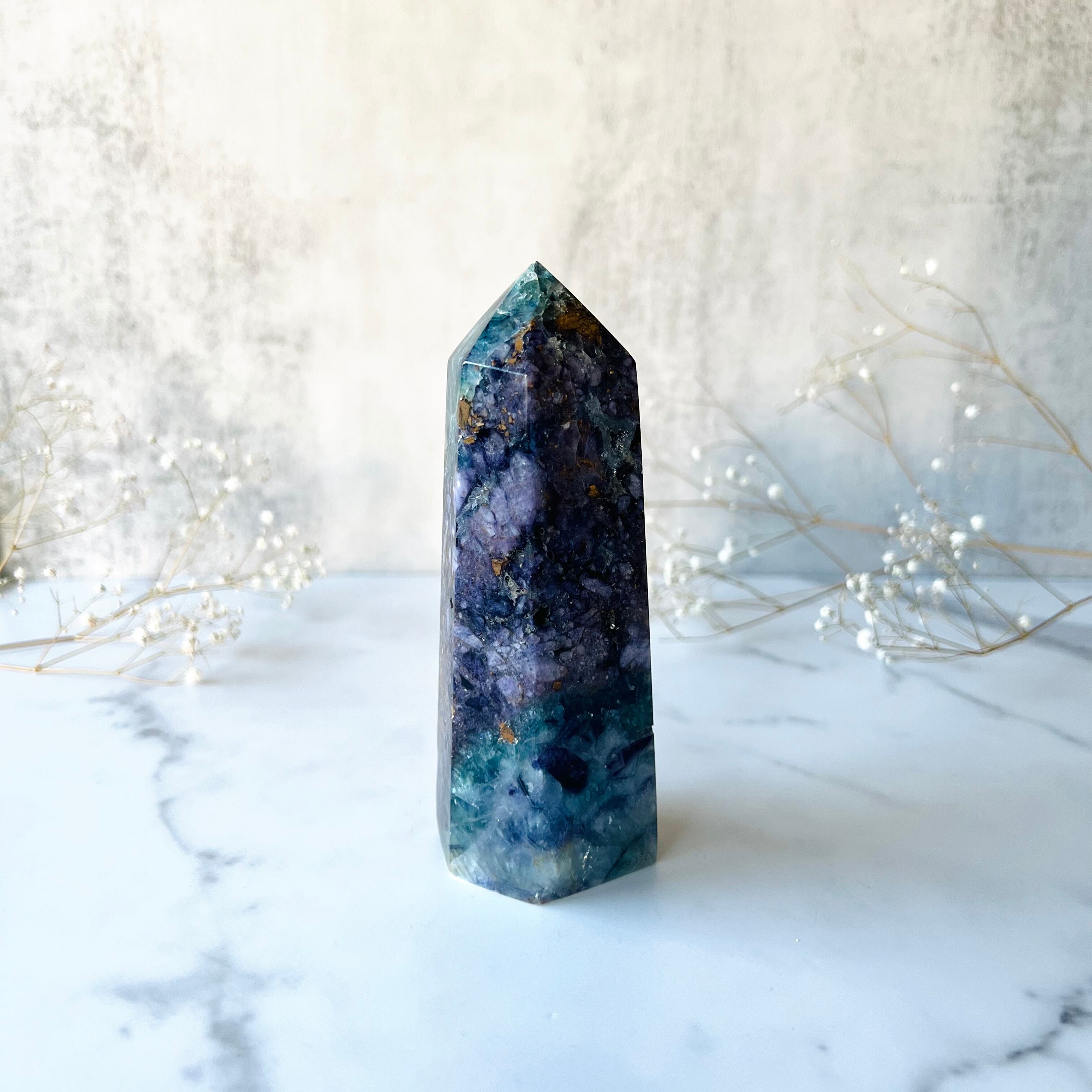 まるで美術館に飾られたアート作品のように美しいフローライトタワー。繊細で複雑な色合いはロマンチックで奥深く、想像を掻き立てられます。紫色の靄の上に、イエローゴールドの絵の具を飛び散らせたような模様がモダンでおしゃれです。