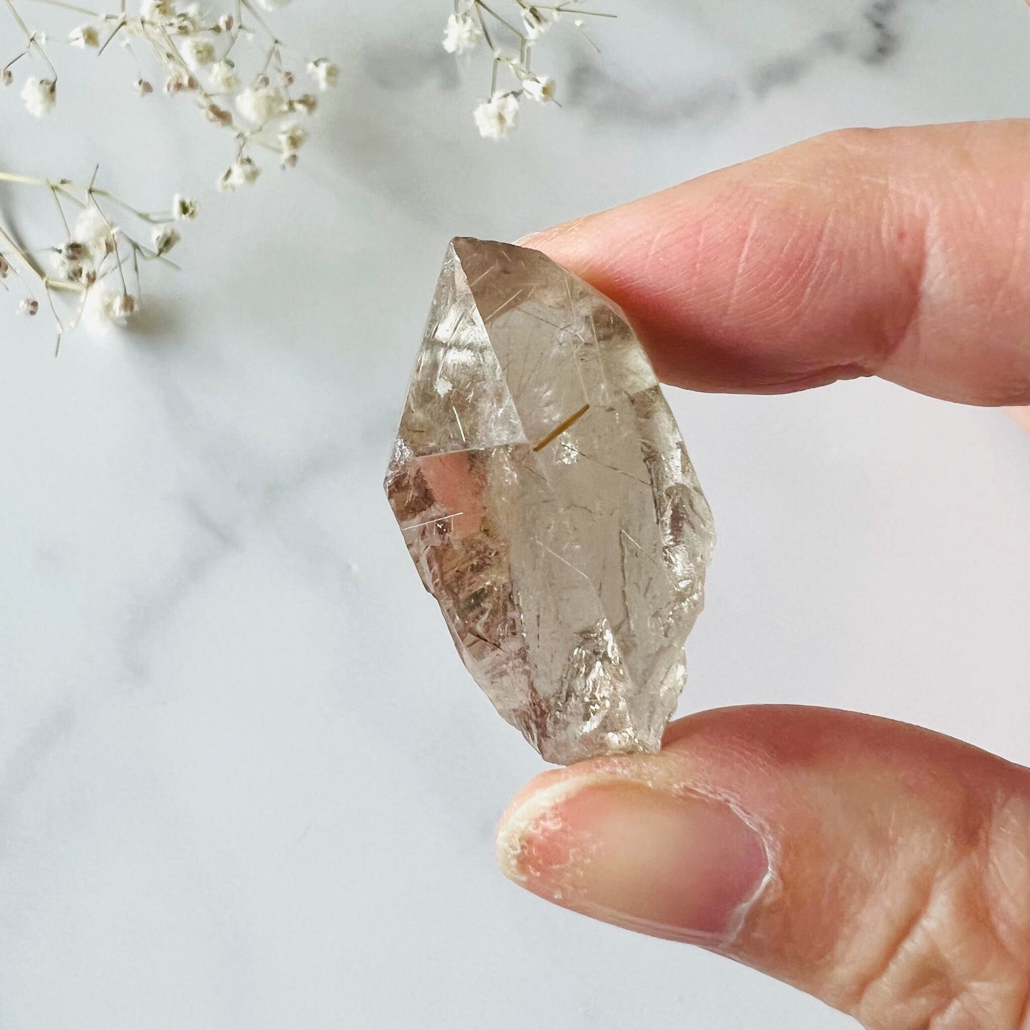 透明度の高いクォーツが光を通すとしっとりと美しく、内包しているルチルをじっくり観察することができます。控えめで落ち着いた色合いは心にそっと寄り添ってくれるような穏やかな波動を送ってくれます。