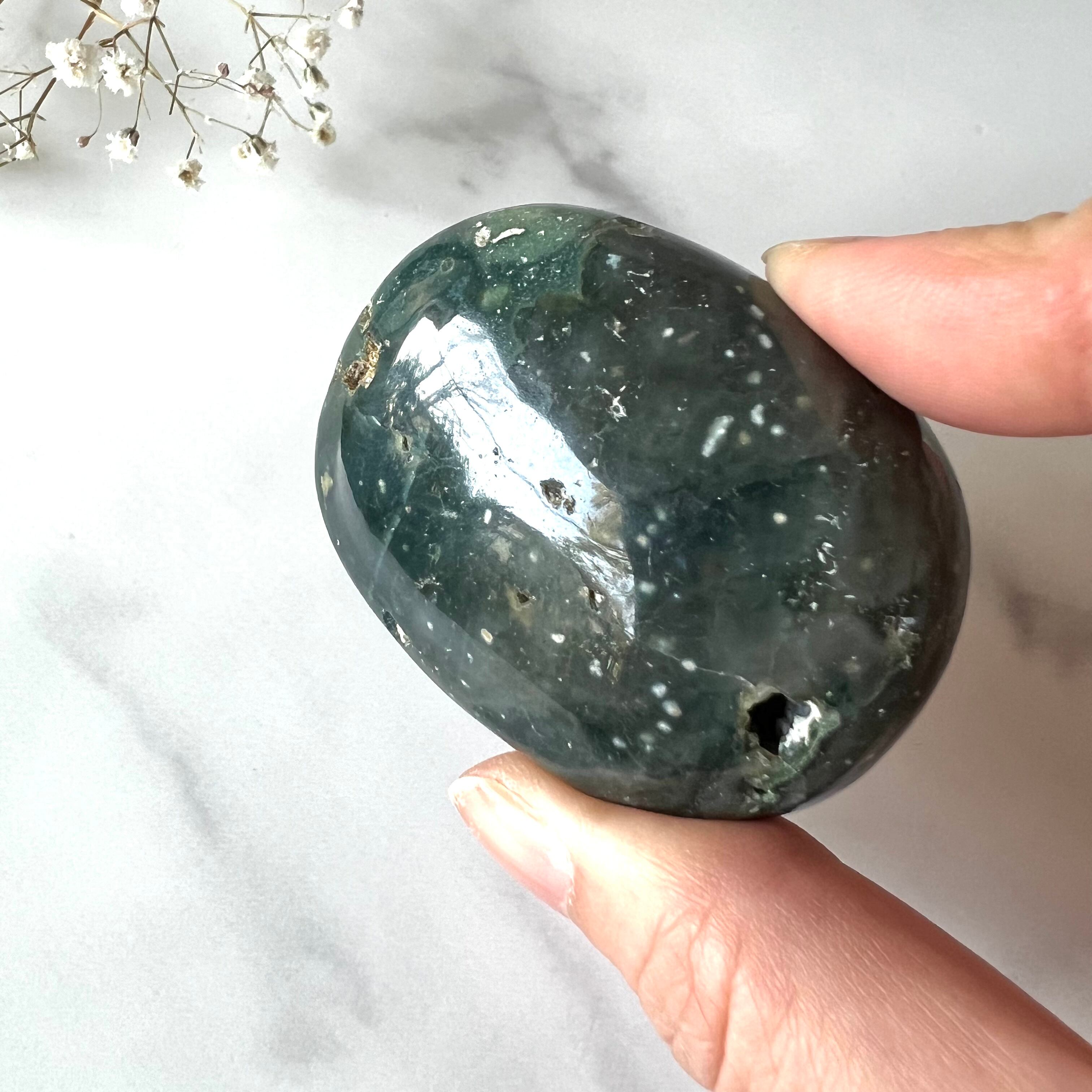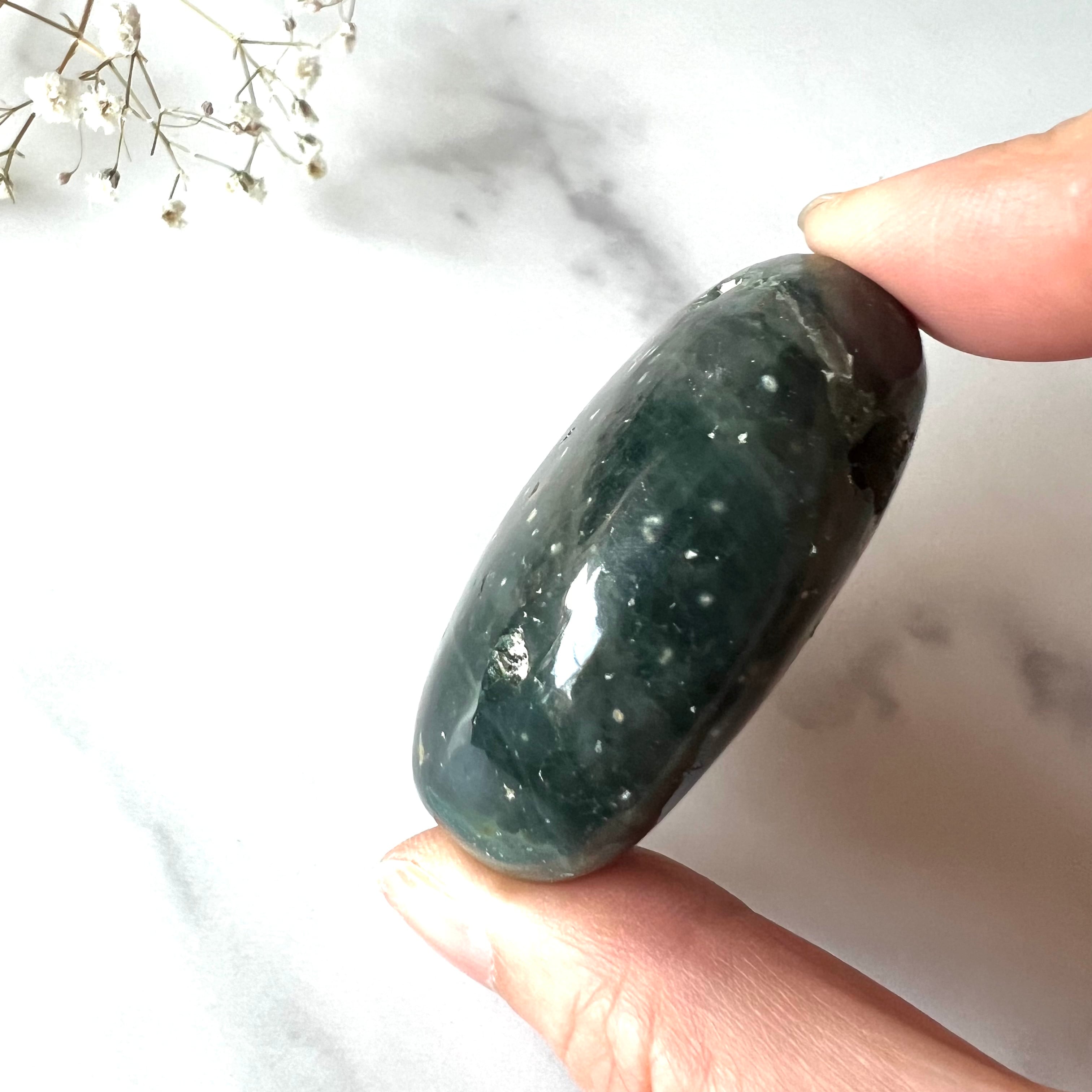 深いグリーンの優しい色合いが魅力的なオーシャンジャスパーのパームストーンです。