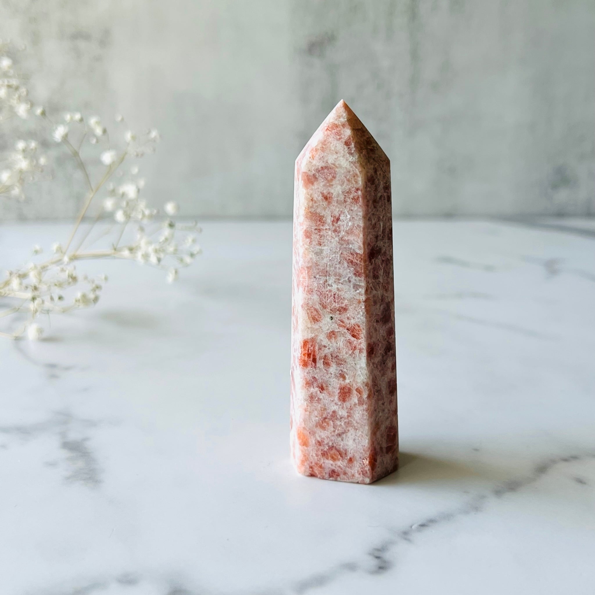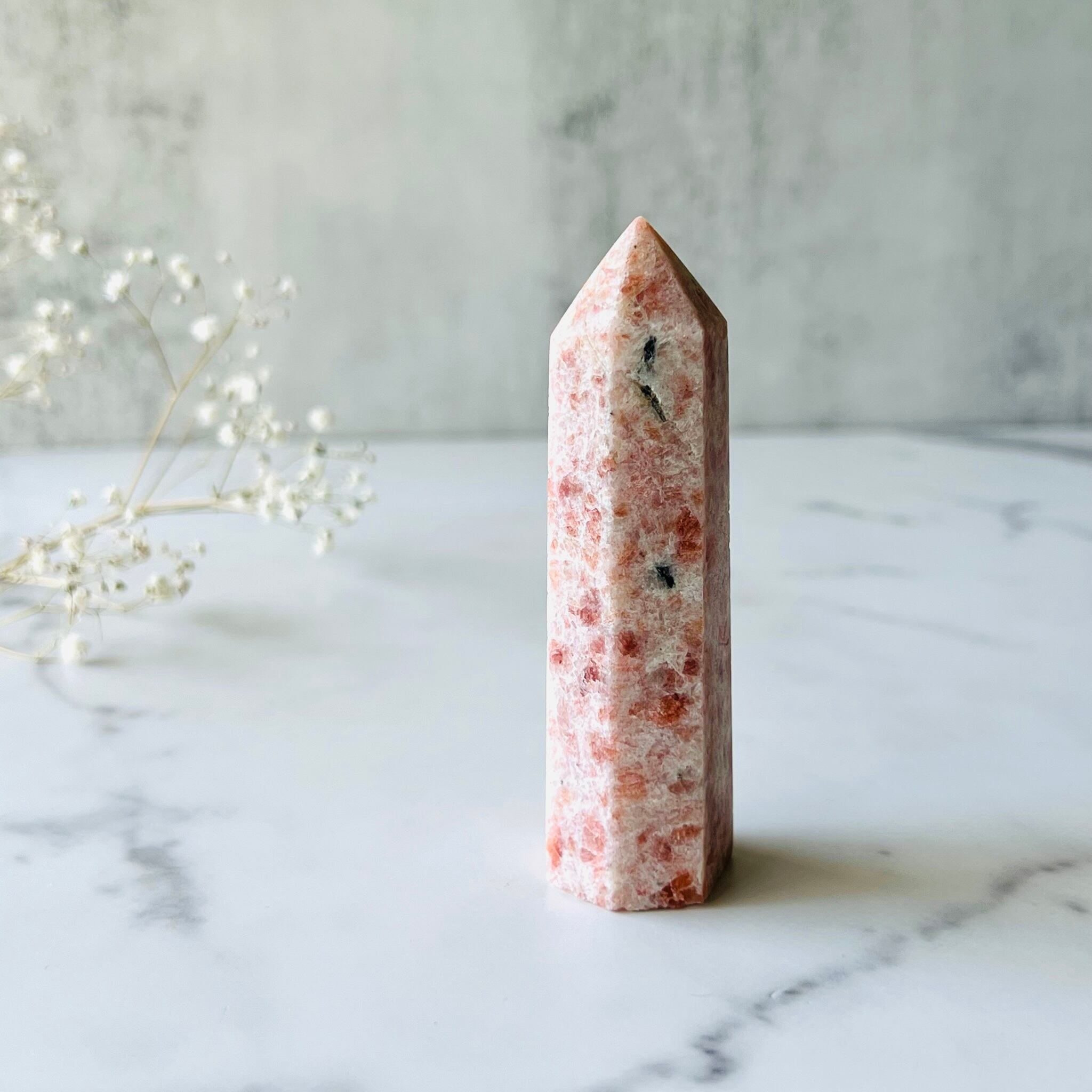 太陽の石と言われるように、鮮やかなオレンジにホワイトが混ざり合い、優しい雰囲気のゴールデンサンストーンです。光にかざすとキラキラ光ってとても綺麗です。インテリアとして飾ればお部屋を明るくしてくれそうです。