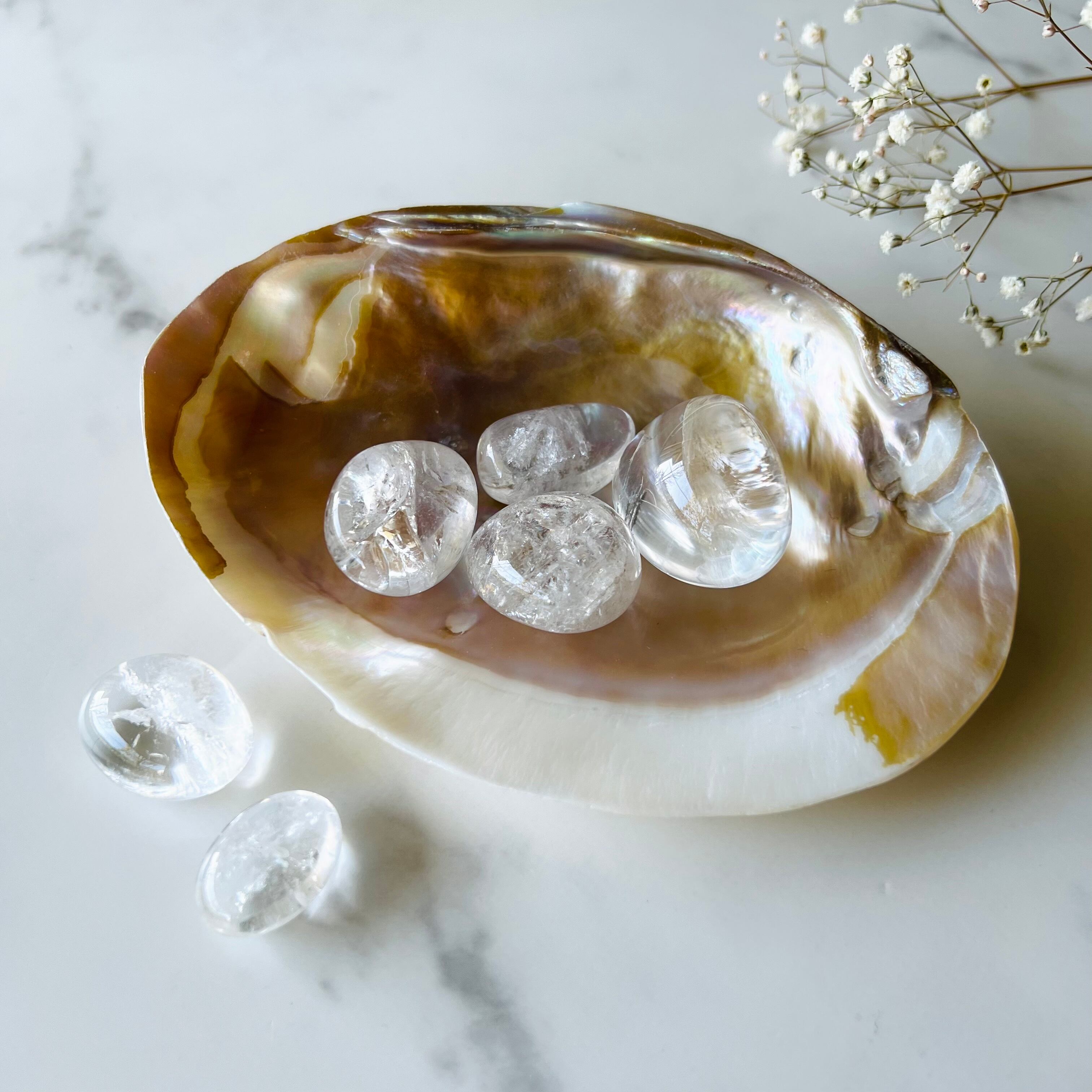 アクセサリーの浄化にぴったりのお洒落なトレイです。上品で美しいパールシェルに、みずみずしい虹入り水晶の洗練されたセットは、お部屋のインテリアや特別な人への贈り物にぴったりです。