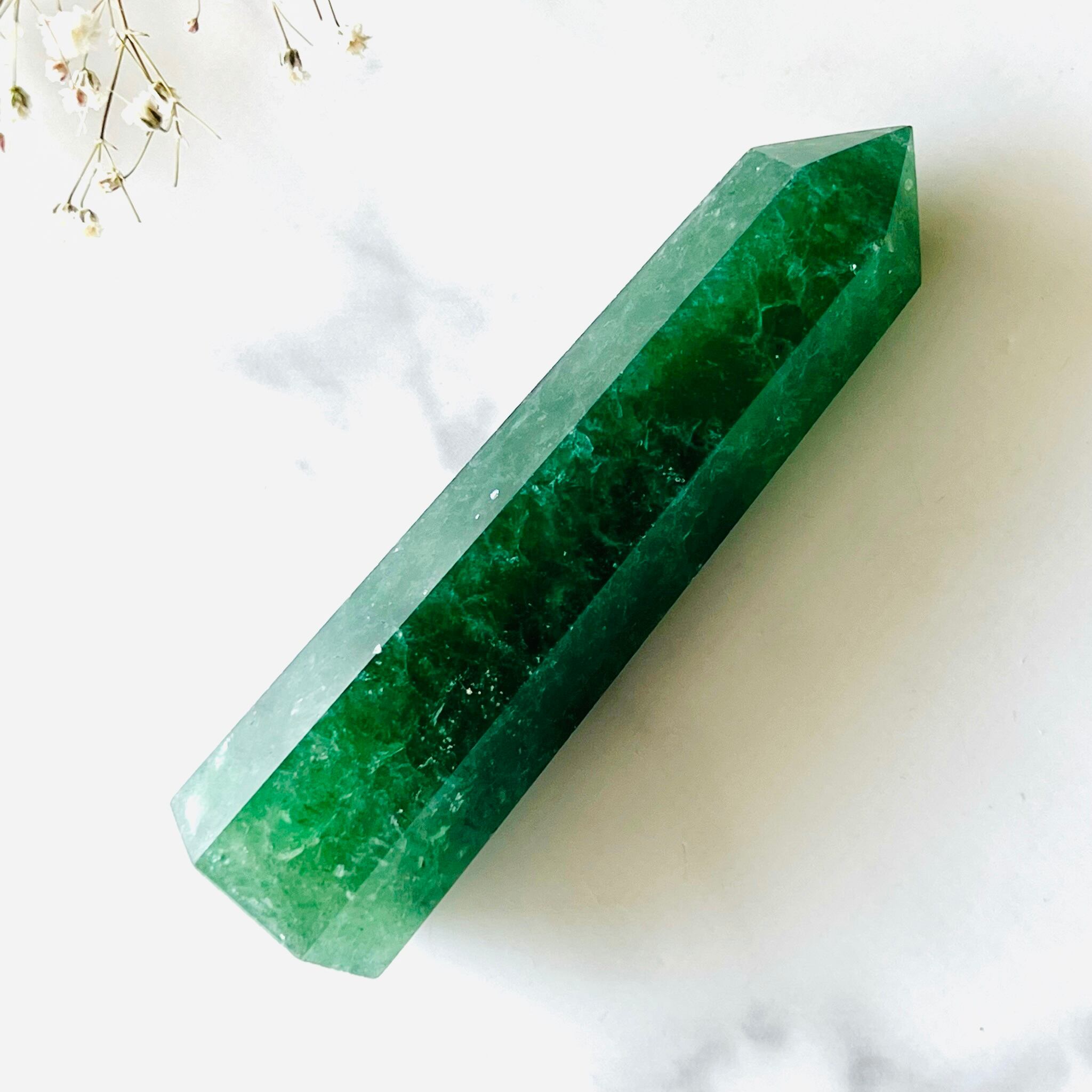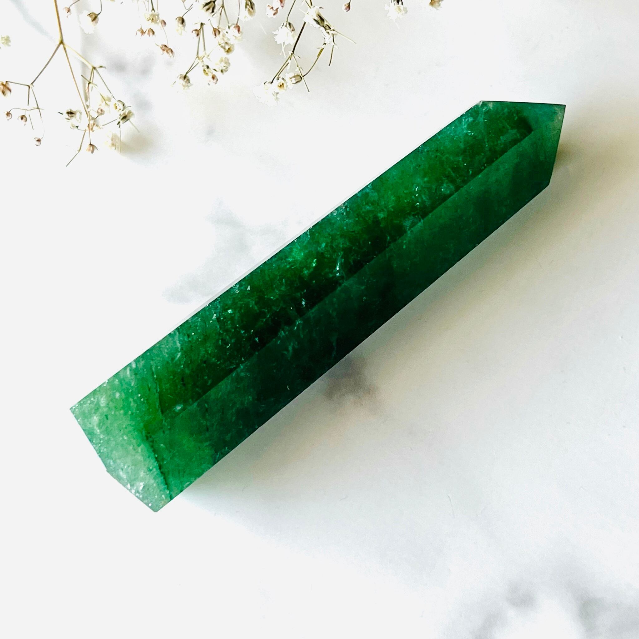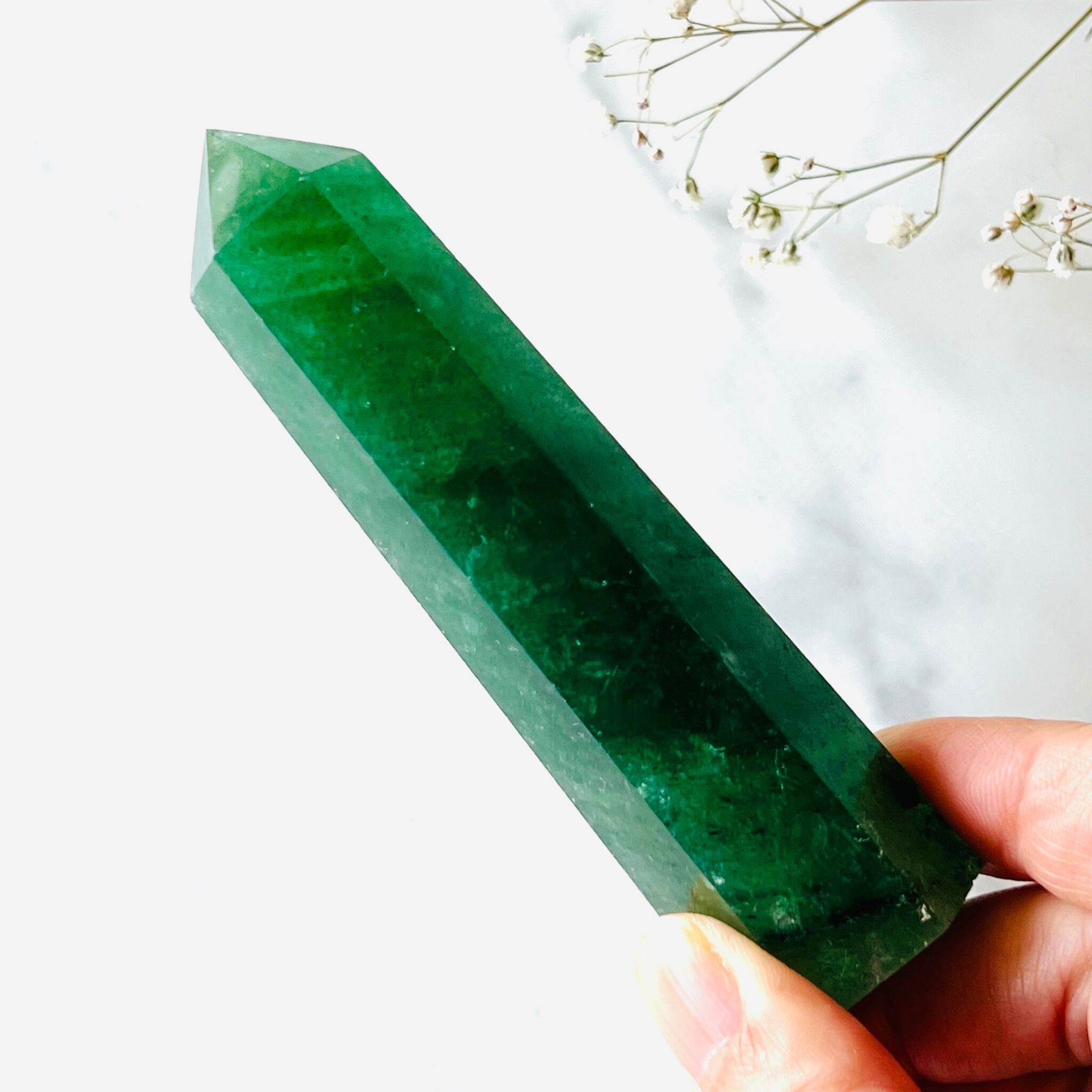 グリーンの発色が綺麗なグリーンストロベリークォーツのタワーです。光にかざすとマイカの煌めきと、小さな多数の虹たち、内包物の美しい模様が浮かび上がってきます。「モテ」の石として大変人気があるパワーストーン。ストロベリークォーツの効果に加えて、グリーンは人間関係を穏やかにしてくれる効果もあると言われています。