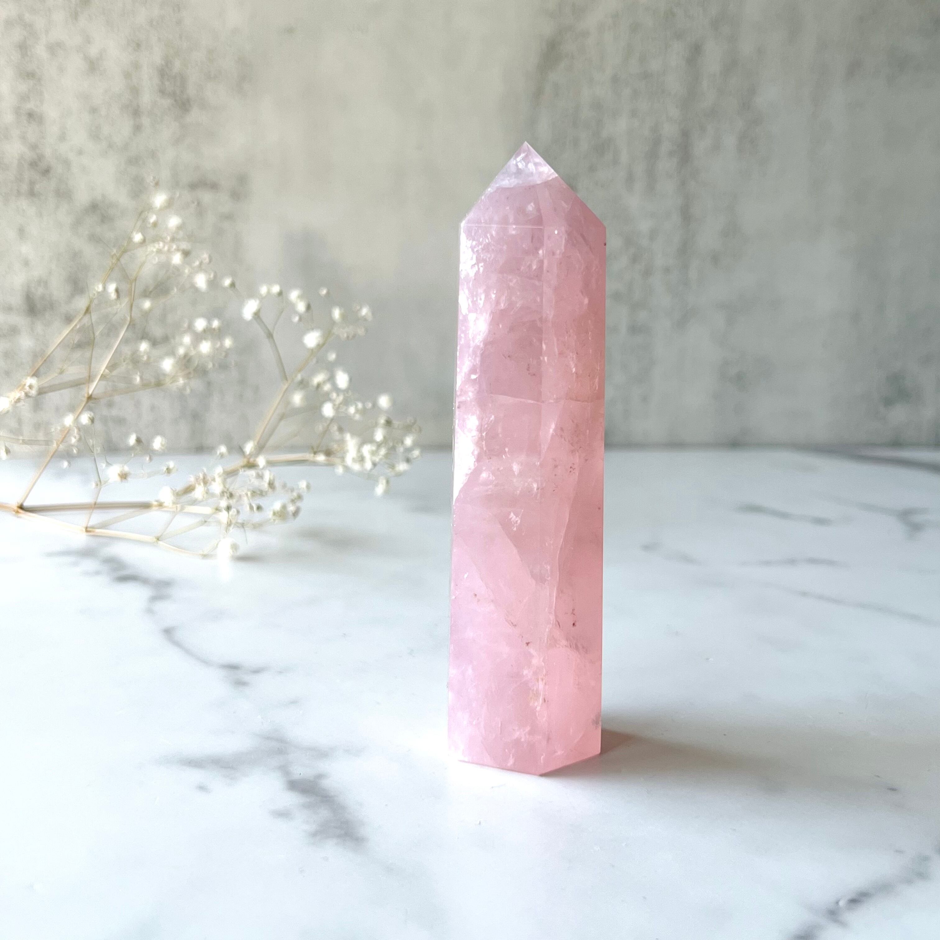 背の高いすっきりしたフォルムのローズクォーツタワーです。