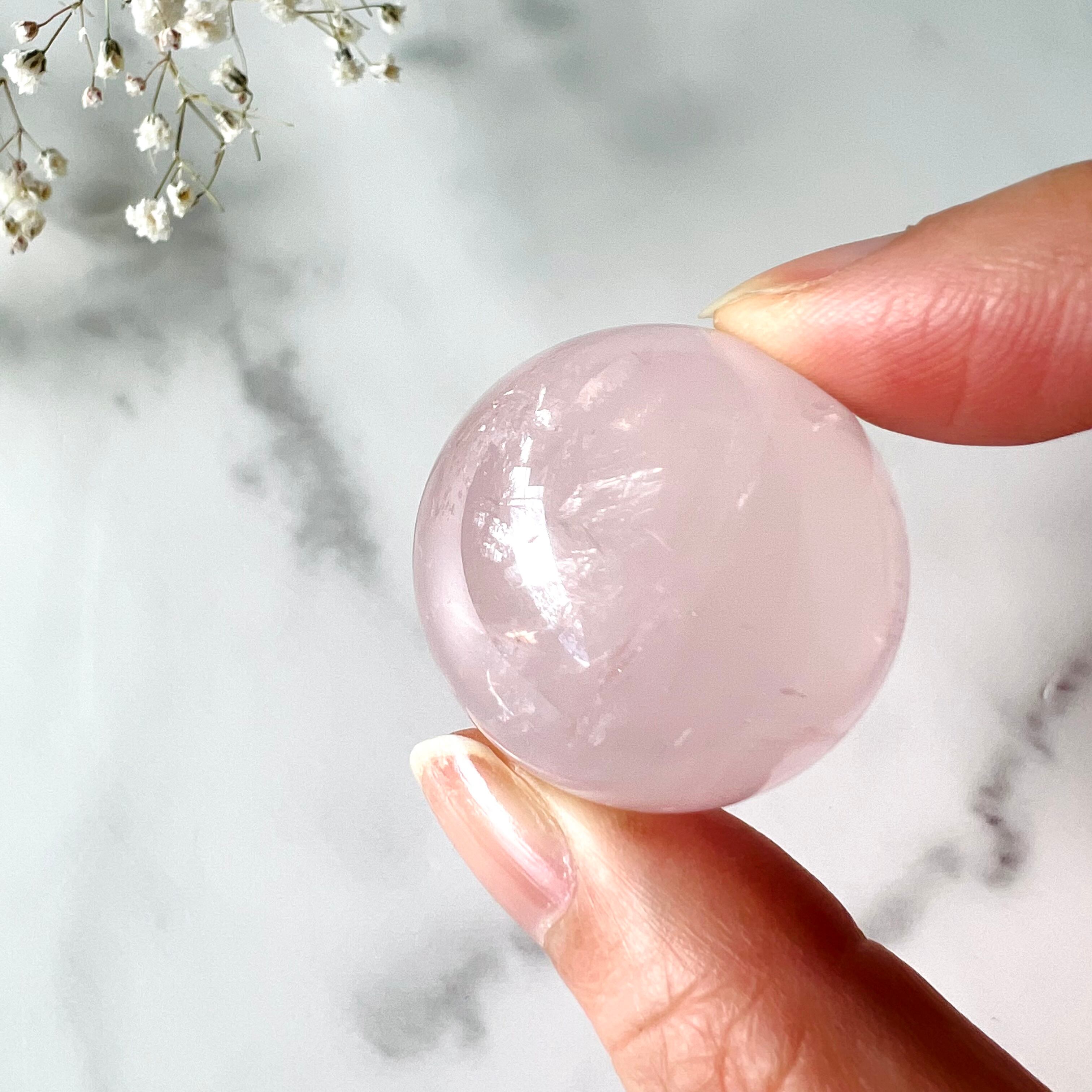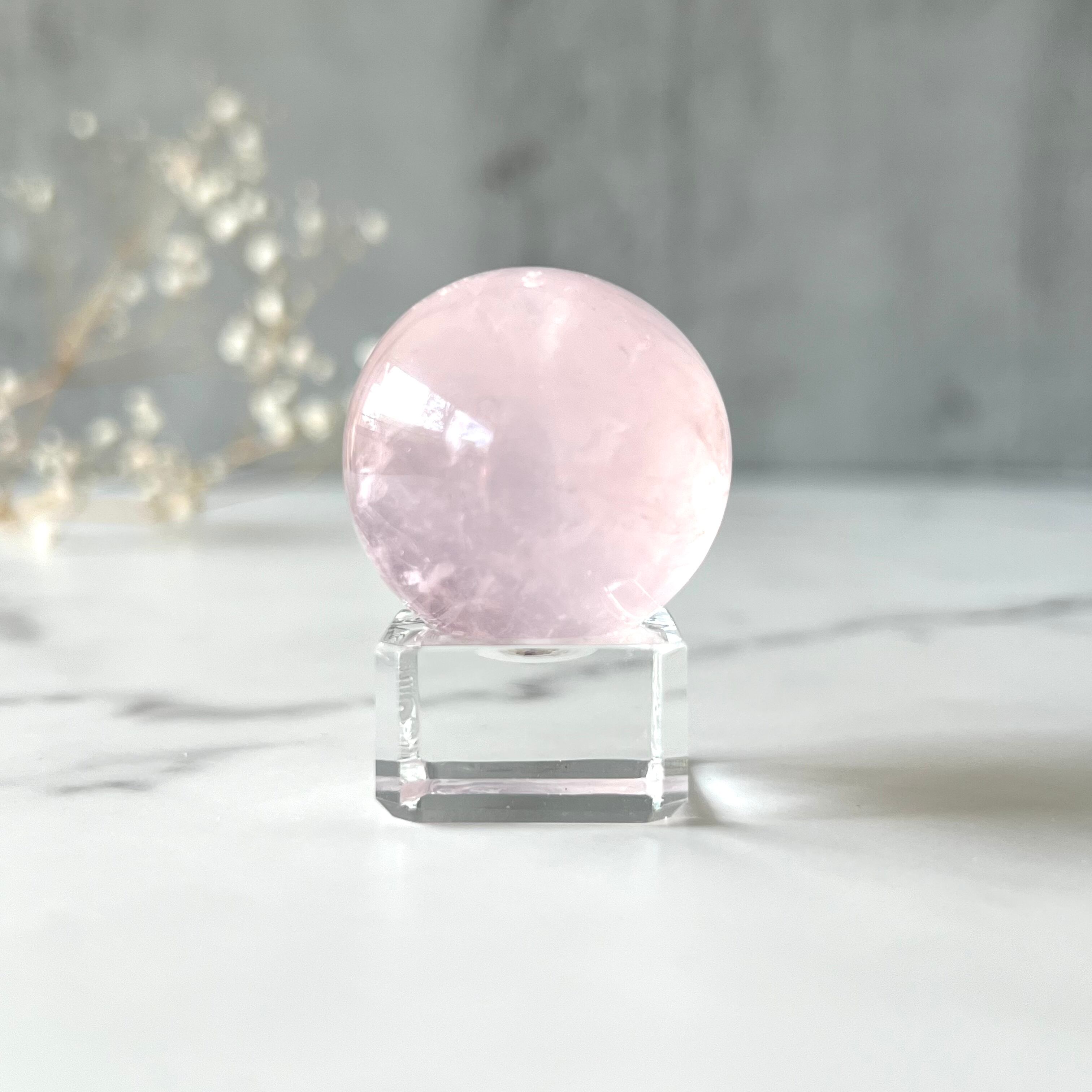 桜の花びらのようにごく淡いほんのりピンクとみずみずしい透明感が可愛いローズクォーツスフィアです。春を感じさせるピュアで可憐なピンク色。虹も楽しめます。