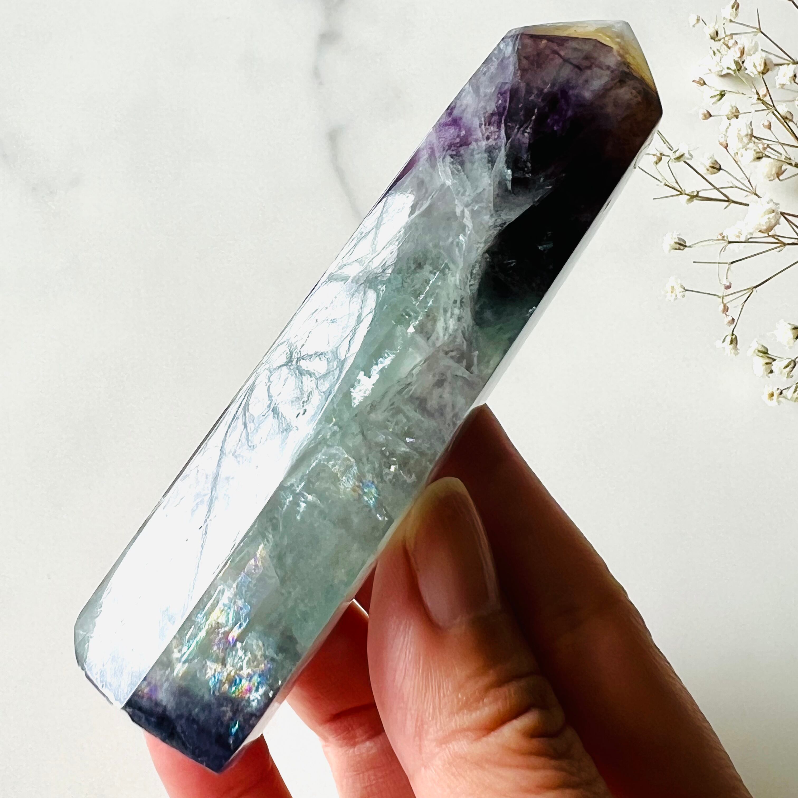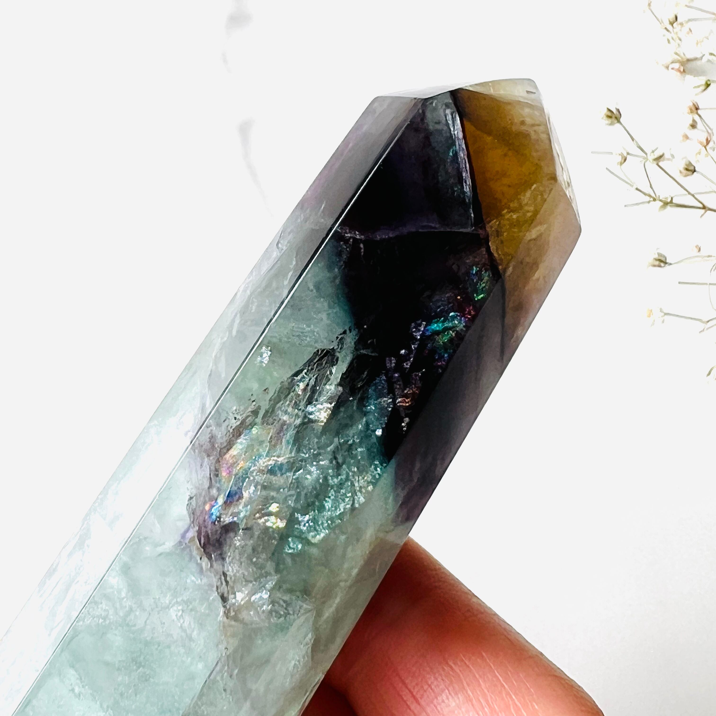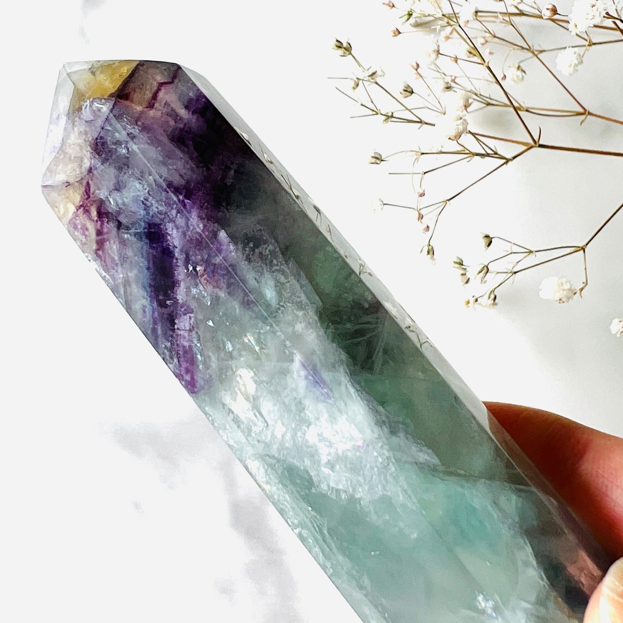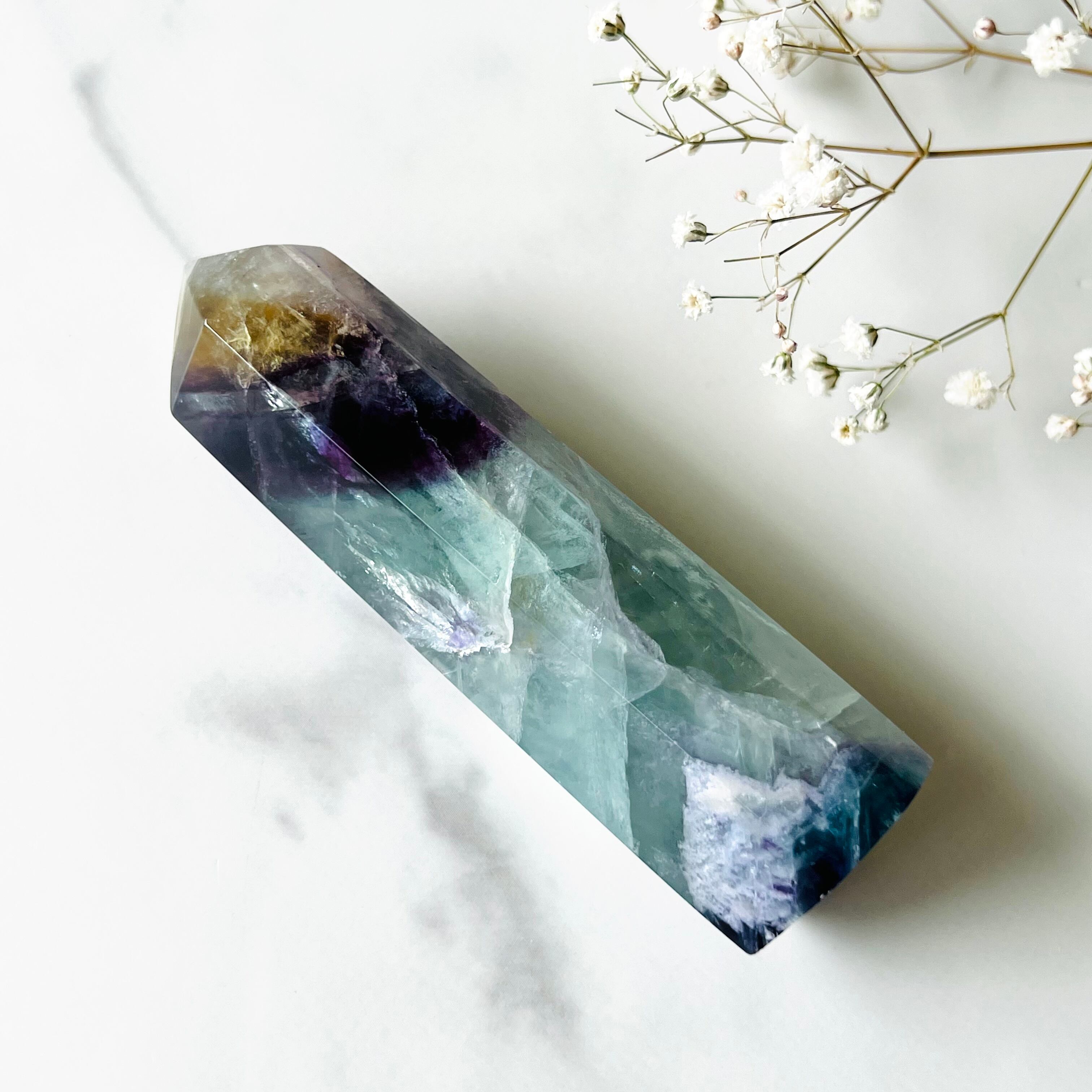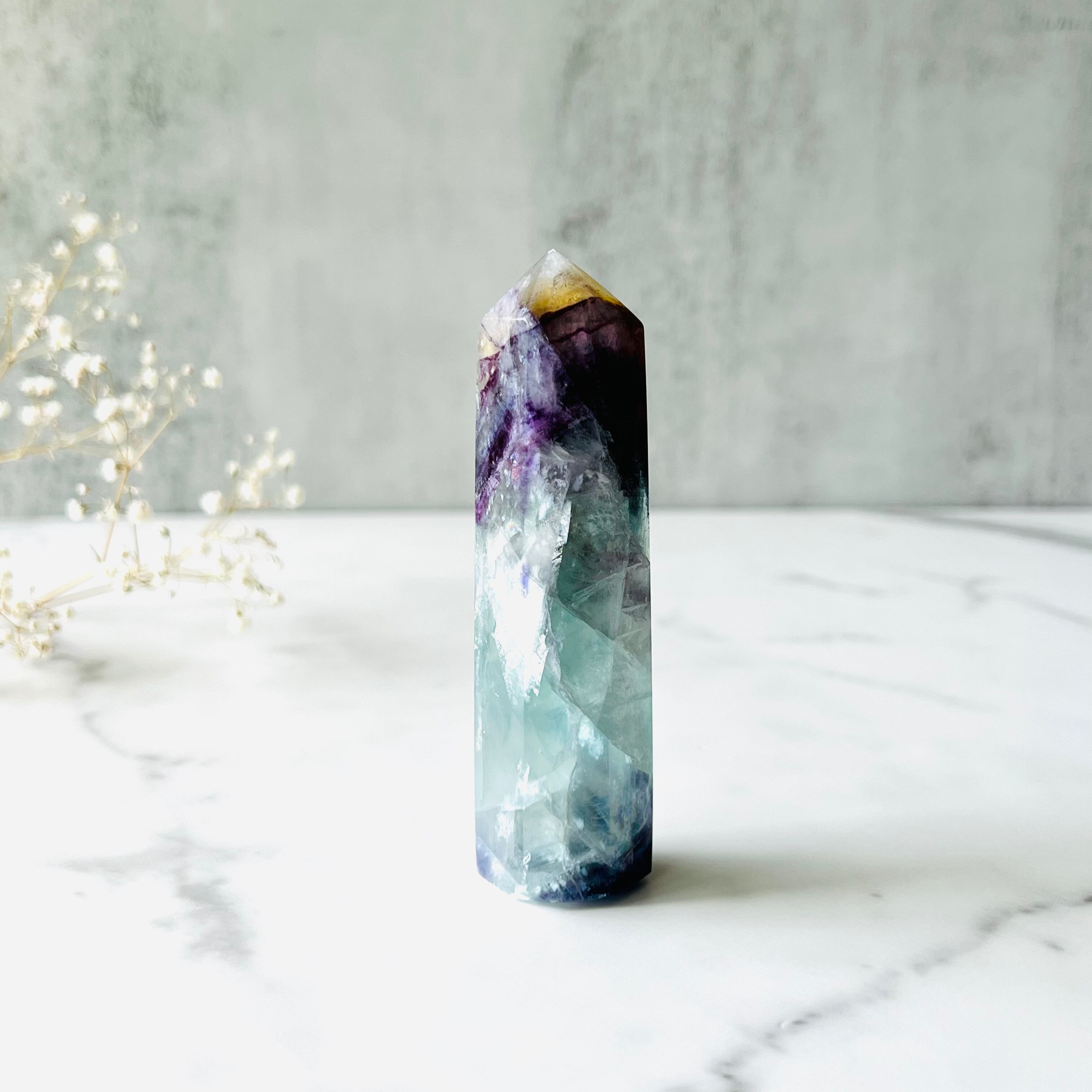 碧く透き通ったボディにシャイニーな輝きが綺麗なフローライトタワーです。