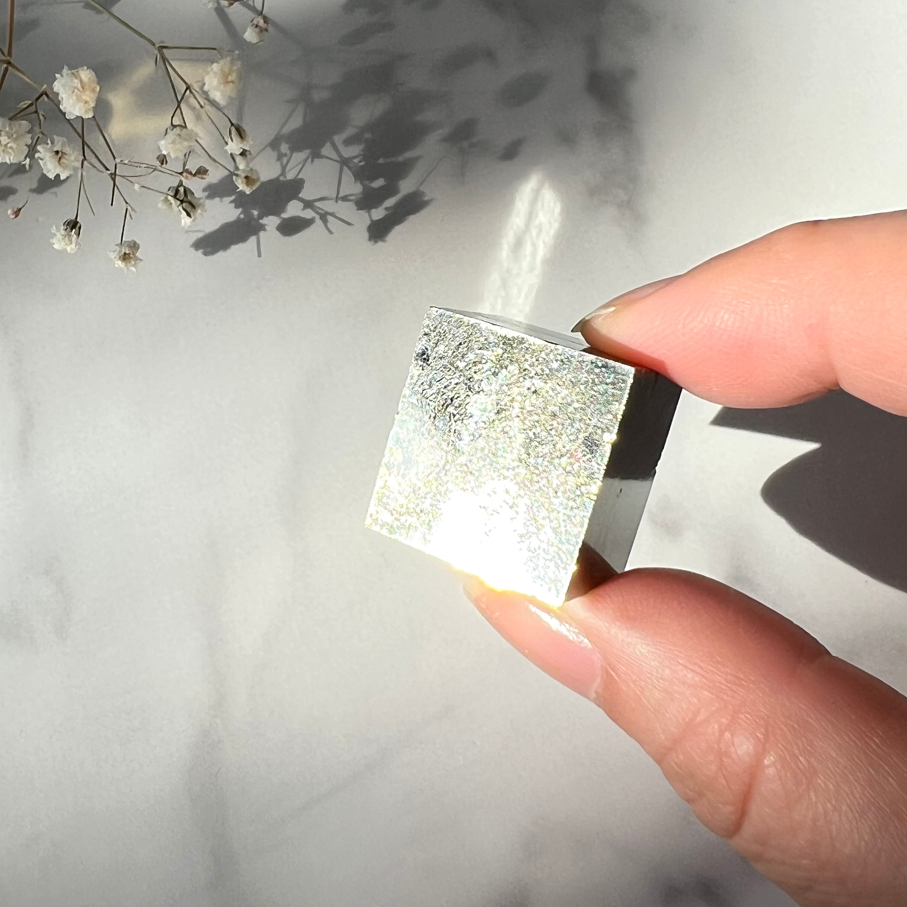 火山活動によって生成されたパイライトのスクエアキューブ。この小さなキューブから上昇のエネルギーが溢れ出してくるかのようにパワフルです。