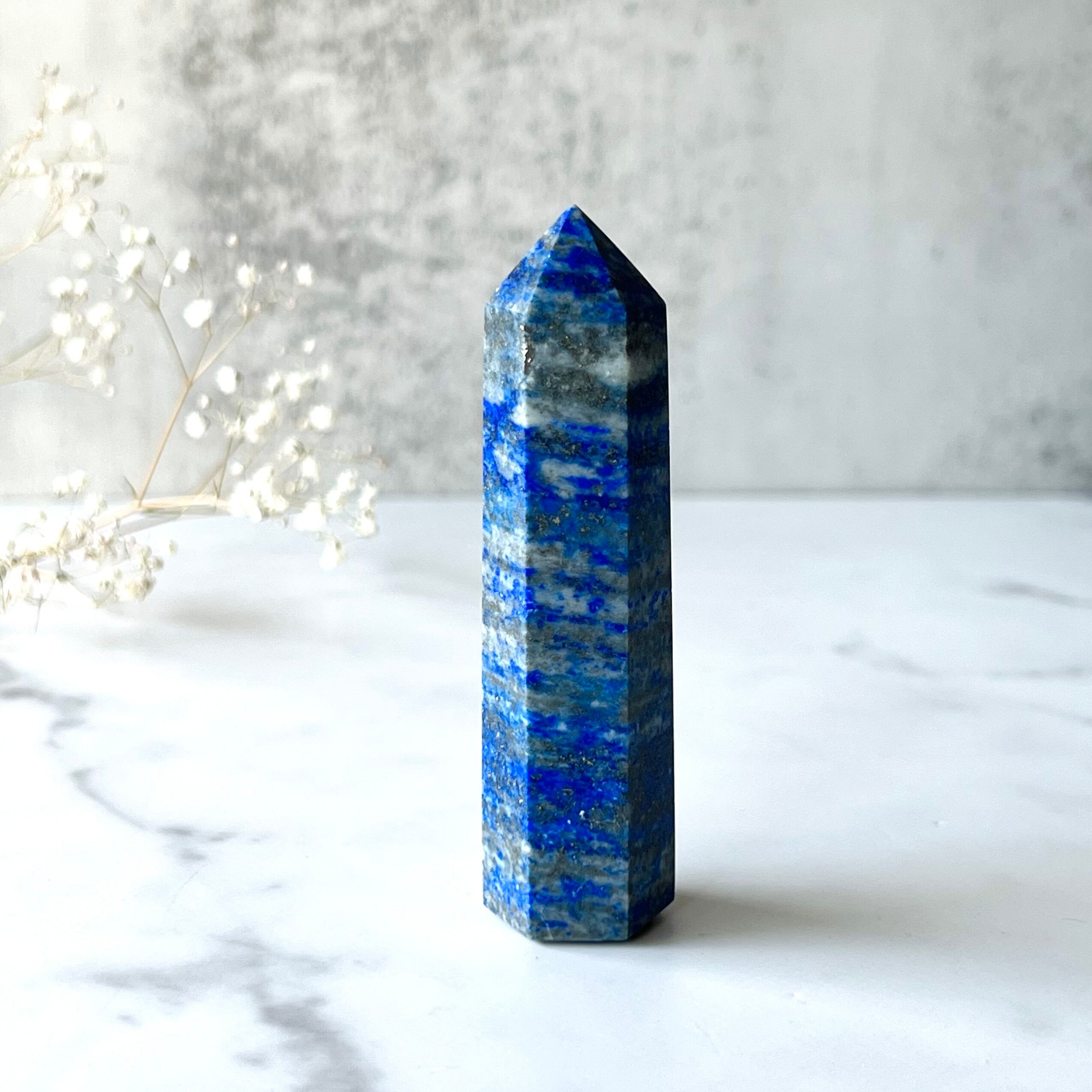 美しい群青色に、幾多の金色の粒子(パイライト)が星のように輝くラピスラズリのタワーです。