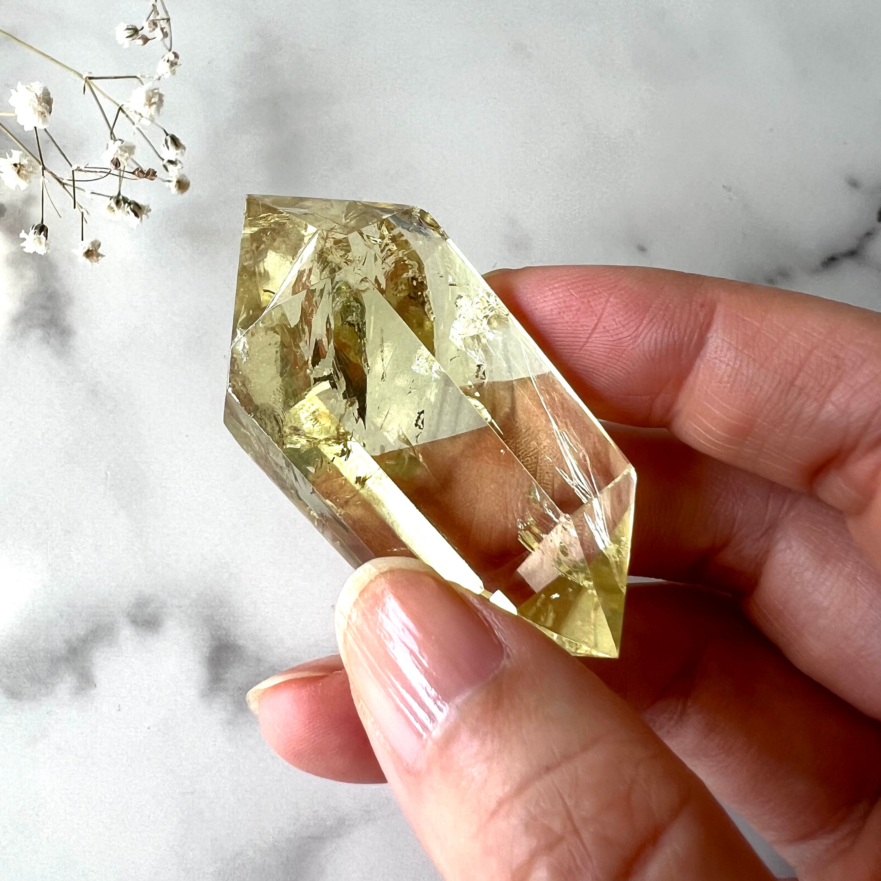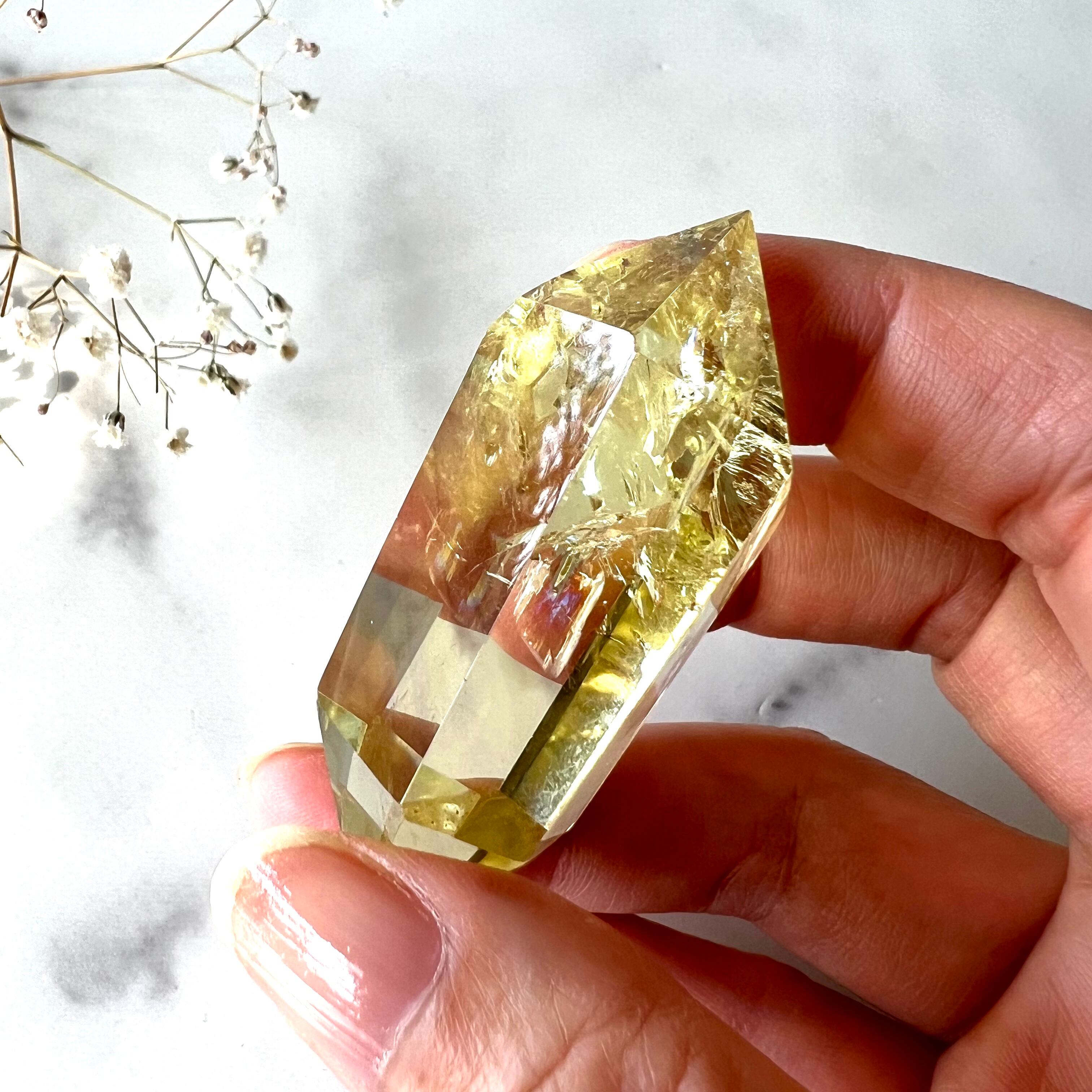 ダブルポイントの一方はクラックがほぼなくクリア、もう一方はクラックが光を反射し美しい虹を映し出し、私たちを目に見えない神秘の世界へと誘います。