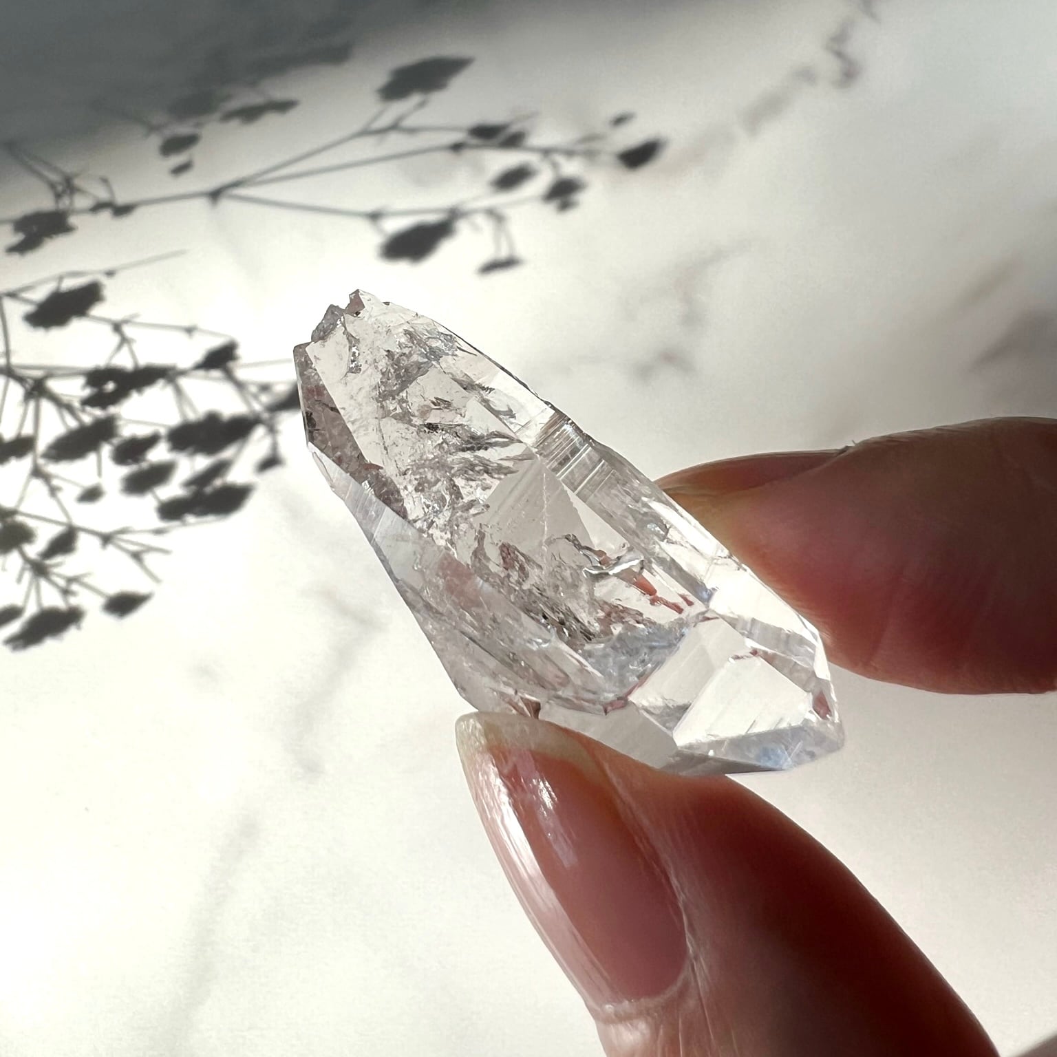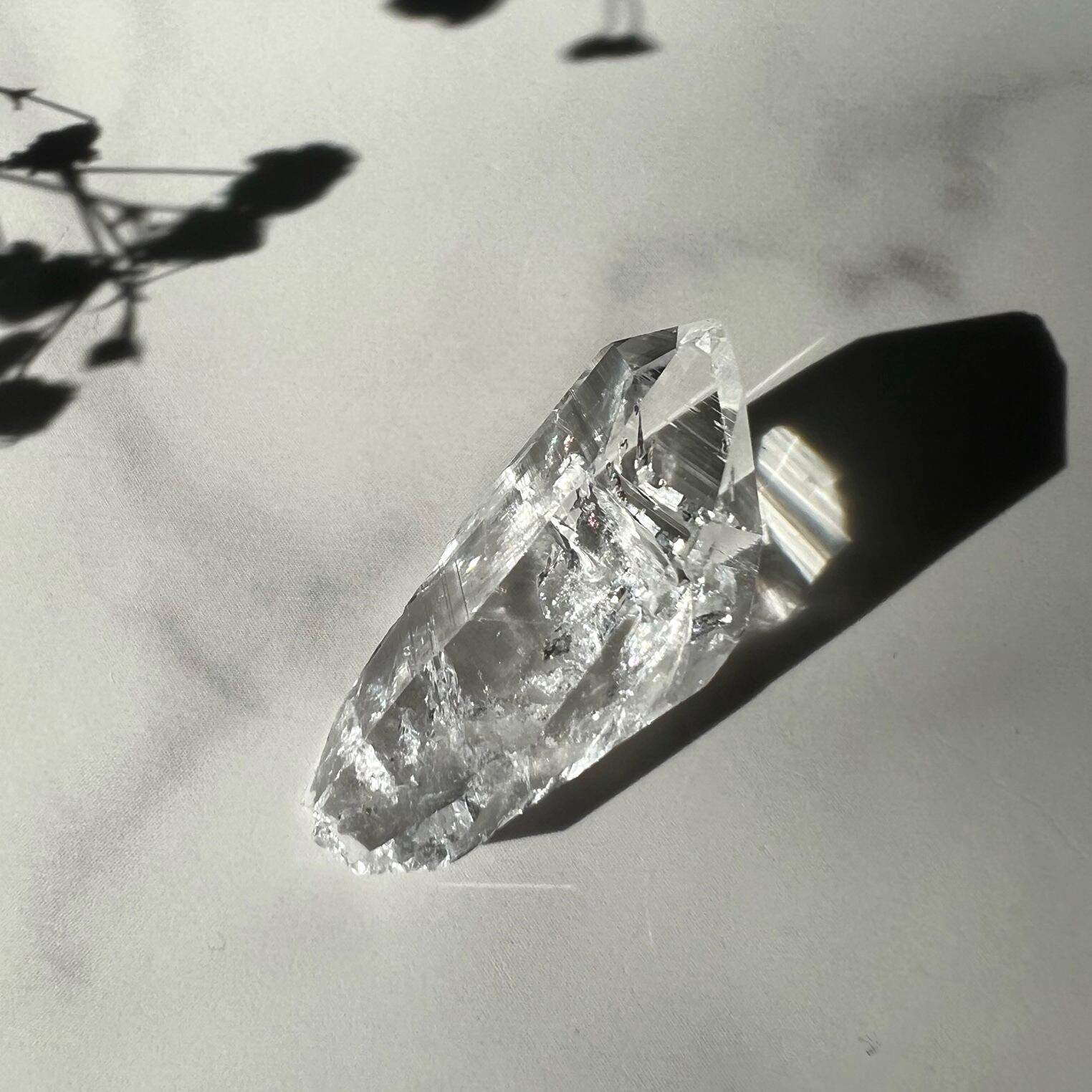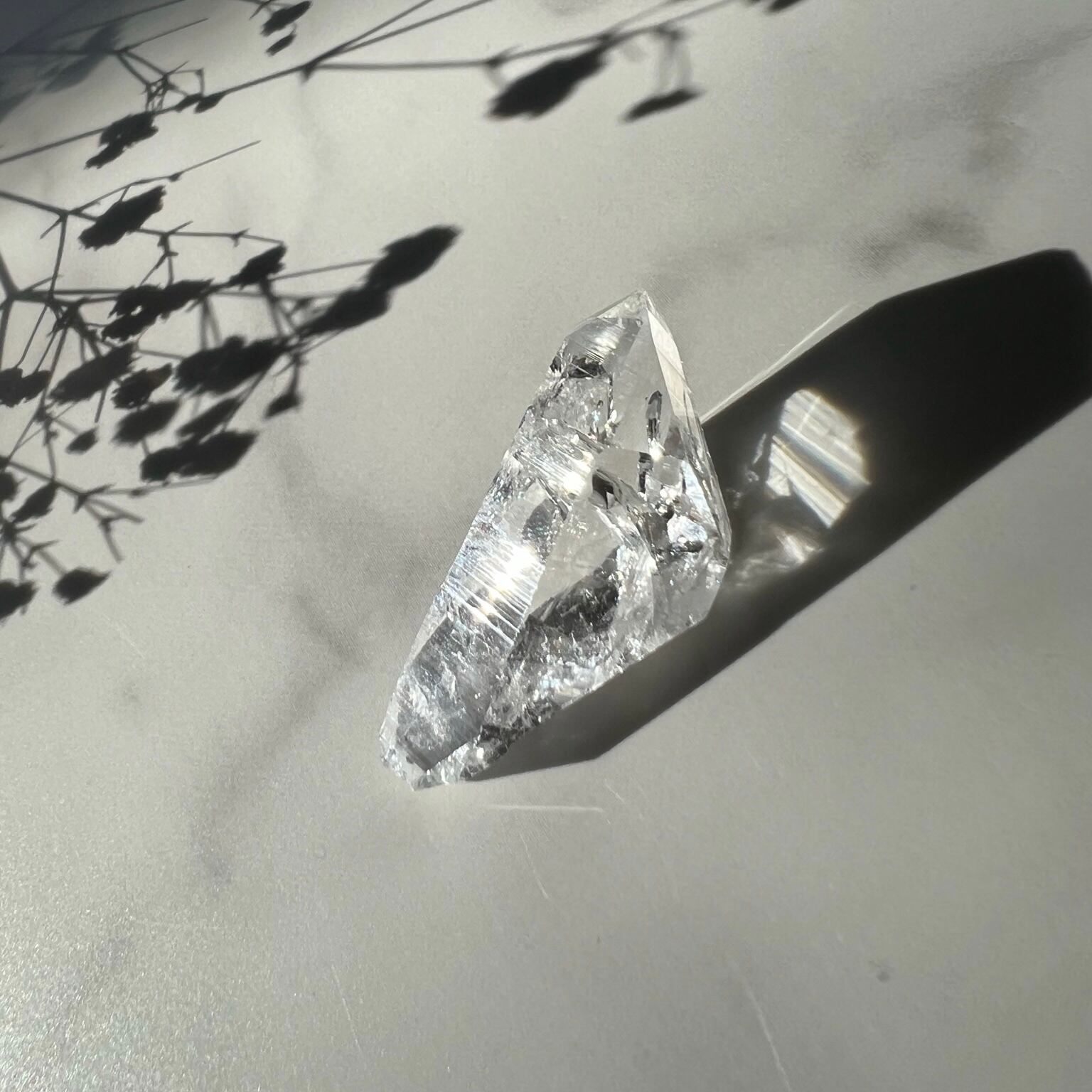 小さなクリスタルのカケラですが、高い透明度、柱面に刻まれたレムリアンリッジ、内包された虹の輝き、そして健気に成長を目指したセルフヒールド。どれを取っても本物の静謐なエネルギーを湛えています。