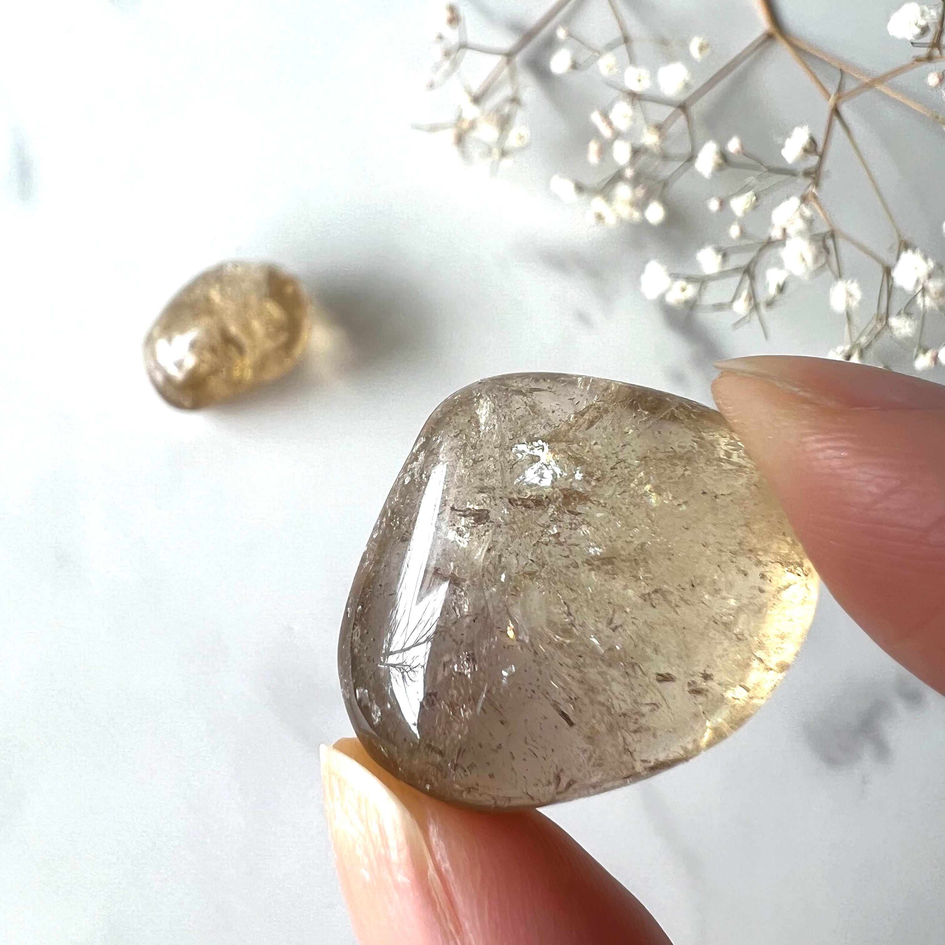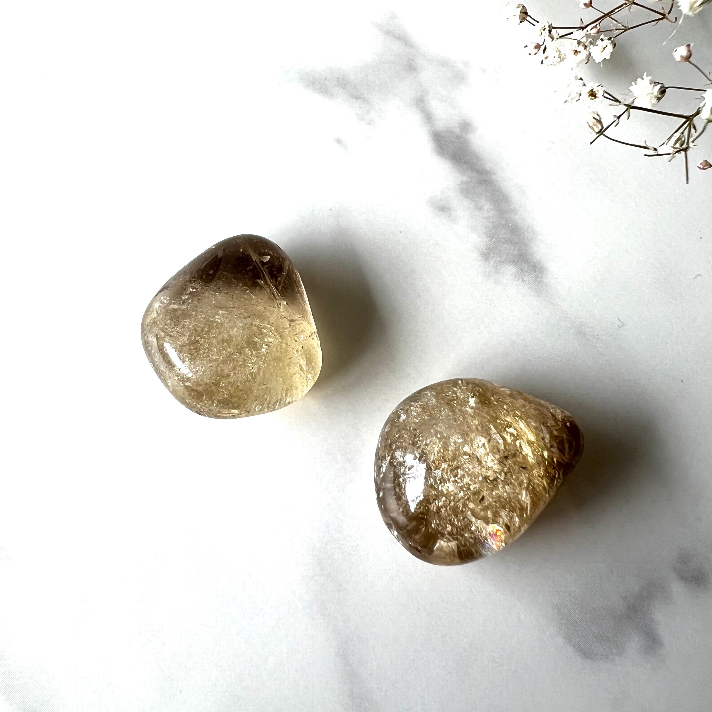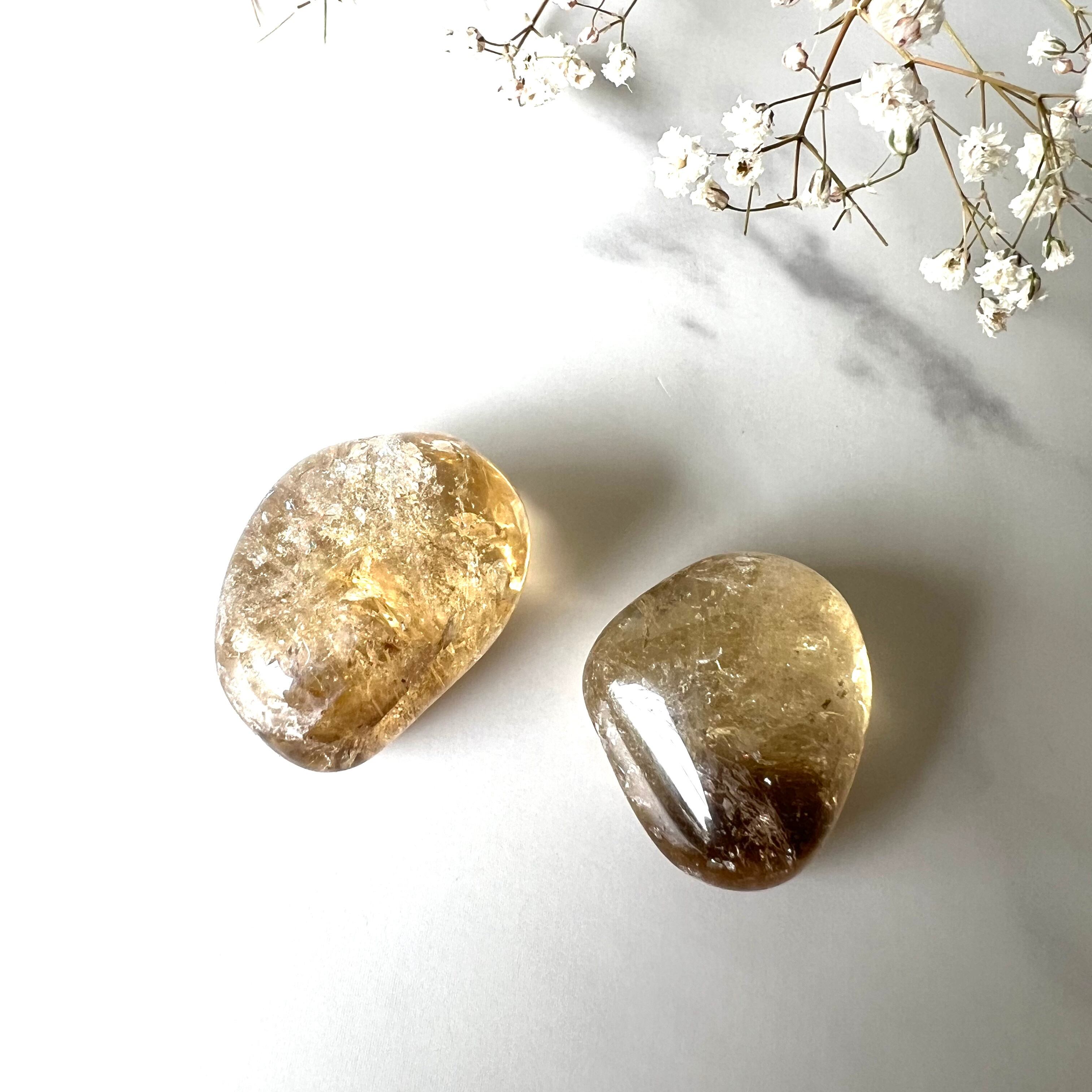 ガラスのような光沢に、天然ならではの色味を抑えたしっとりとした艶のあるナチュラルシトリンです。天然のクラックがと虹が美しい個体を厳選しました。