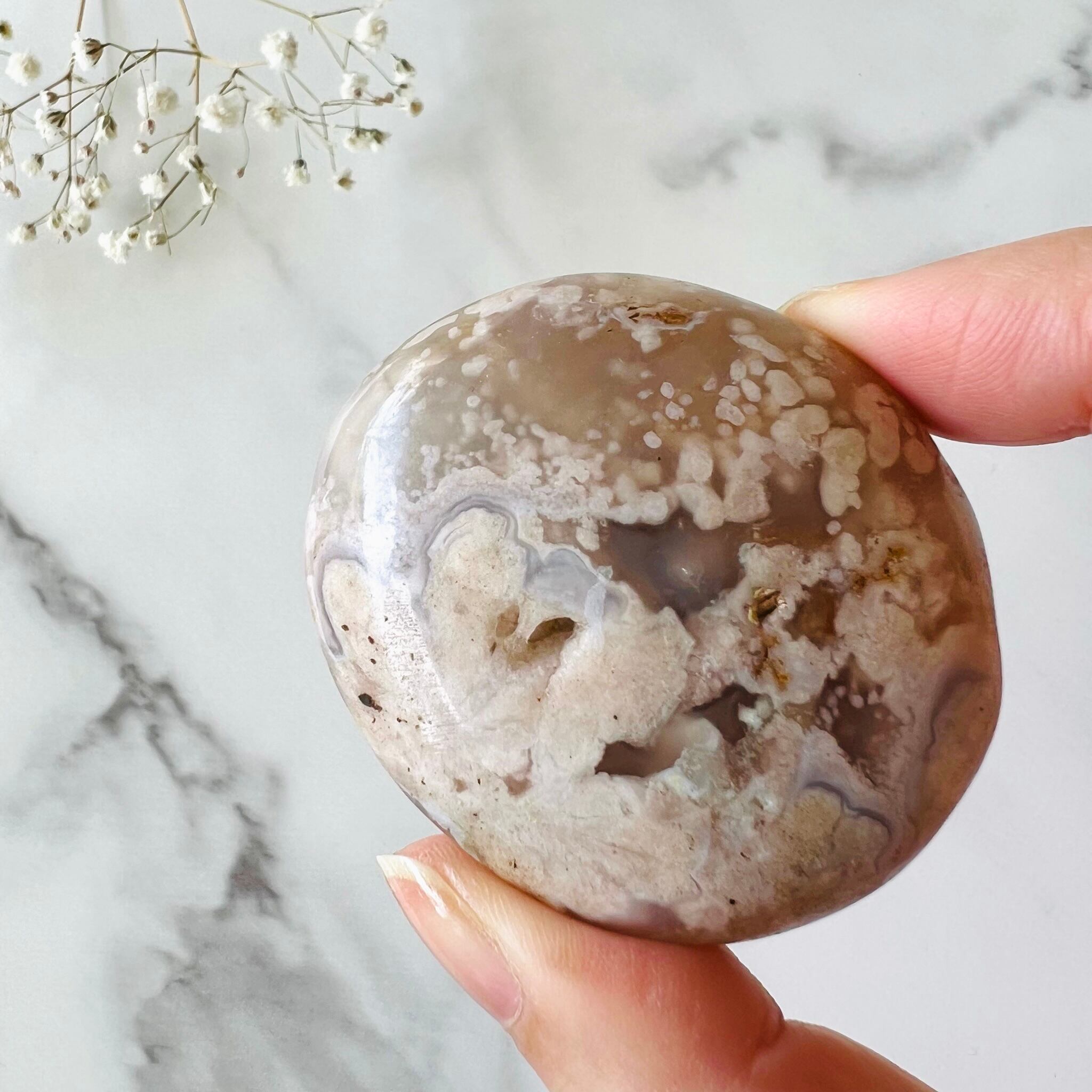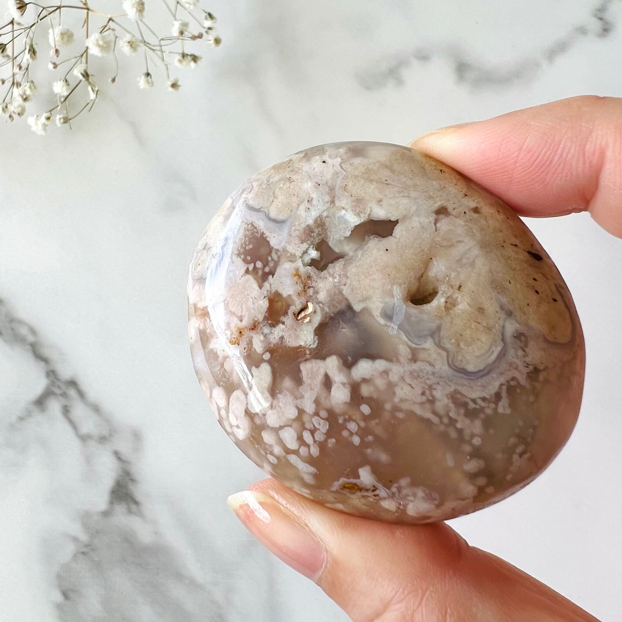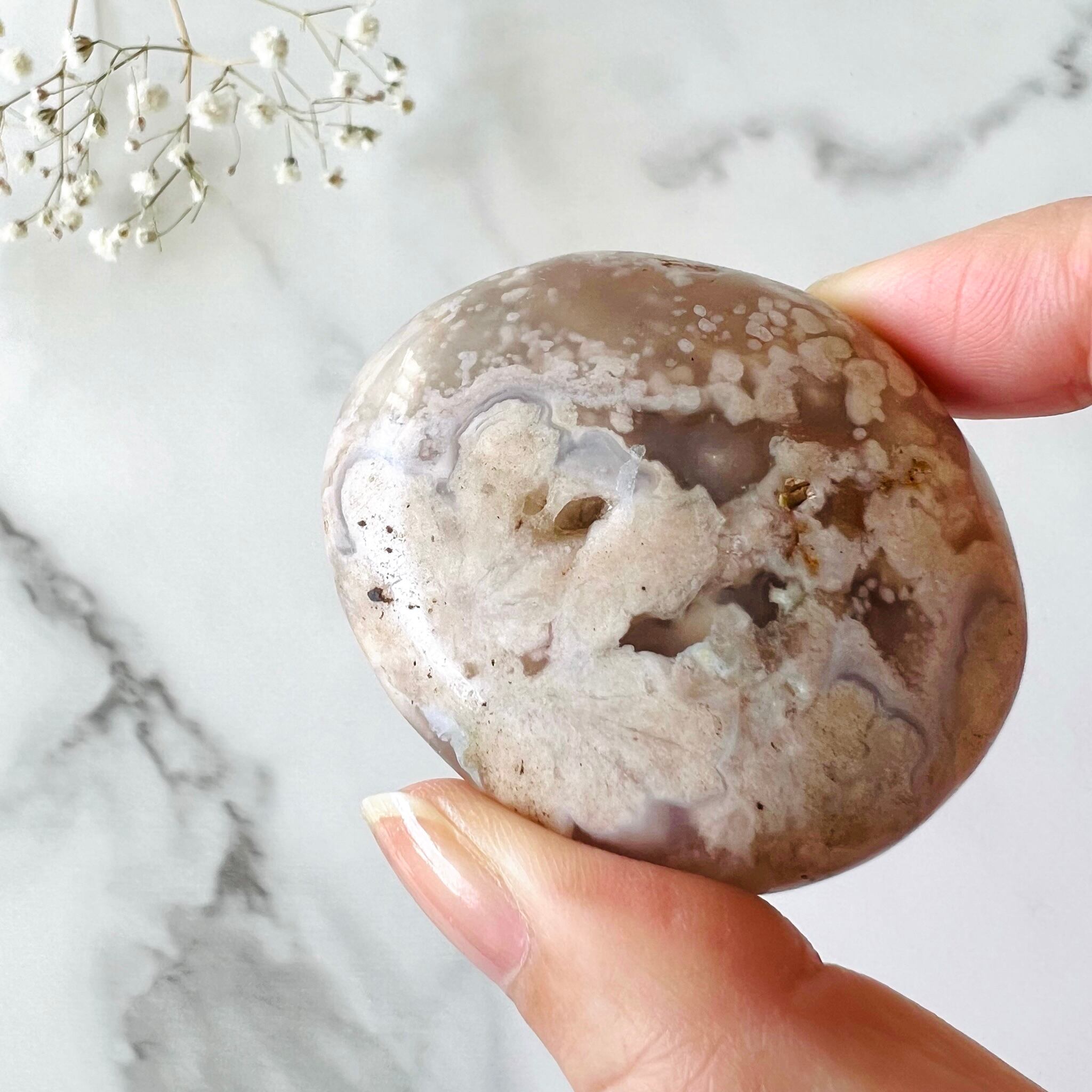 桜の花が咲いたような模様にくすみピンクの桜色が可愛い、春の訪れを感じさせてくれる桜めのうのパームストーンです。