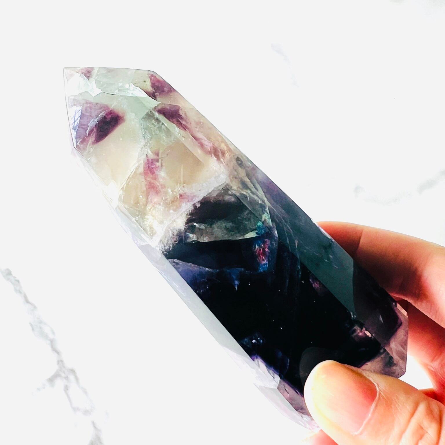 上半身は白いクォーツと深いパープルがギザギザ模様を描き出し、シャイニーで虹もたっぷりと入ります。