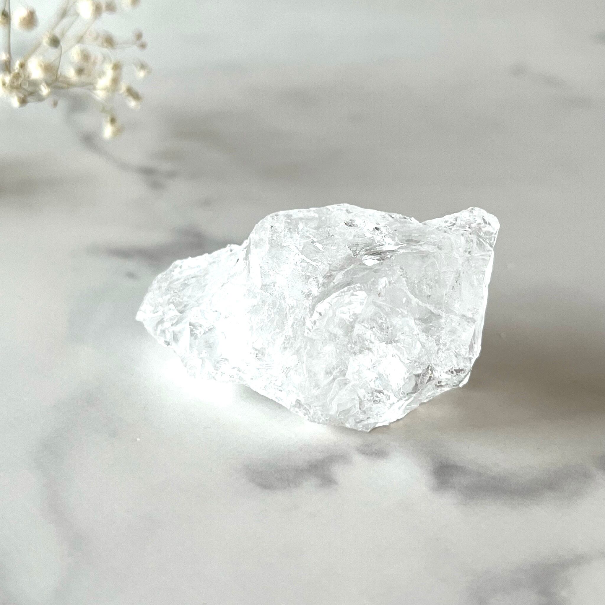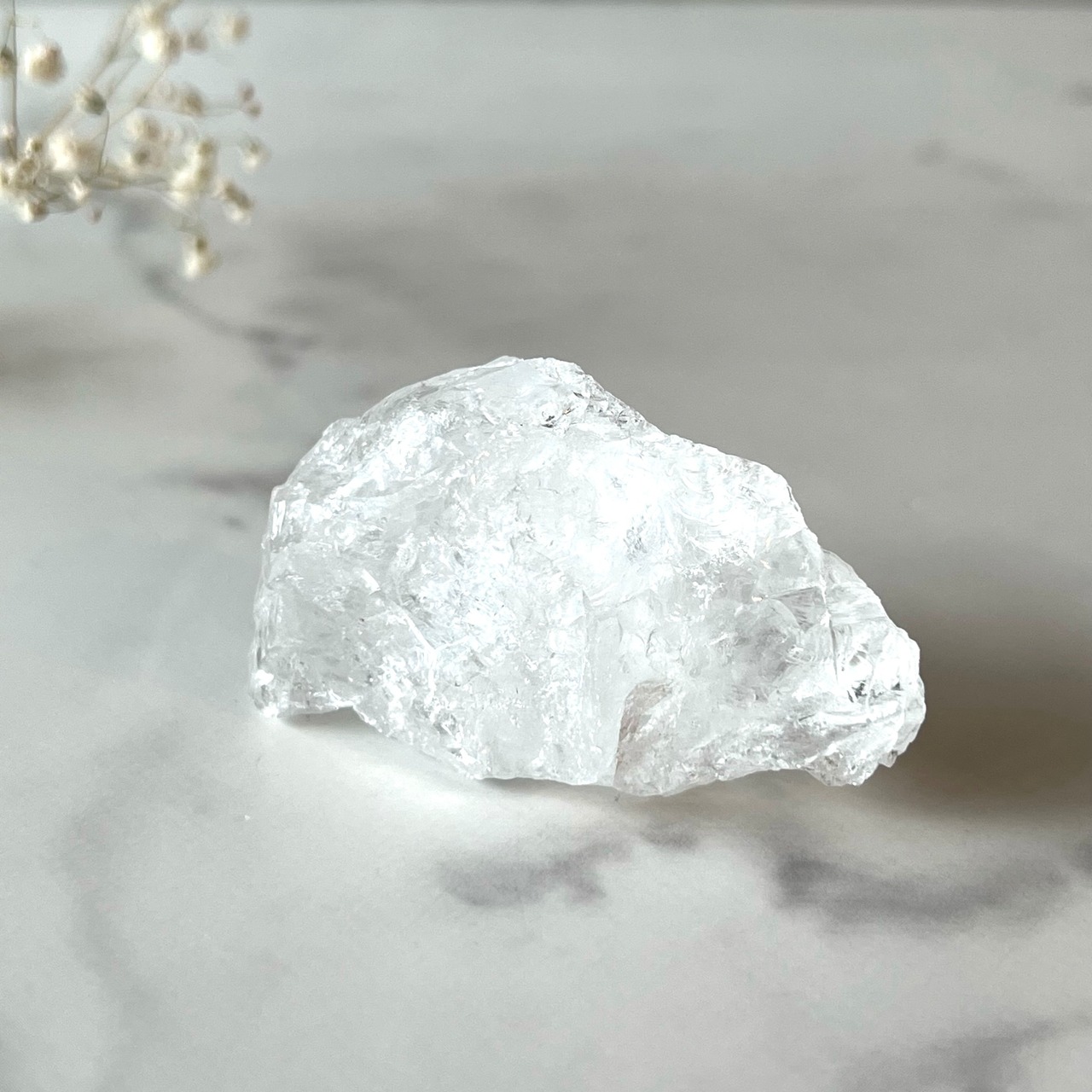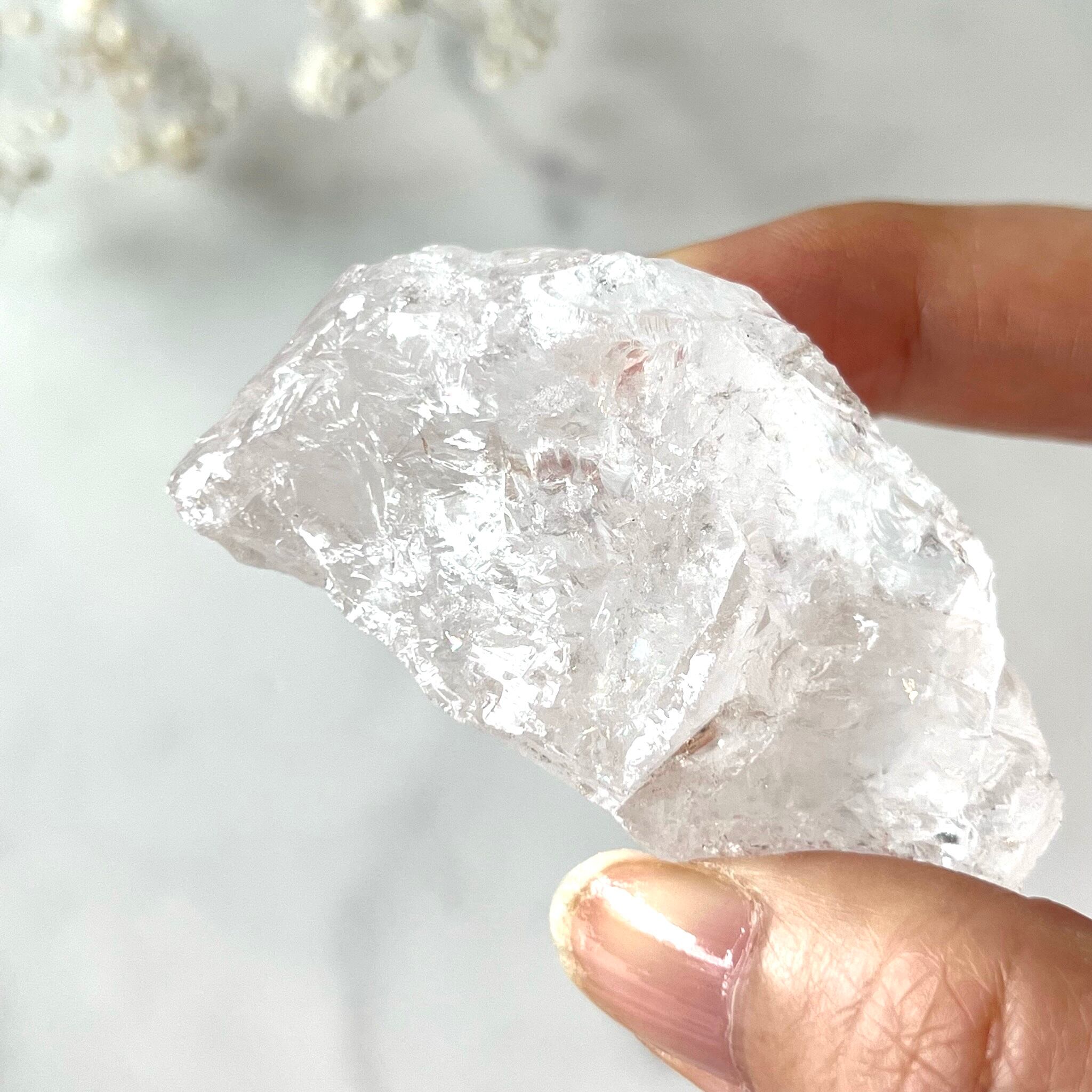 太陽の光をたっぷりと含み美しい姿を見せてくれるクリアクォーツのラフカット。瑞々しい透明感溢れるクォーツに、優しいパステルカラーの虹たちがあちこちに姿を現します。