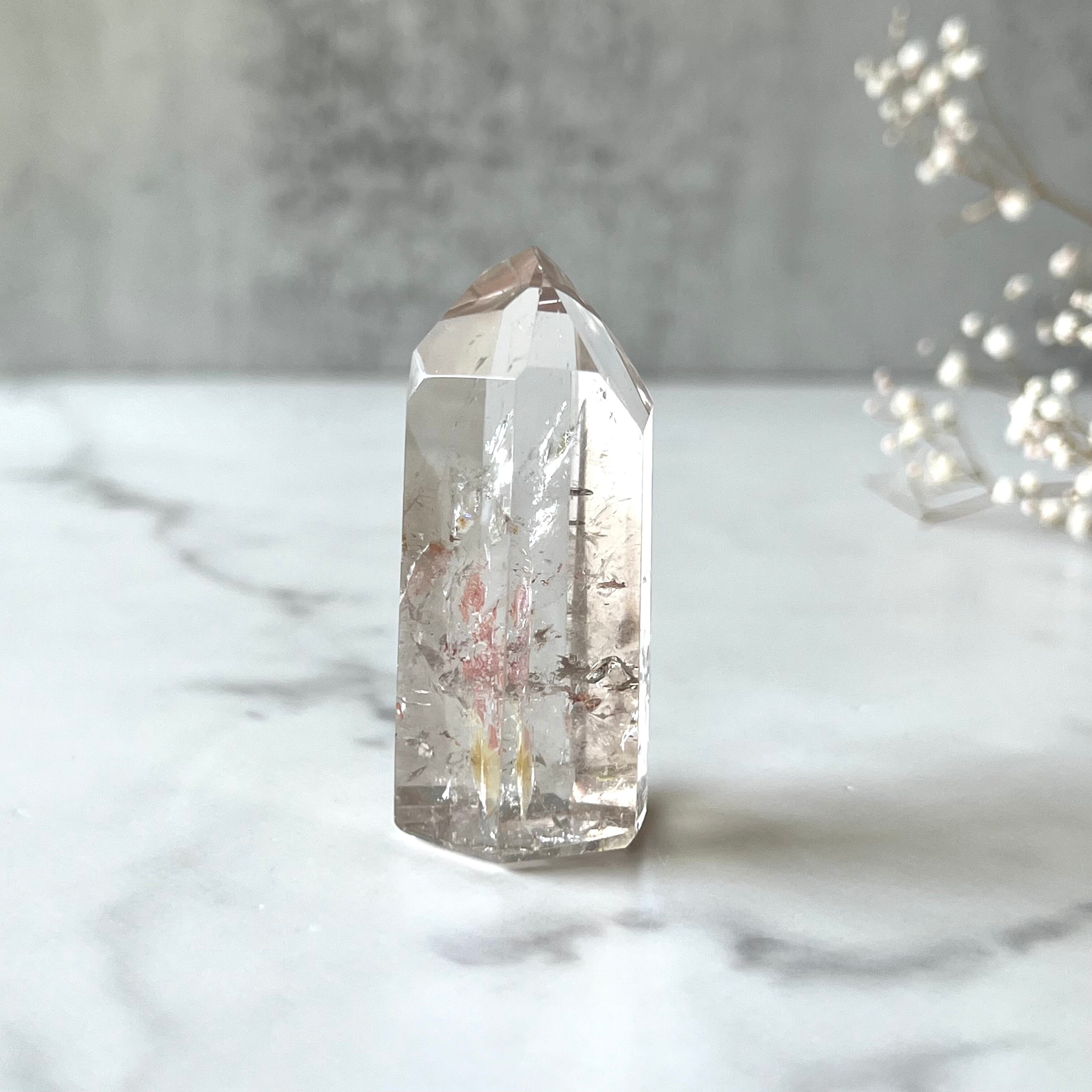 ピンクと黄色のインクルージョンが春らしいアイリスクォーツポイントです。