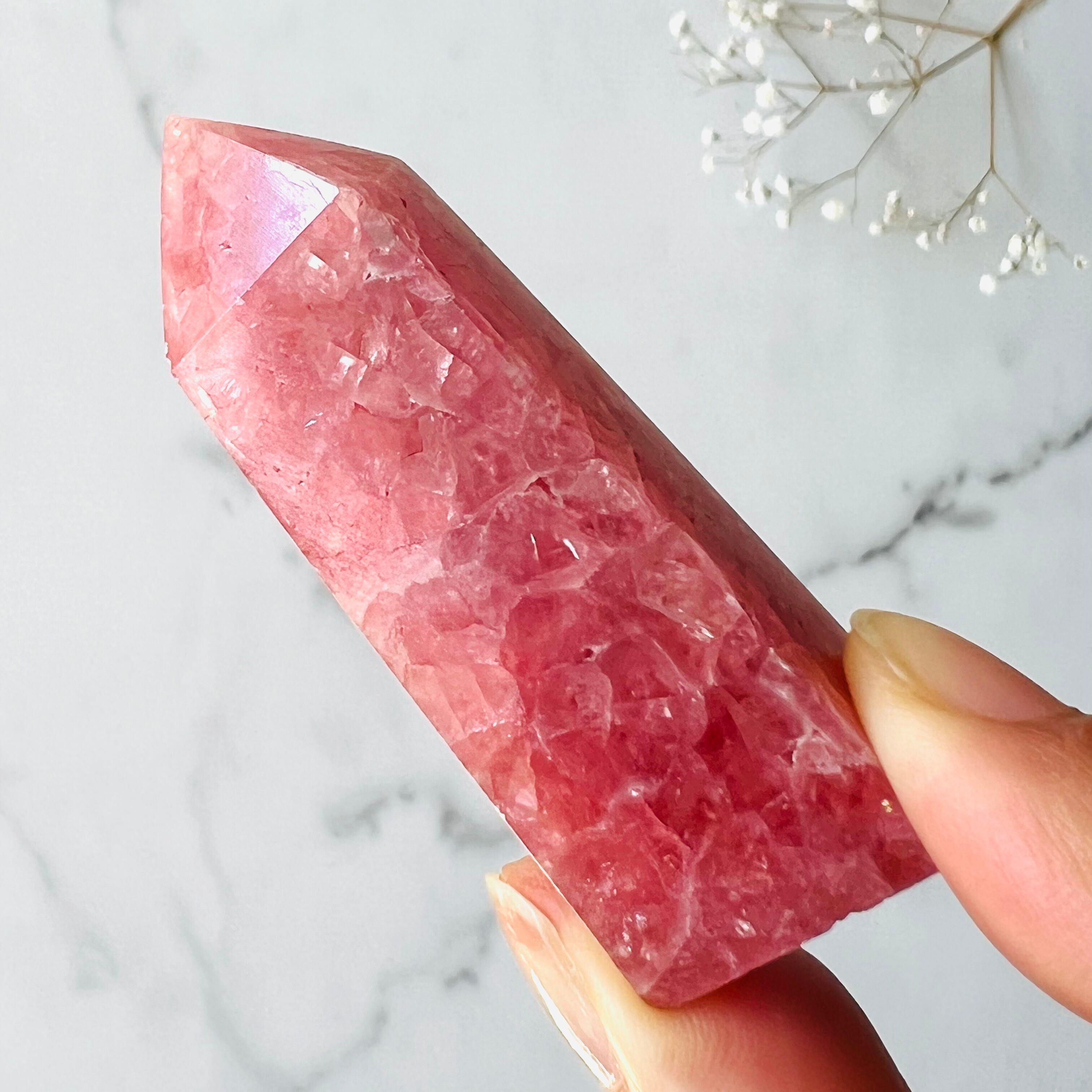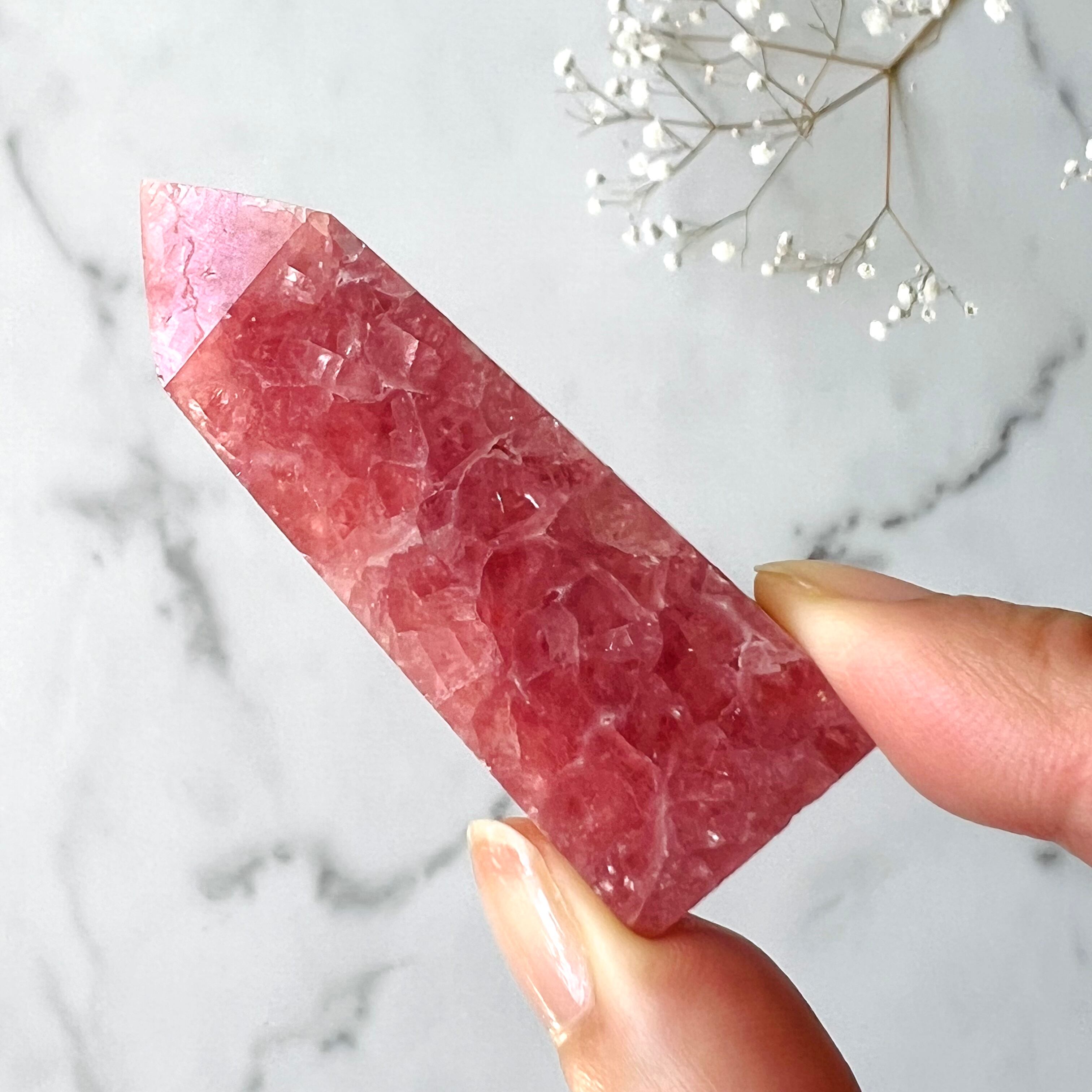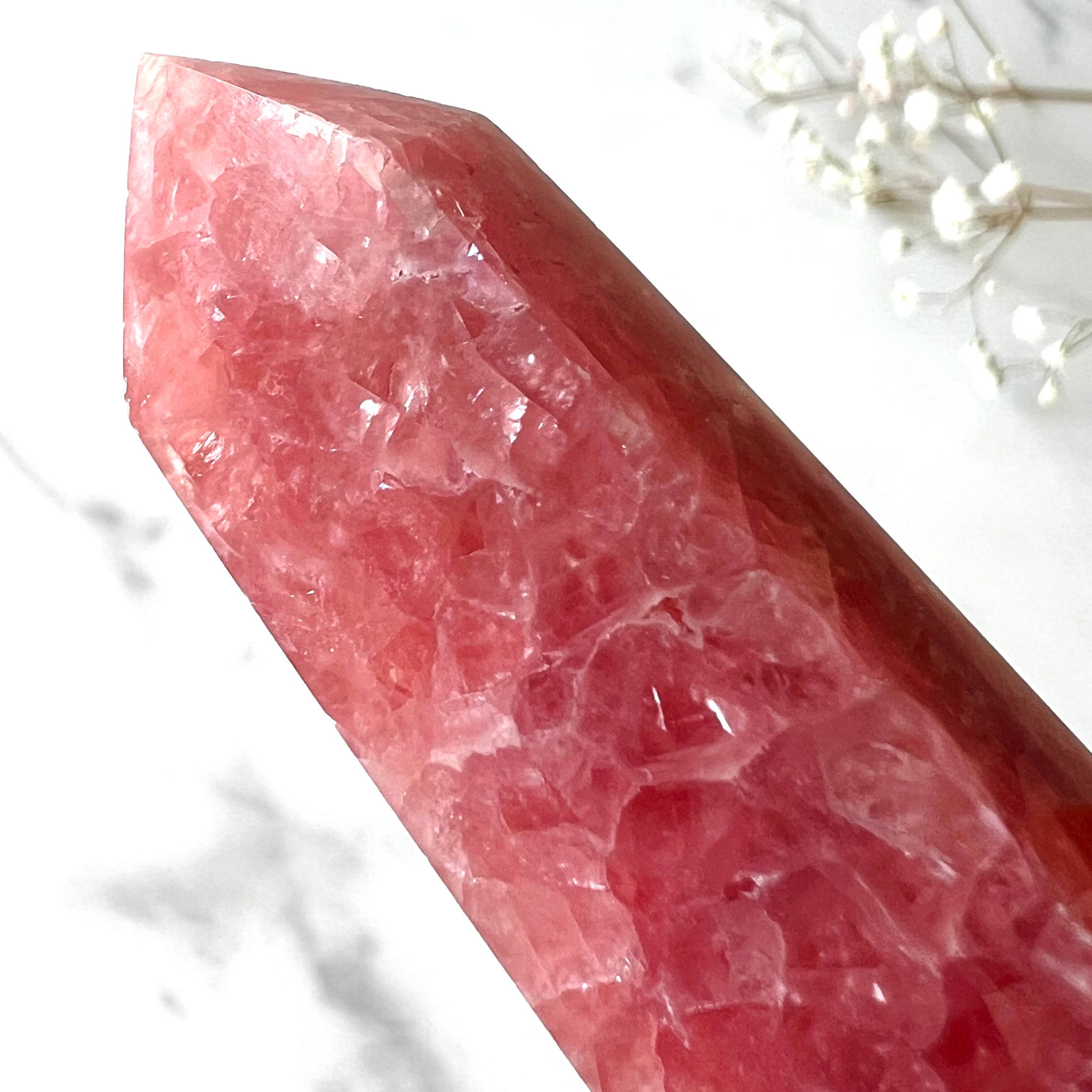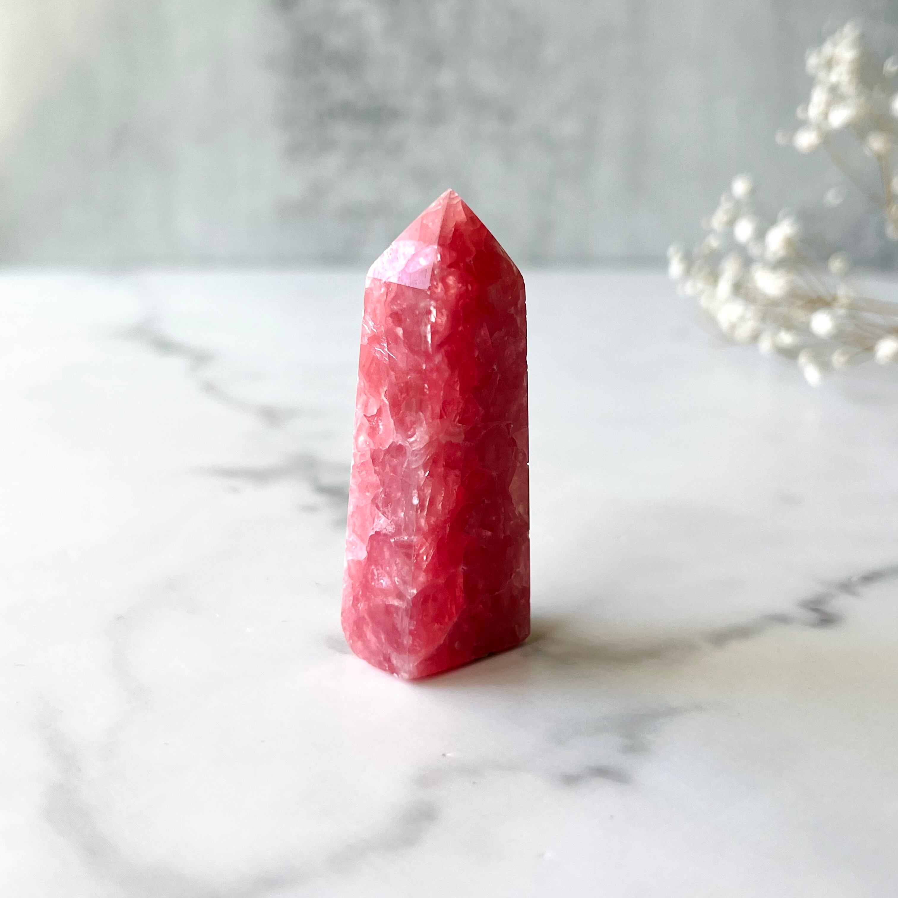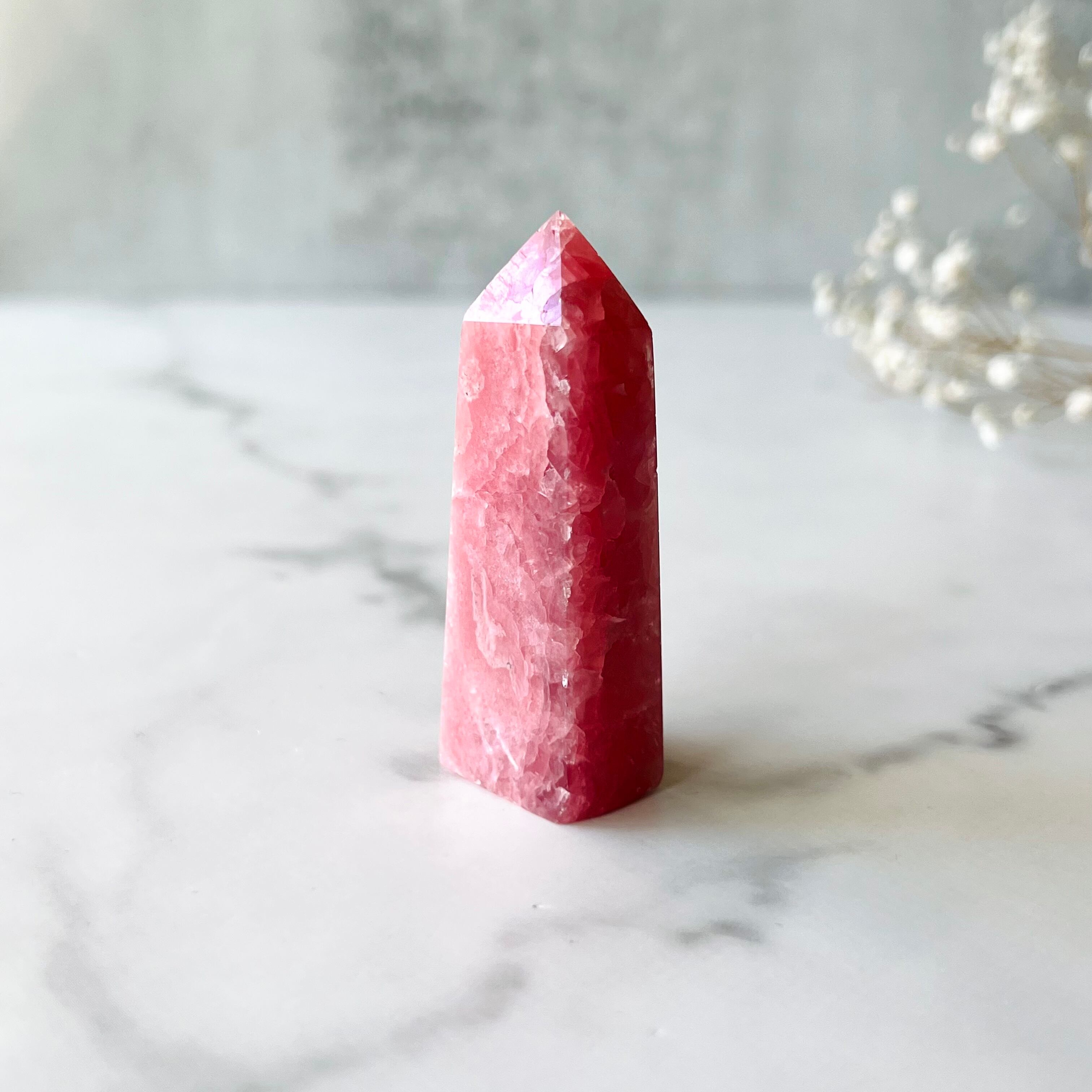 不純物がほとんどなく透明感がある赤みピンクのみのインカローズはとても希少で、その多くは宝石に加工されるため、タワー型はほとんど見かけません。高価ですがその価値のあるアイテムです。