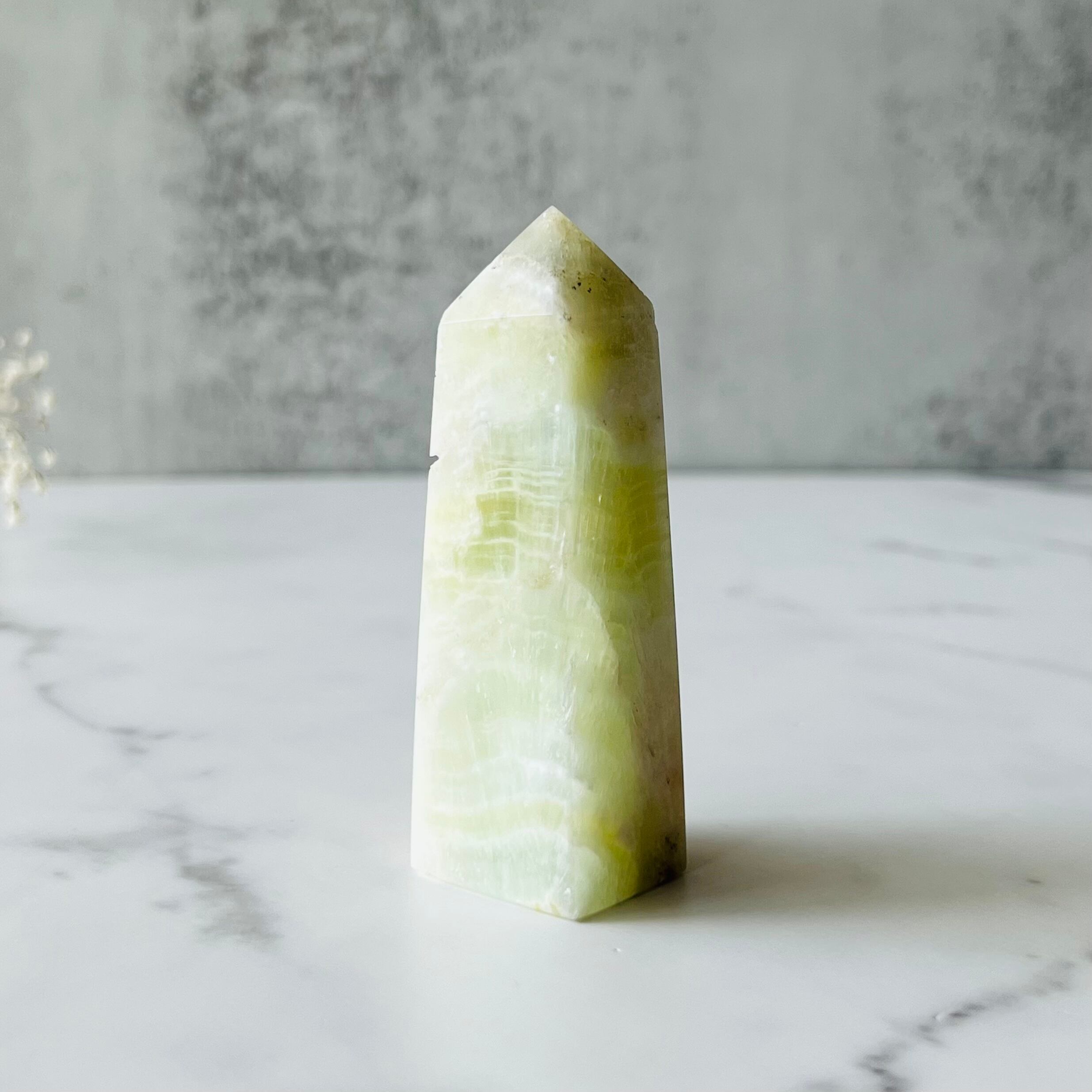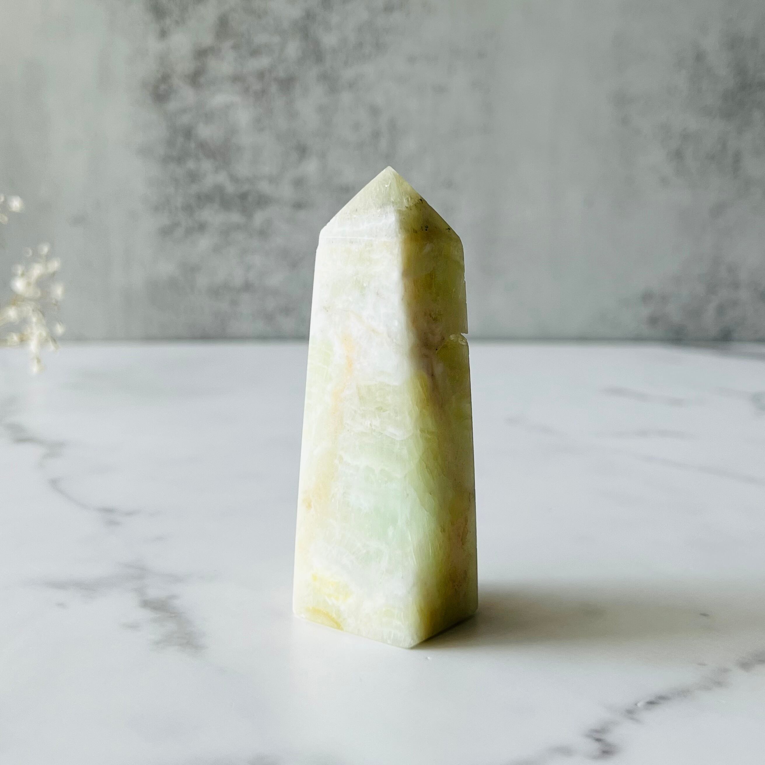 淡く透け感のあるグリーンがとても綺麗なグリーンカルサイト。光を含んでキラキラと輝きます。白、グリーン、ほんのりイエローの混ざり合った色味がとってもかわいいです。カルサイトは波動が穏やかで、気づかないほどに優しく心身に癒しを与えてくれます。
