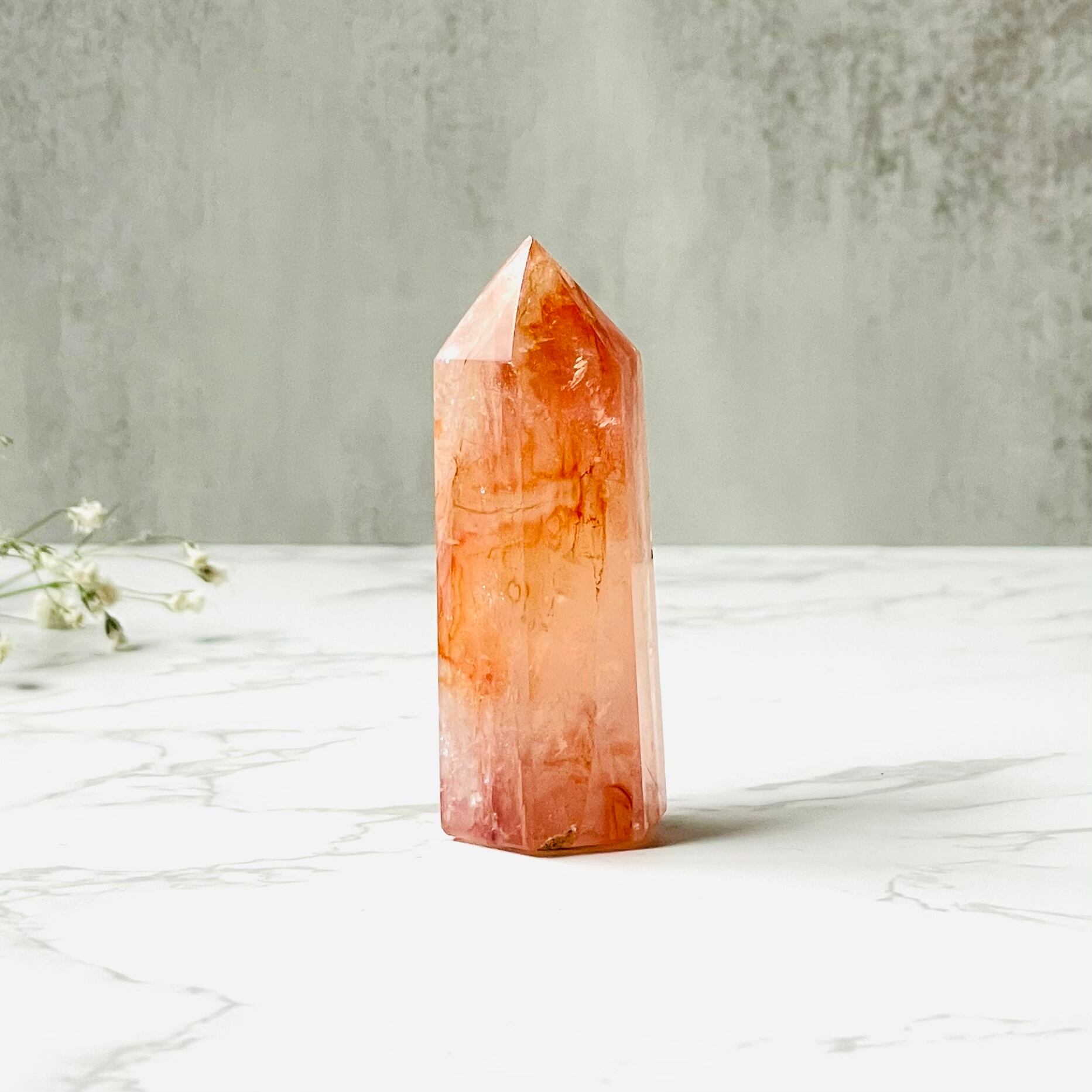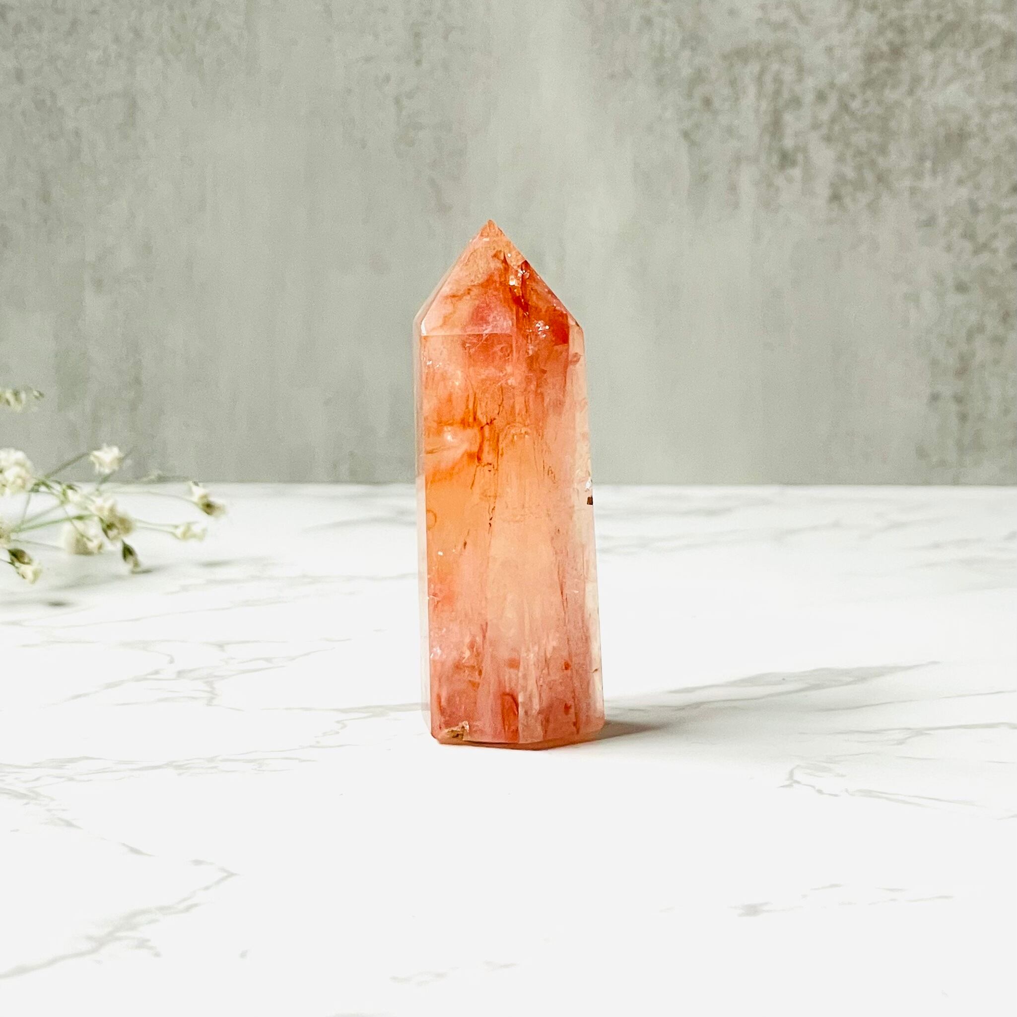 白や透明なクォーツに明るいオレンジレッドの絵の具を垂らしたようなグラデーションが美しく、どの面から見てもラメや虹が輝き、元気づけてくれます。