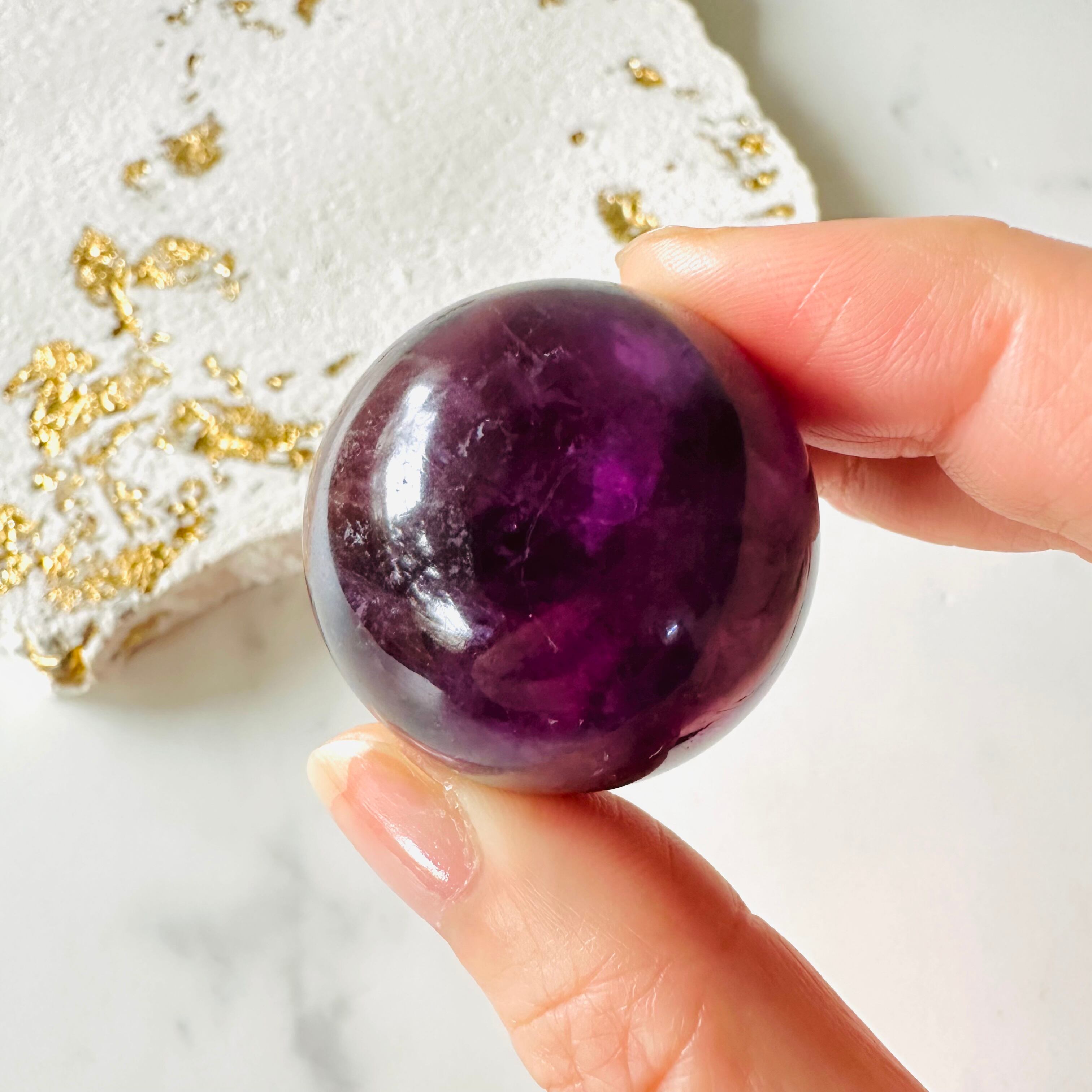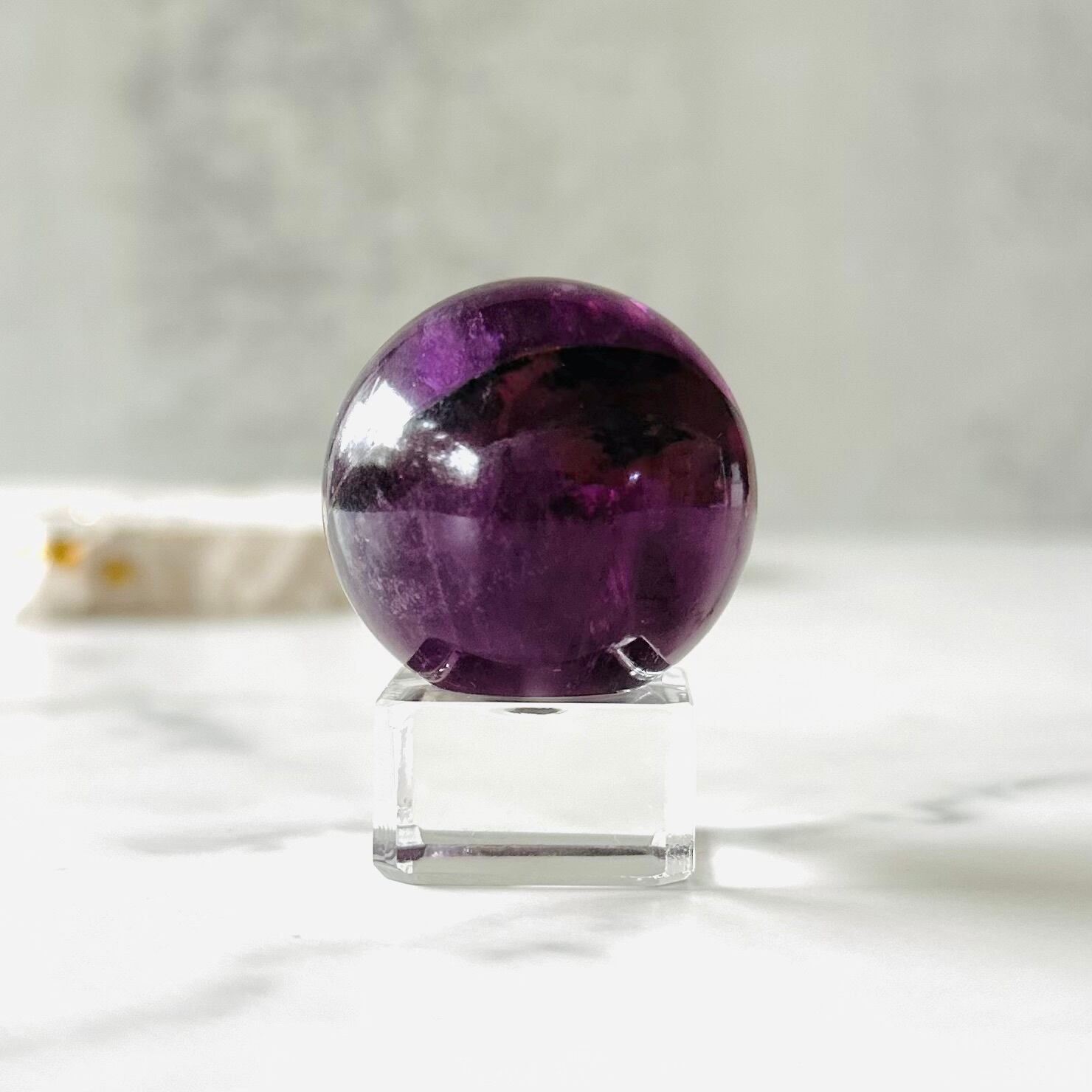 ディープパープルが美しいフローライトのスフィアです。アメトリンのような色合いで、優しい温かみがあります。虹もとても綺麗です。