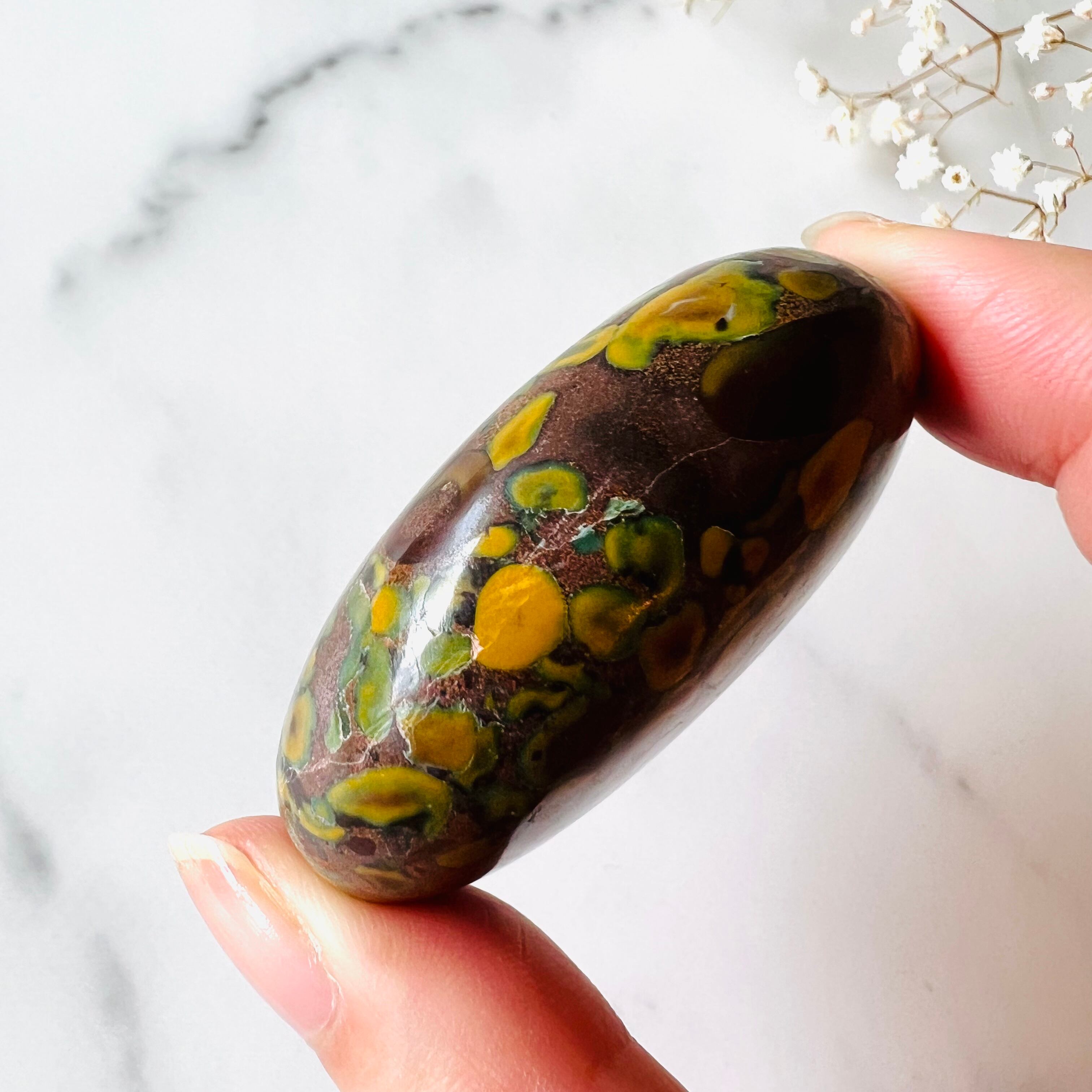 ブラウンにイエローの模様が入ったフルーツジャスパーです。キウイやバナナ、マンゴーといった南国フルーツを思わせるような個性的な模様です。まるで油絵のようですが、自然が作り出した色合いと模様で、見ているとなんだか楽しい気分になります。