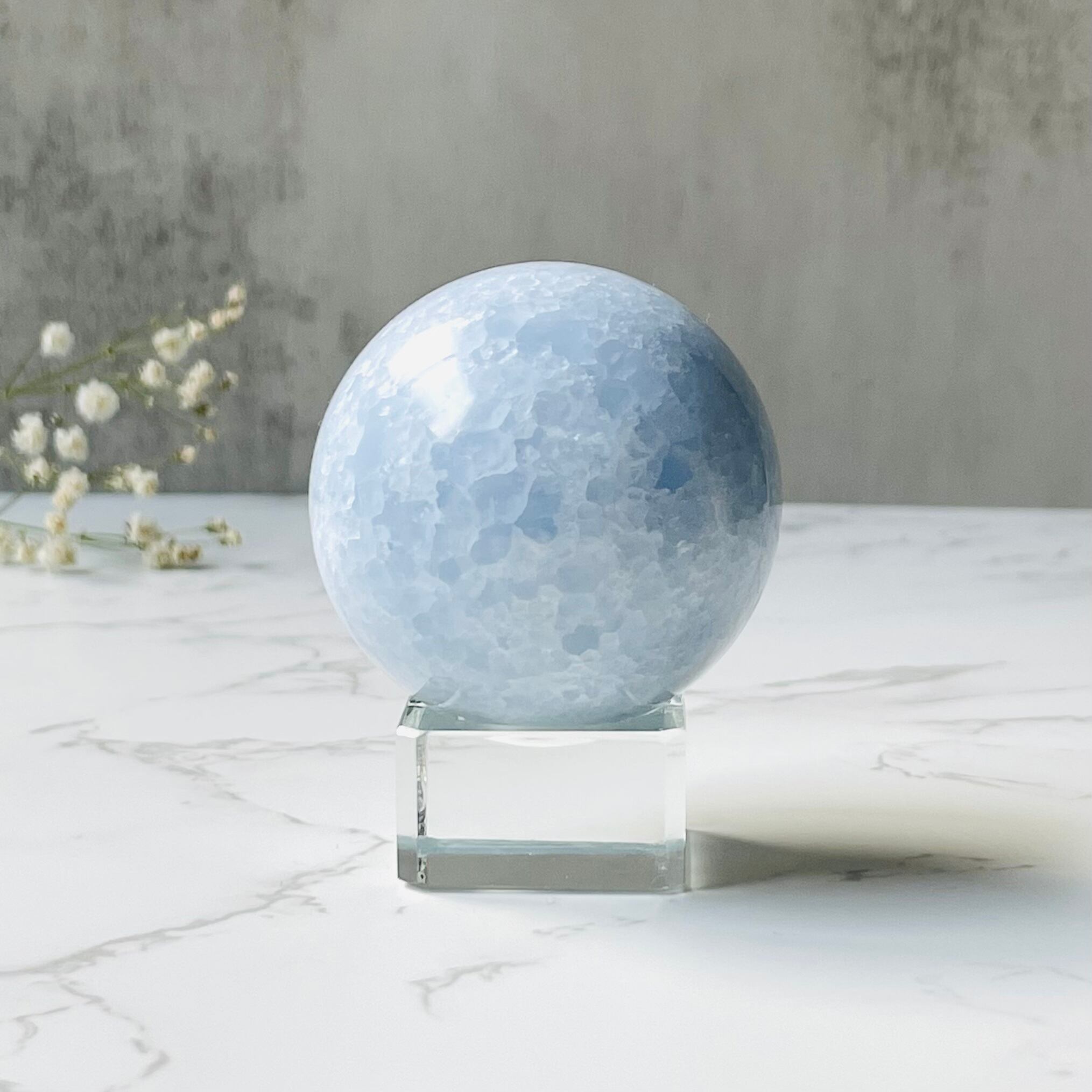 淡く優しいブルーの結晶が美しいブルーカルサイトのスフィアです。ブルーカルサイトの波動は穏やかで、それはまるで優しく寄せて返すさざ波のようです。