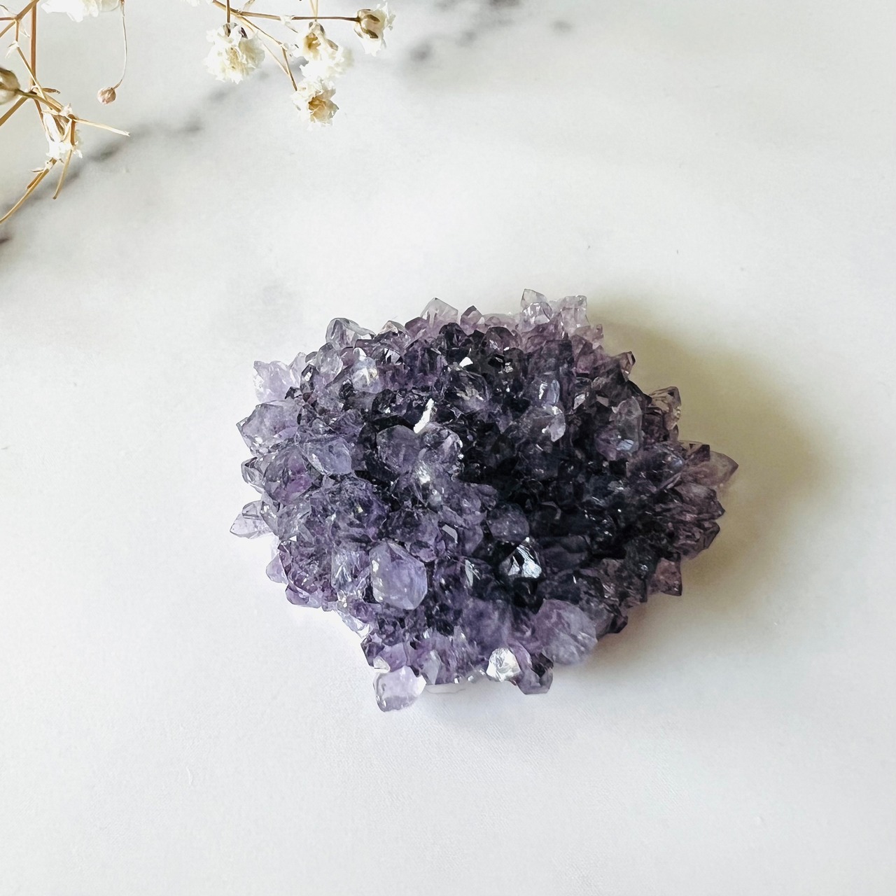 フラワーアメジストスタクライトです。小さな結晶の粒がびっしりと集まって美しいお花を形成しています。ミニチュアのように緻密で可愛らしいミクロの世界です。
