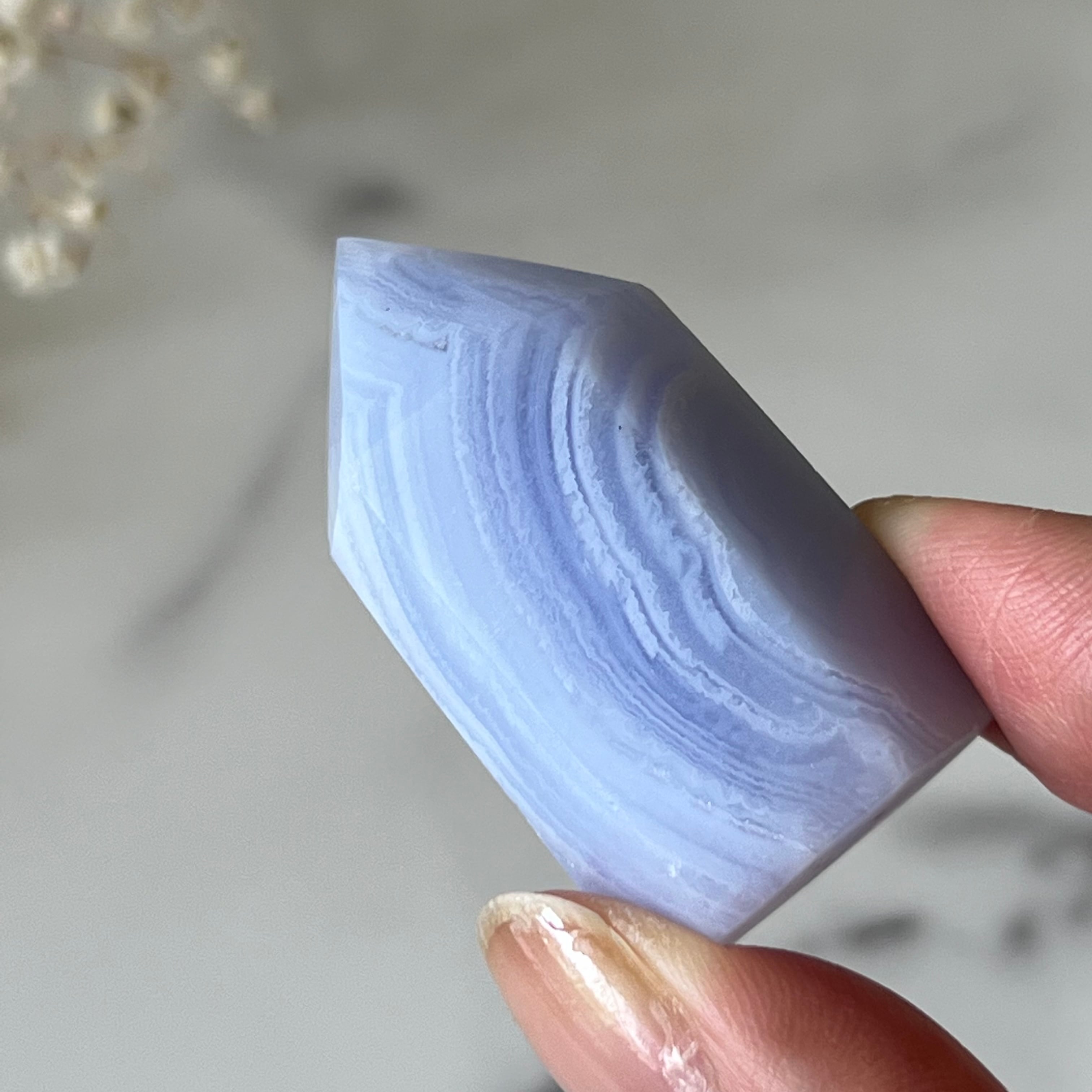 淡いサックスブルーが上品な印象のブルーレースアゲートのミニタワーです。