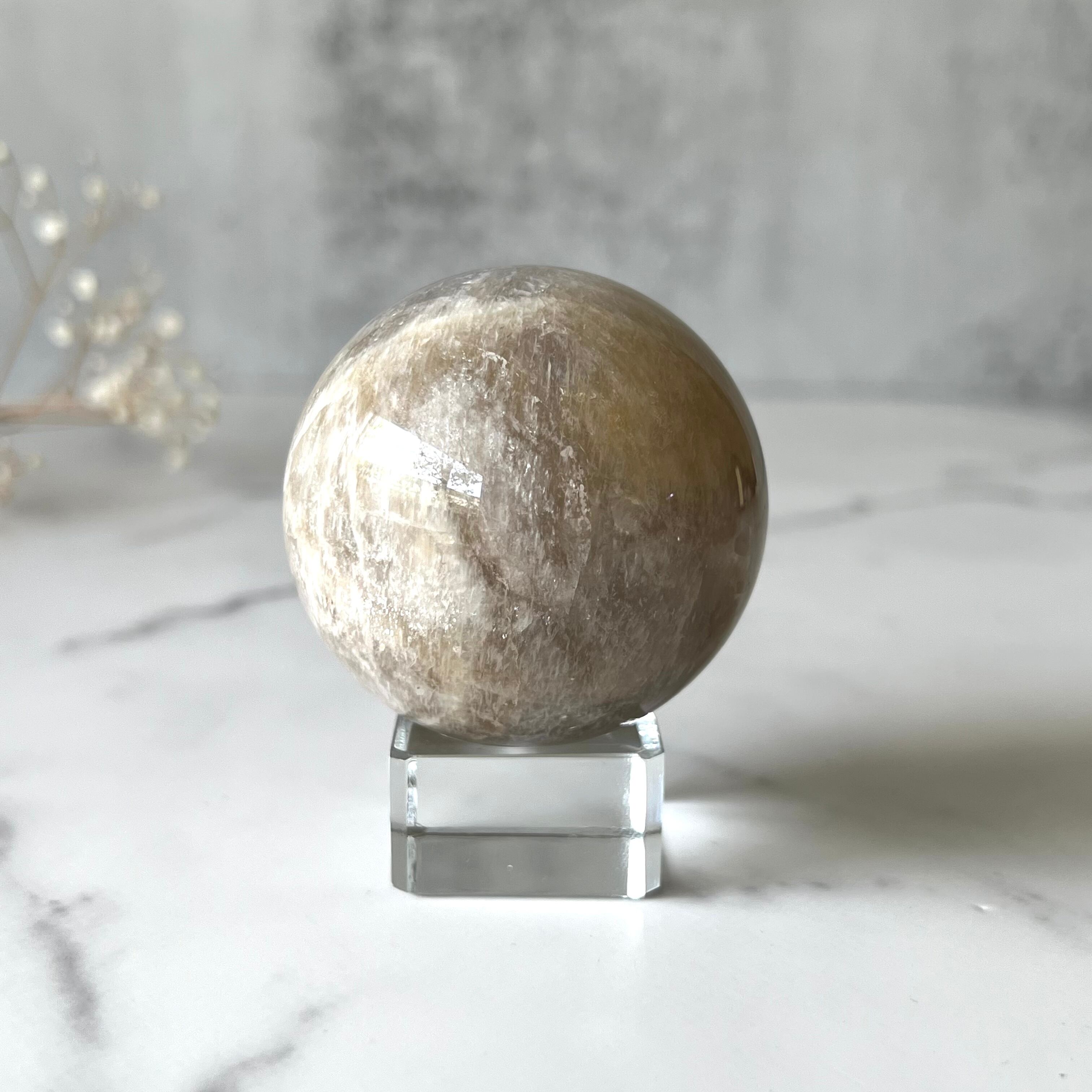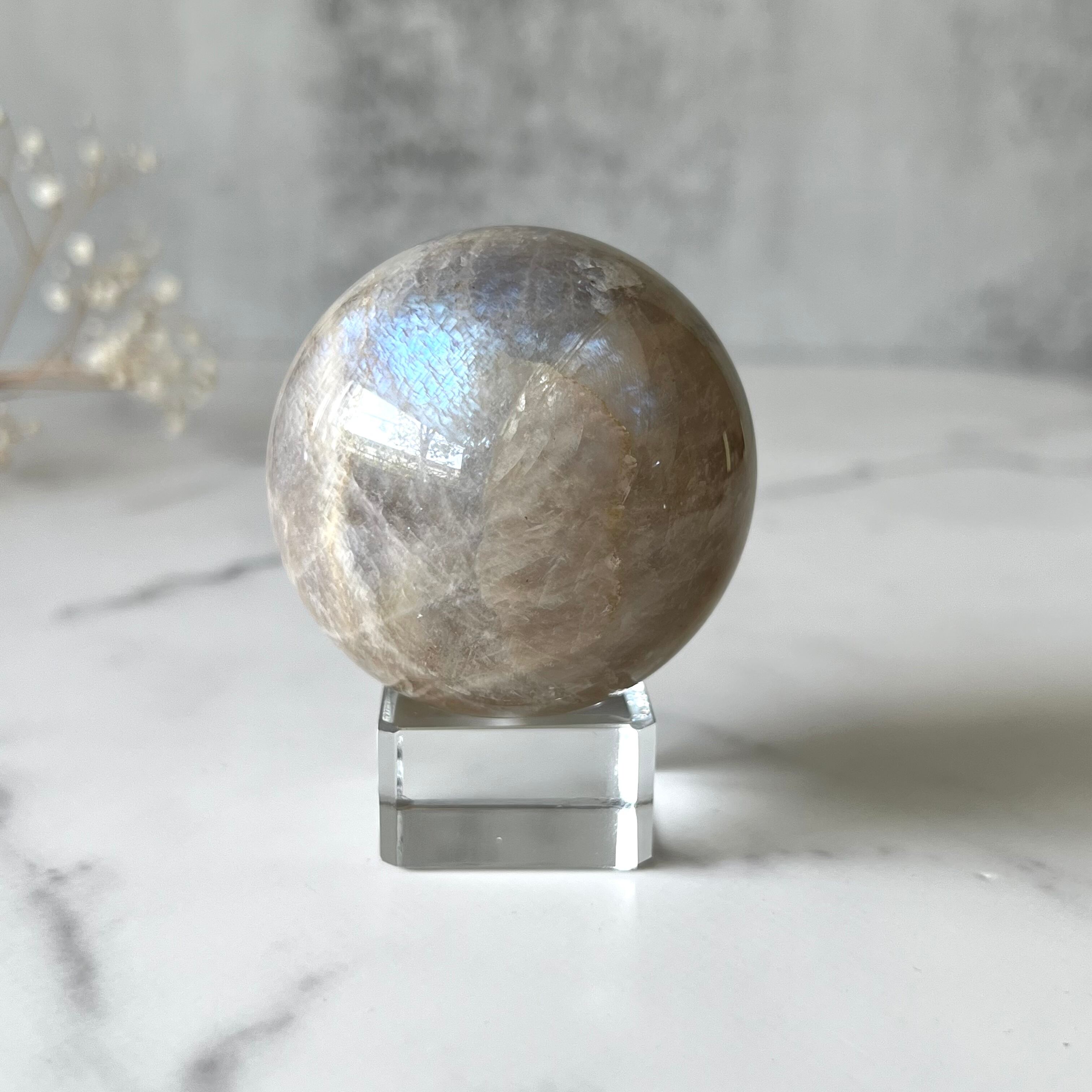 虹色に煌めくシラーと青いシラーがたっぷり入る幻想的なムーンストーンスフィアです。