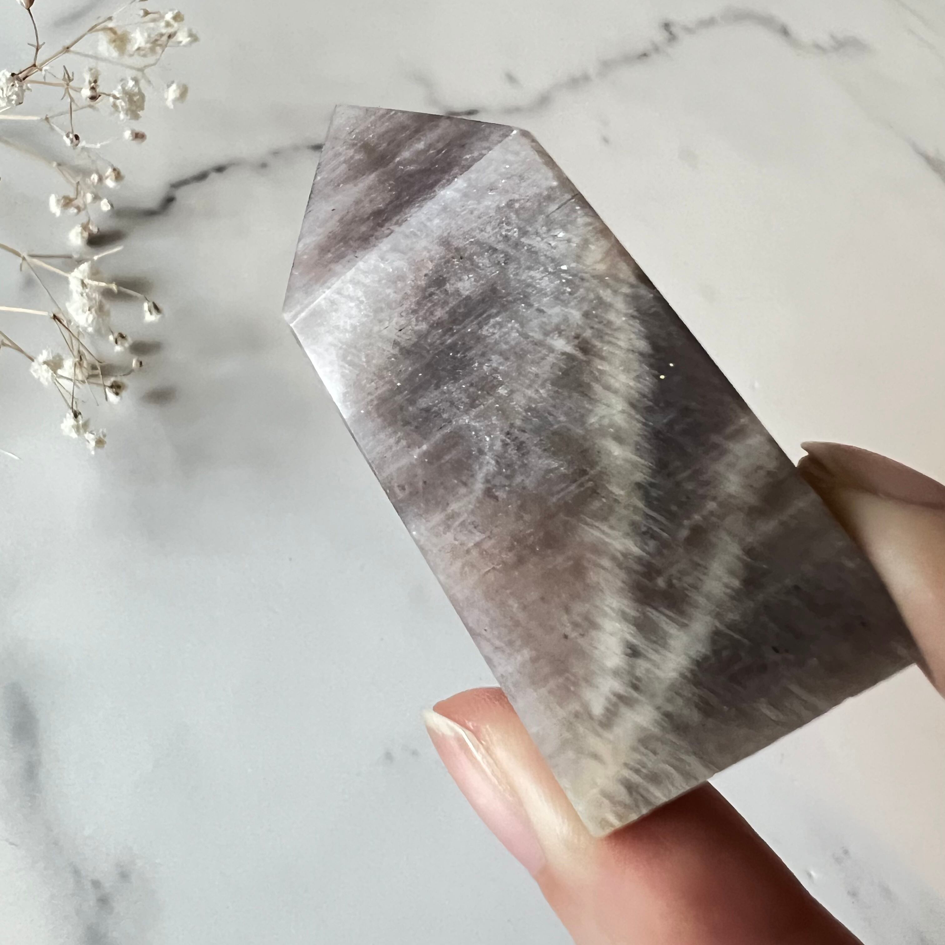 上品な青いシラーが全面にたっぷり入る幻想的なムーンストーンタワーです。角度によって光を反射して幻想的なブルーの光を映し出します。