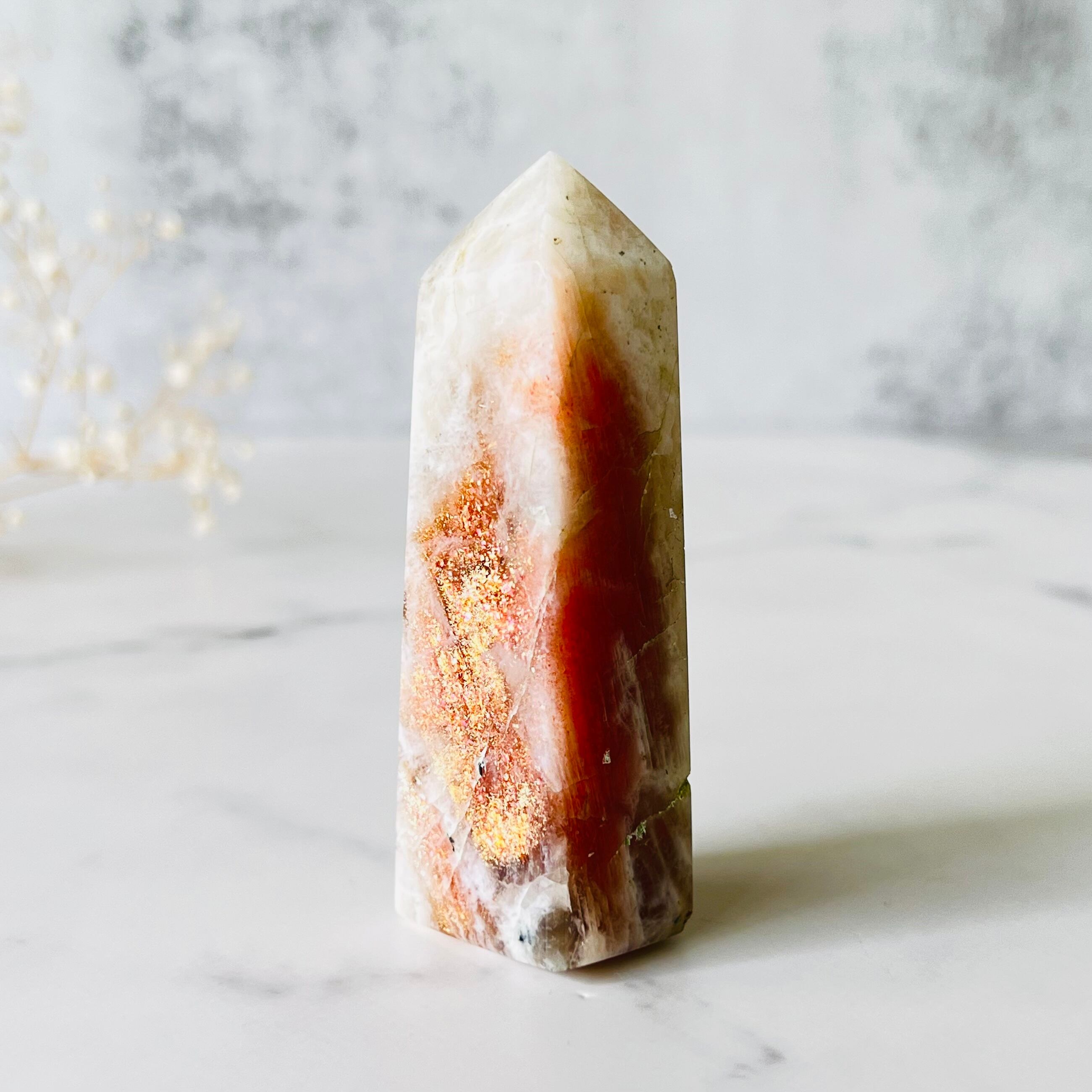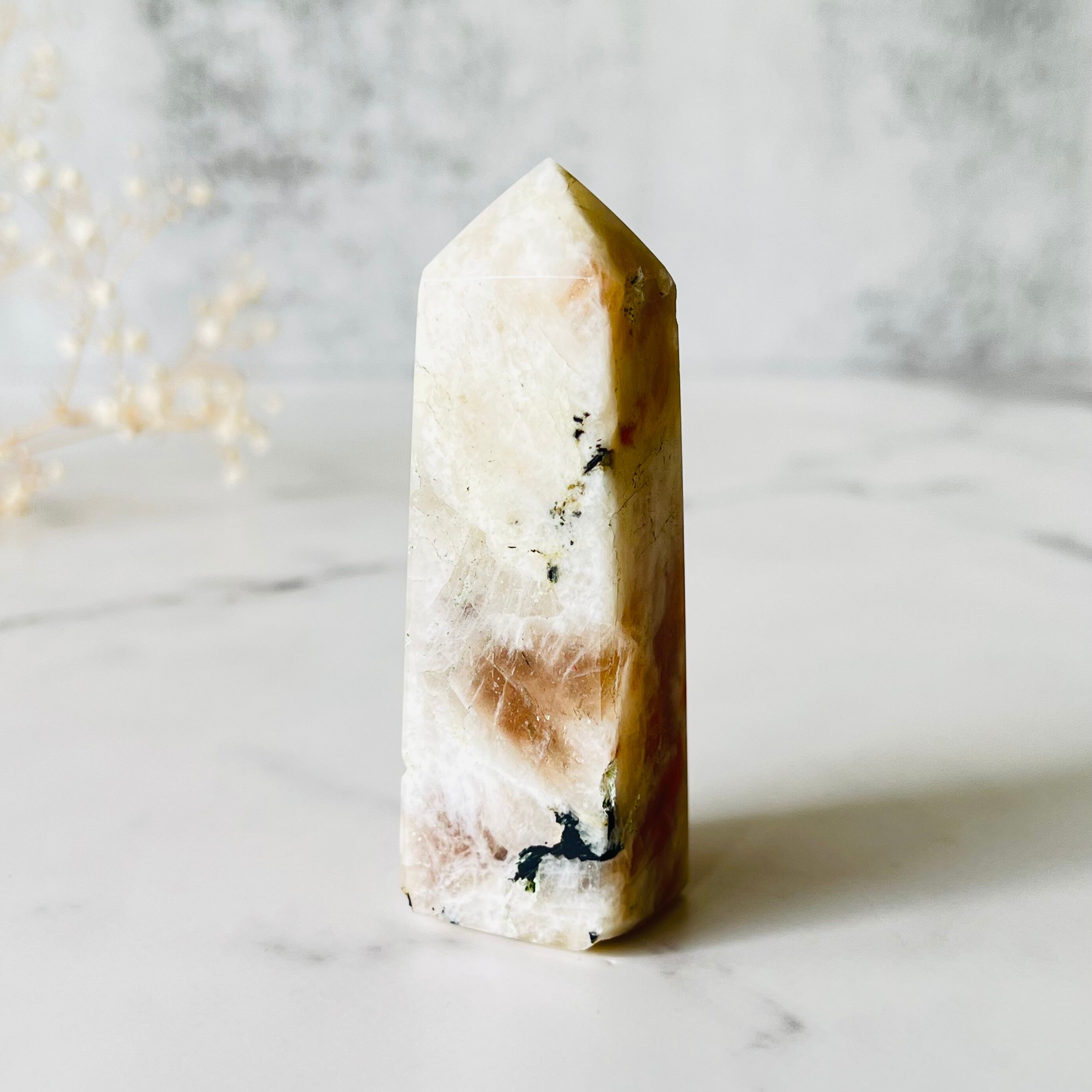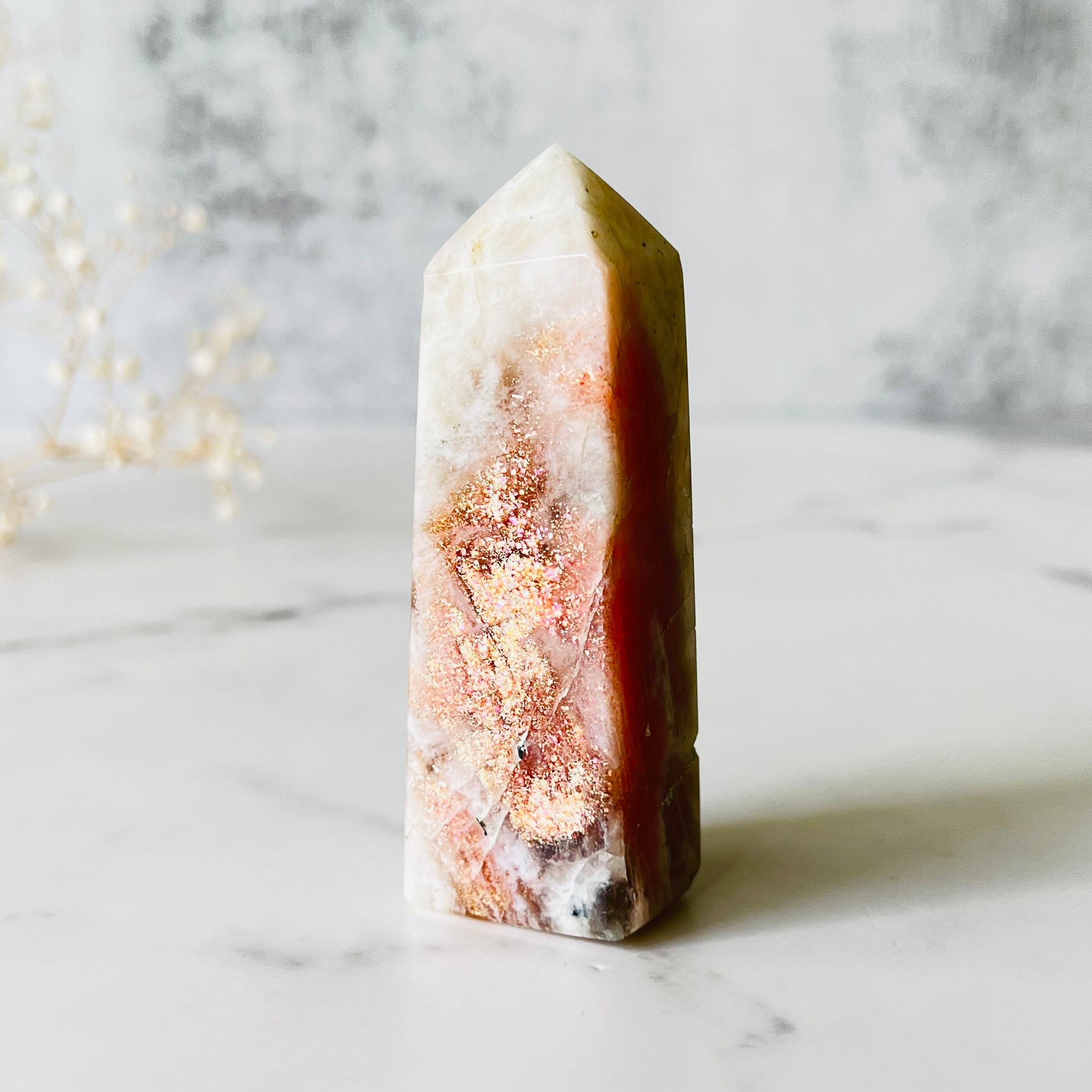 白いムーンストーンに透け感のあるオレンジ色のサンストーンが混ざり合った美しい色合いが魅力です。オレンジ色の部分に光を当てるとサンストーンが持つラメのような輝き、アベンチュレッセンス効果が見られます。オレンジ色に輝くフラッシュがとても綺麗です。