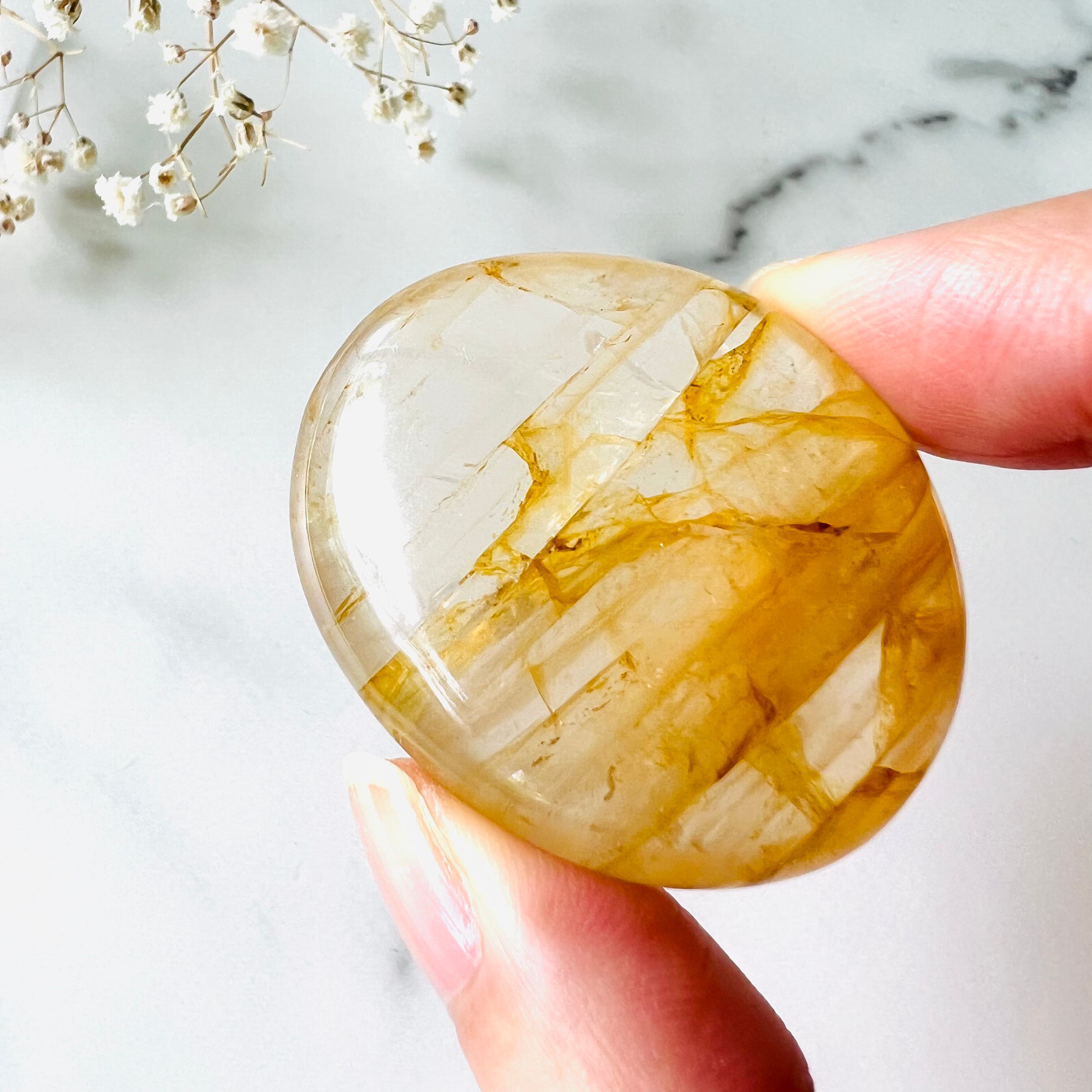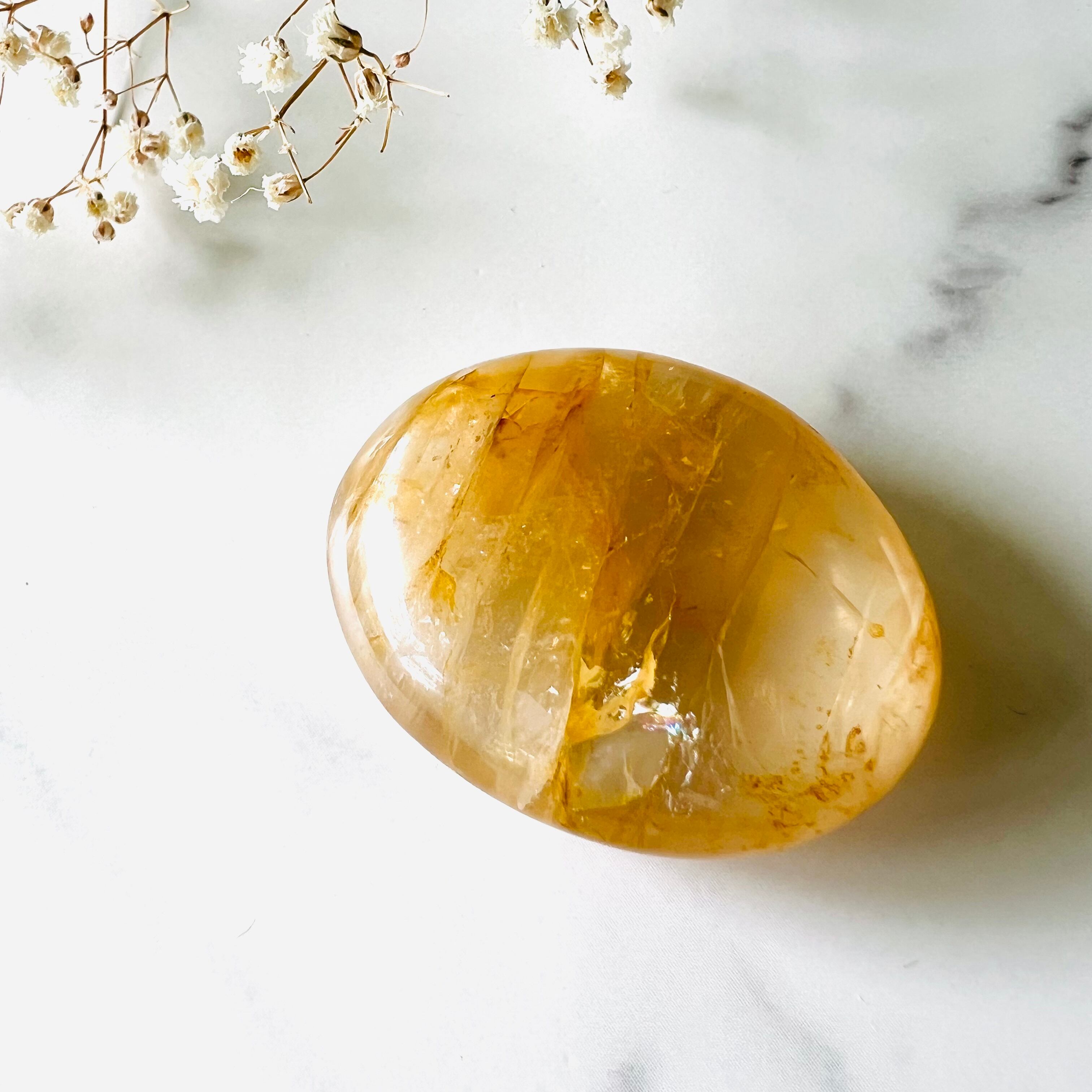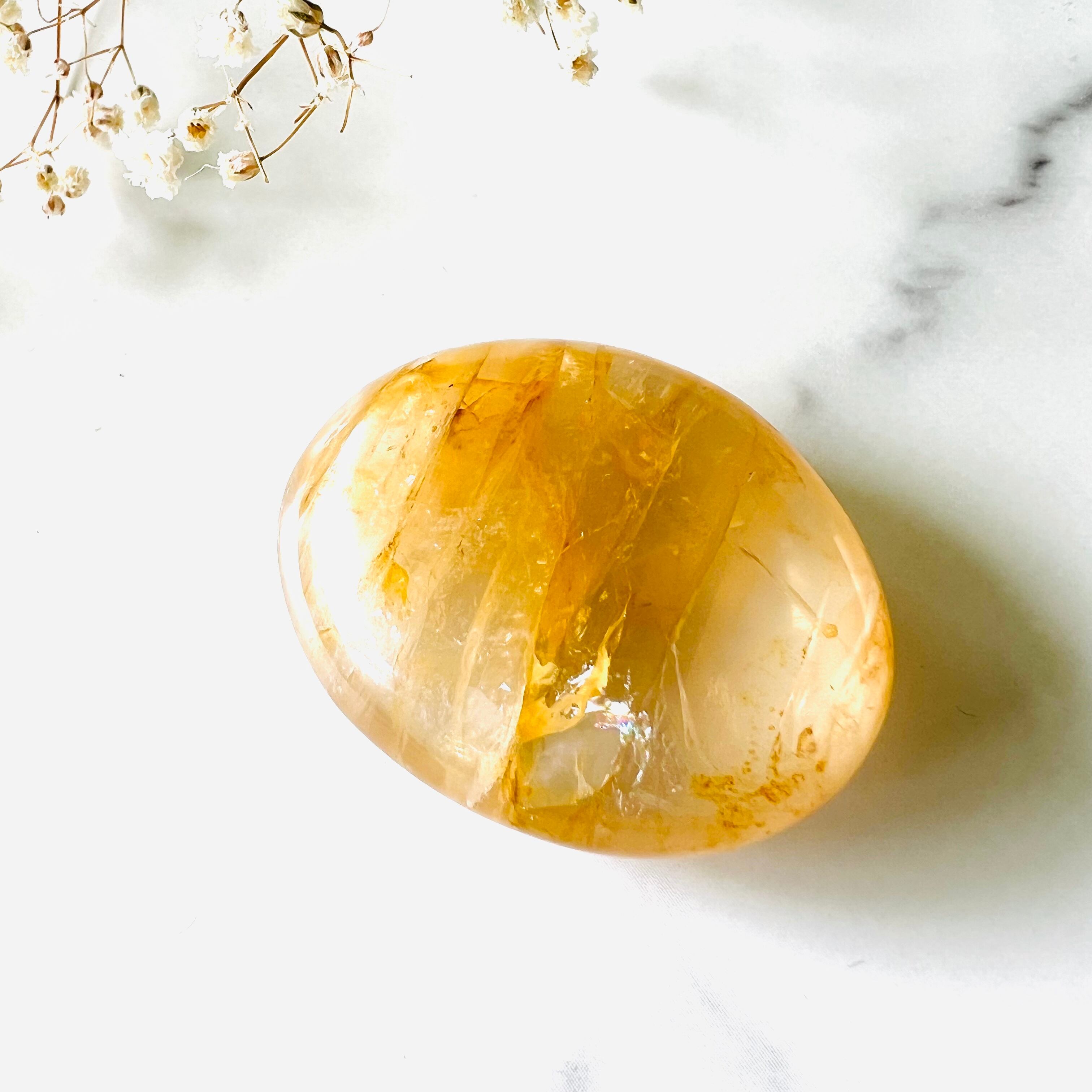透明度が高く発色の美しいゴールデンヒーラーのパームストーンです。透明なクォーツとゴールドイエローが混ざり合い、キラキラ輝く虹も綺麗です。