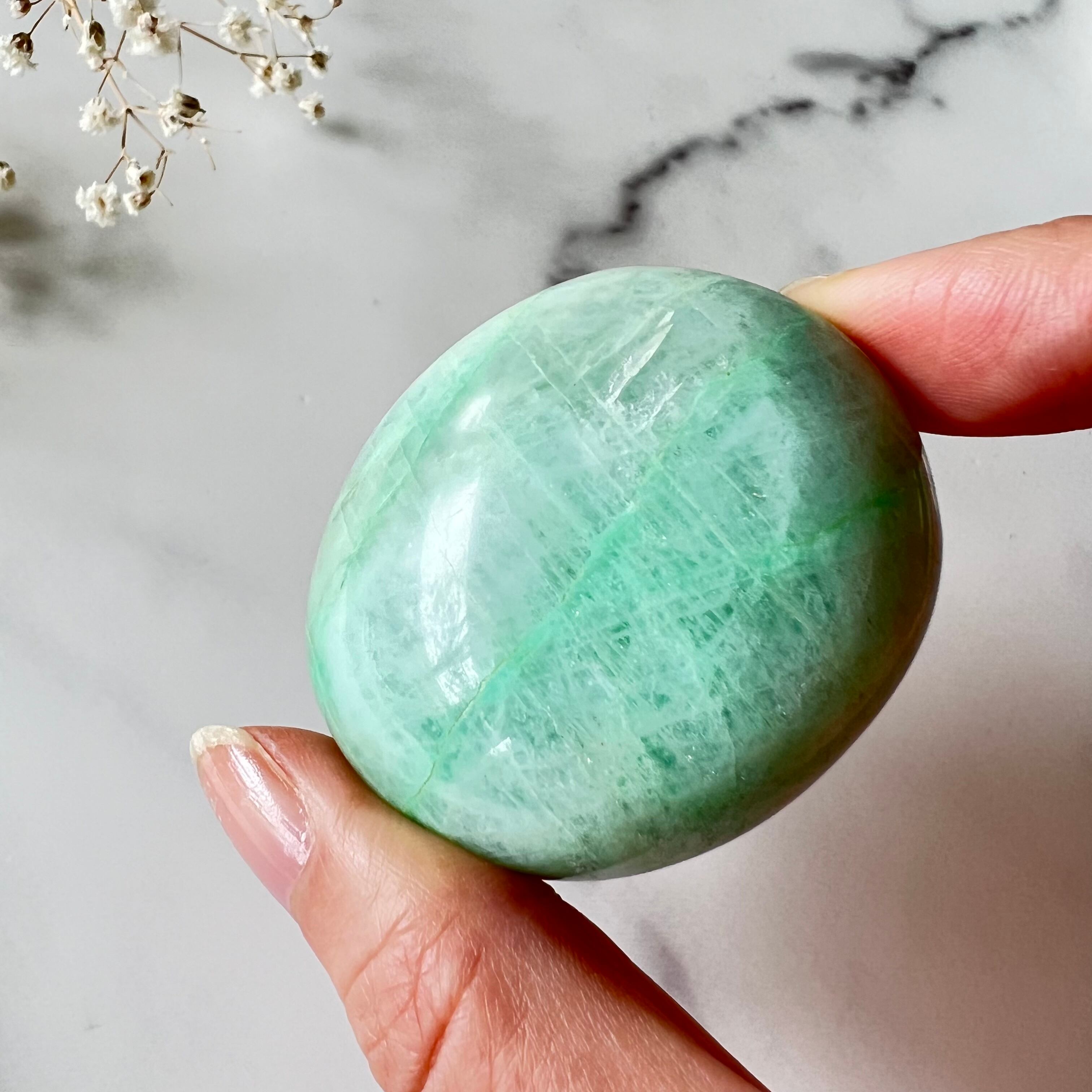 淡く柔らかなミントグリーンが印象的な天然石、ガーニエライト(グリーンムーンストーン)。
