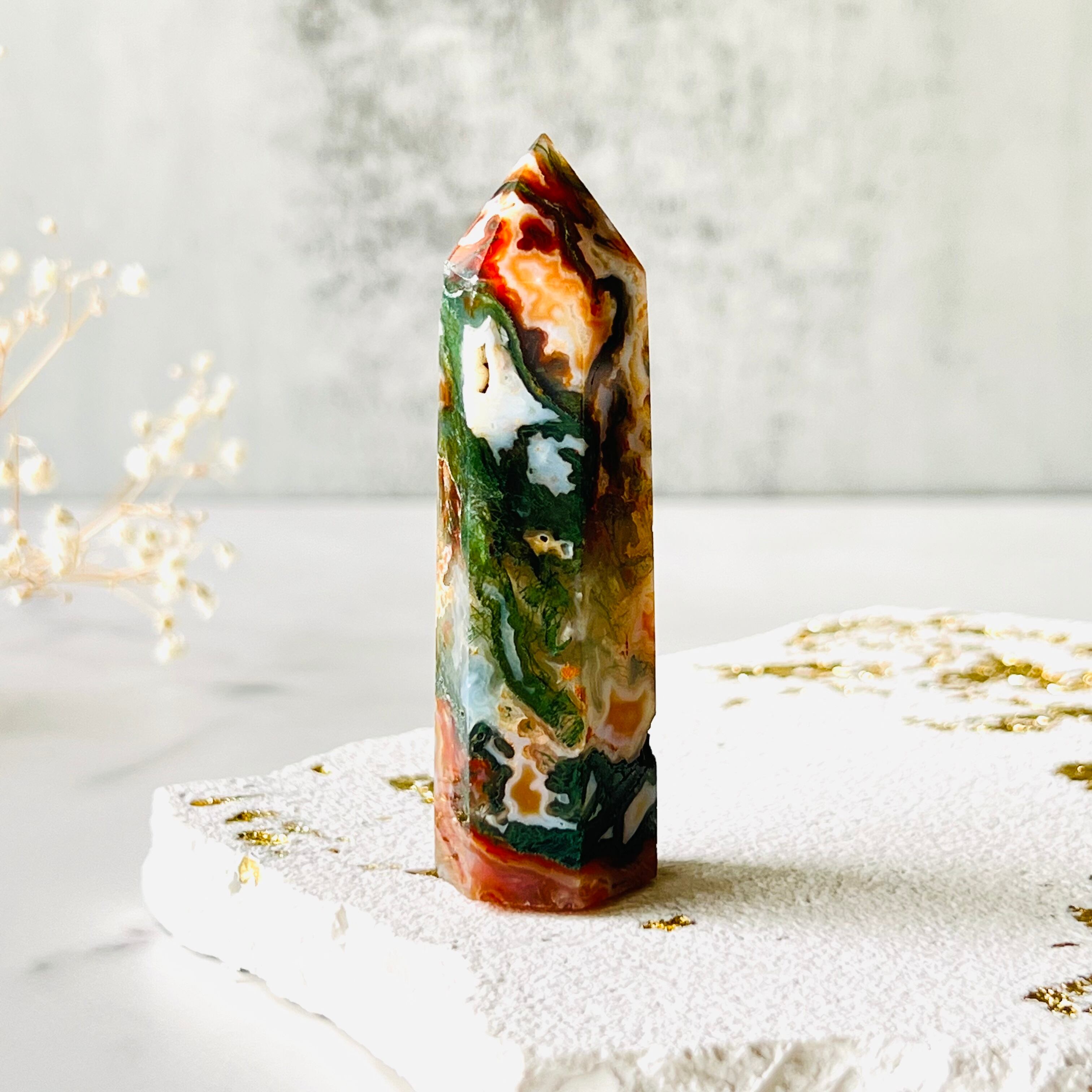 癒しの石として知られるモスアゲートは感情の乱れを整え、エゴや執着を解き放ち、心身を安定した状態に保ち、生活に疲れた人に平和で穏やかなパワーをもたらしてくれます。森林浴と同じ効果があると言われており、持ち主に自然の恵みを与え、富と繁栄をもたらすパワーストーンです。