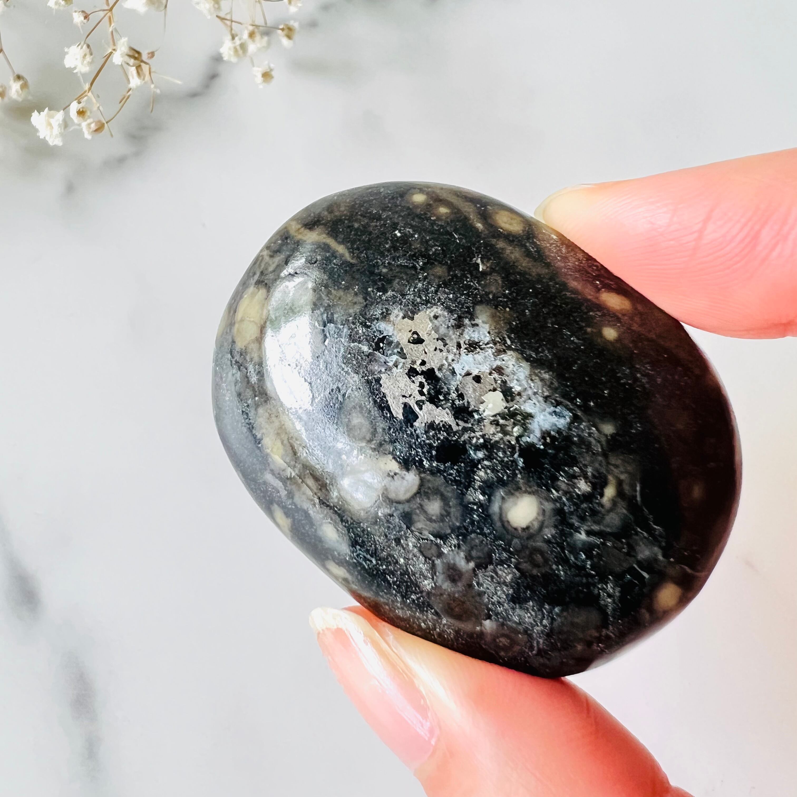 黒い石肌にブラウンのお花が咲いているような模様がシックでありながらも可愛らしく、パイライトが煌めいて綺麗です。まだあまり情報のない希少な天然石です。