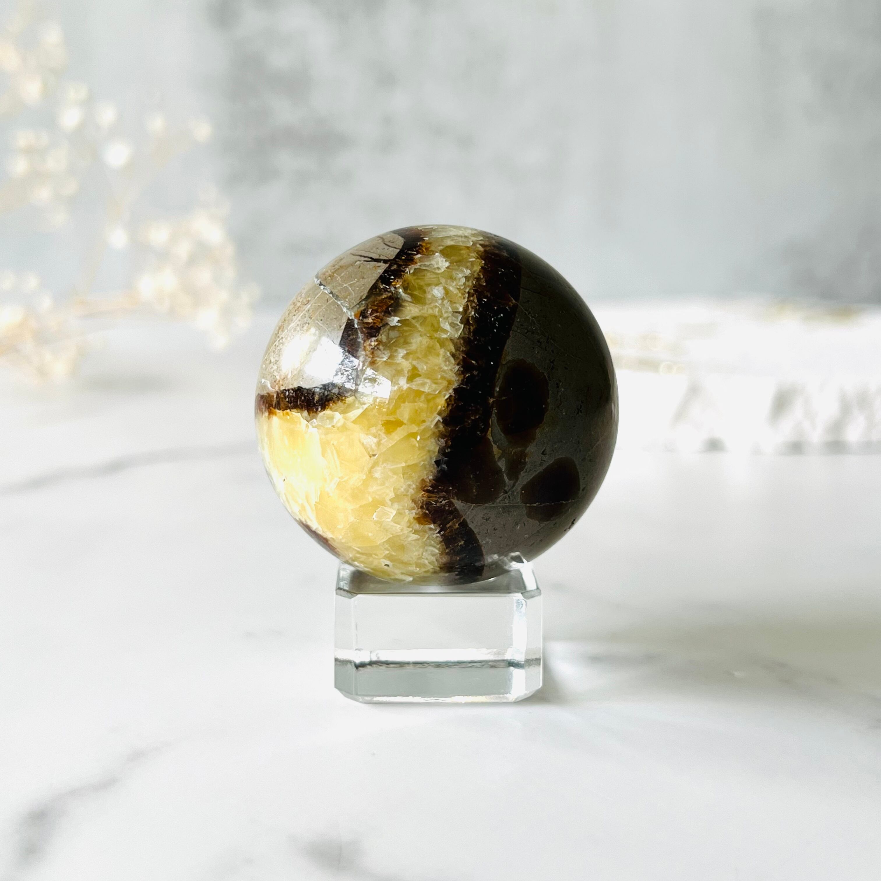 セプタリアンは石が割れたような模様が特徴で、ハニーゴールドカルサイトと、茶色いアラゴナイトがあわさってできた天然石です。 見た目がドラゴンの卵や、恐竜の卵を連想させることからドラゴンストーンとも呼ばれます。