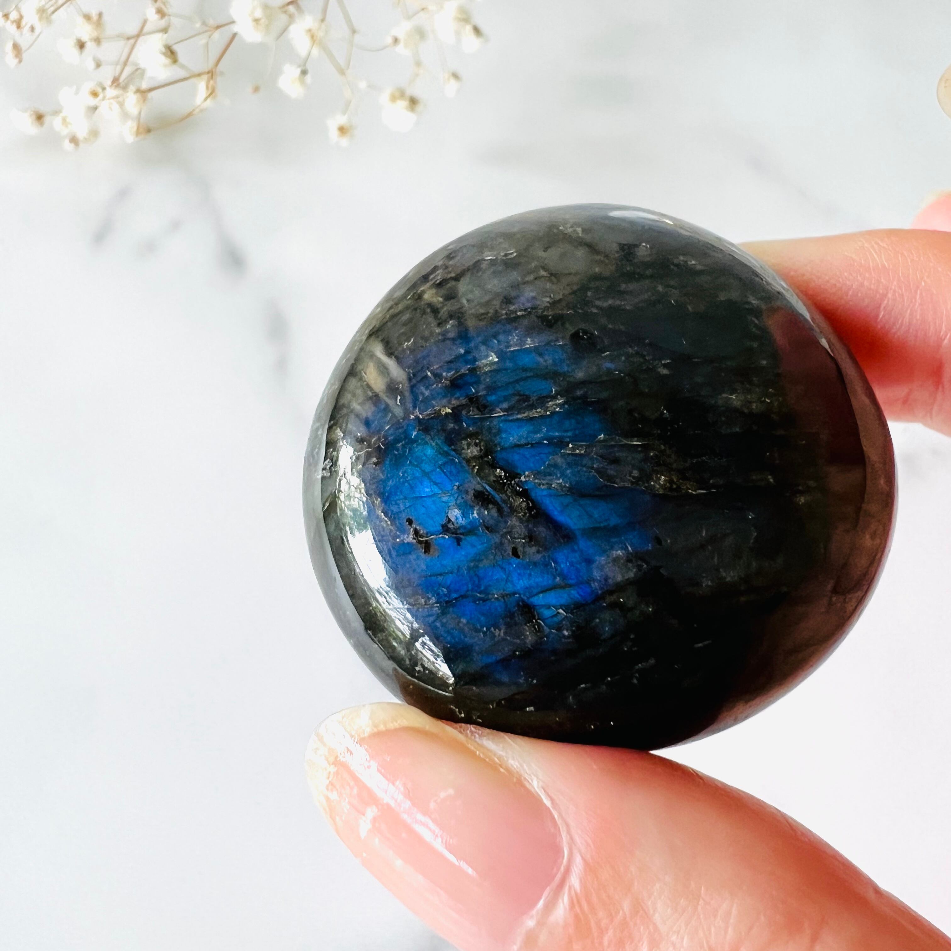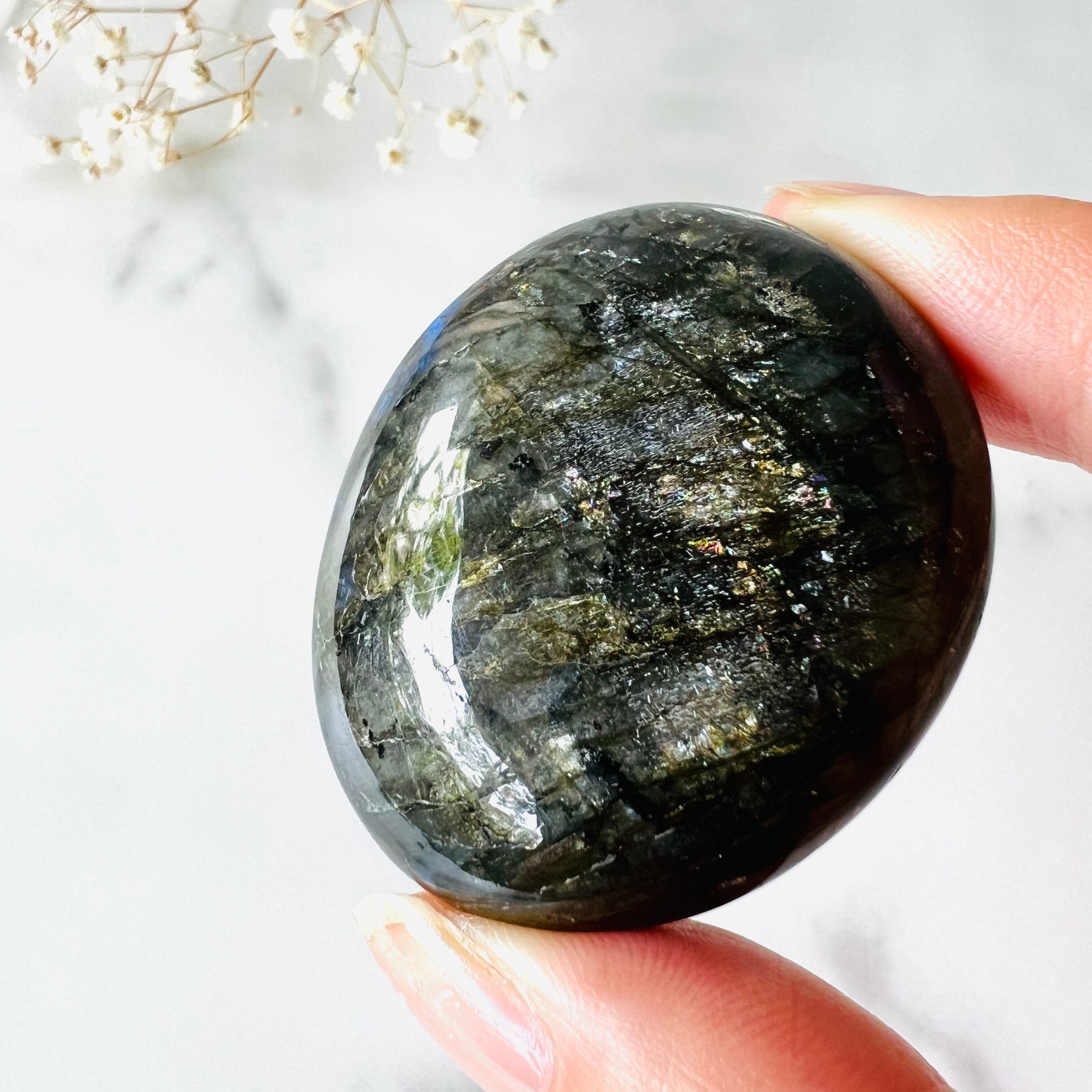 艶々の石肌がひんやりと心地よく手のひらに馴染みます。光にかざすと美しいブルーのラブラドレッセンスや虹色の光を放つラメが浮かび上がります。