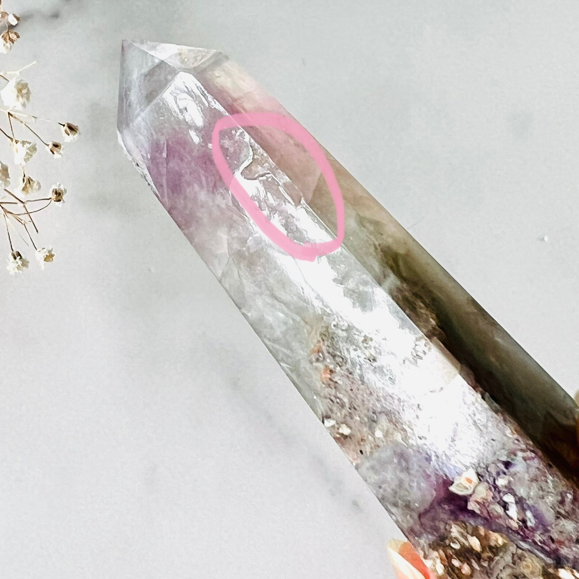 フローライトのミニタワーです。ボトムに共生している石の模様もとても綺麗で、美しい景色を眺めているようです。透明感のあるフローライトは移りゆく曖昧な時間帯の空のようで、キラキラ煌めく虹が魅了します。