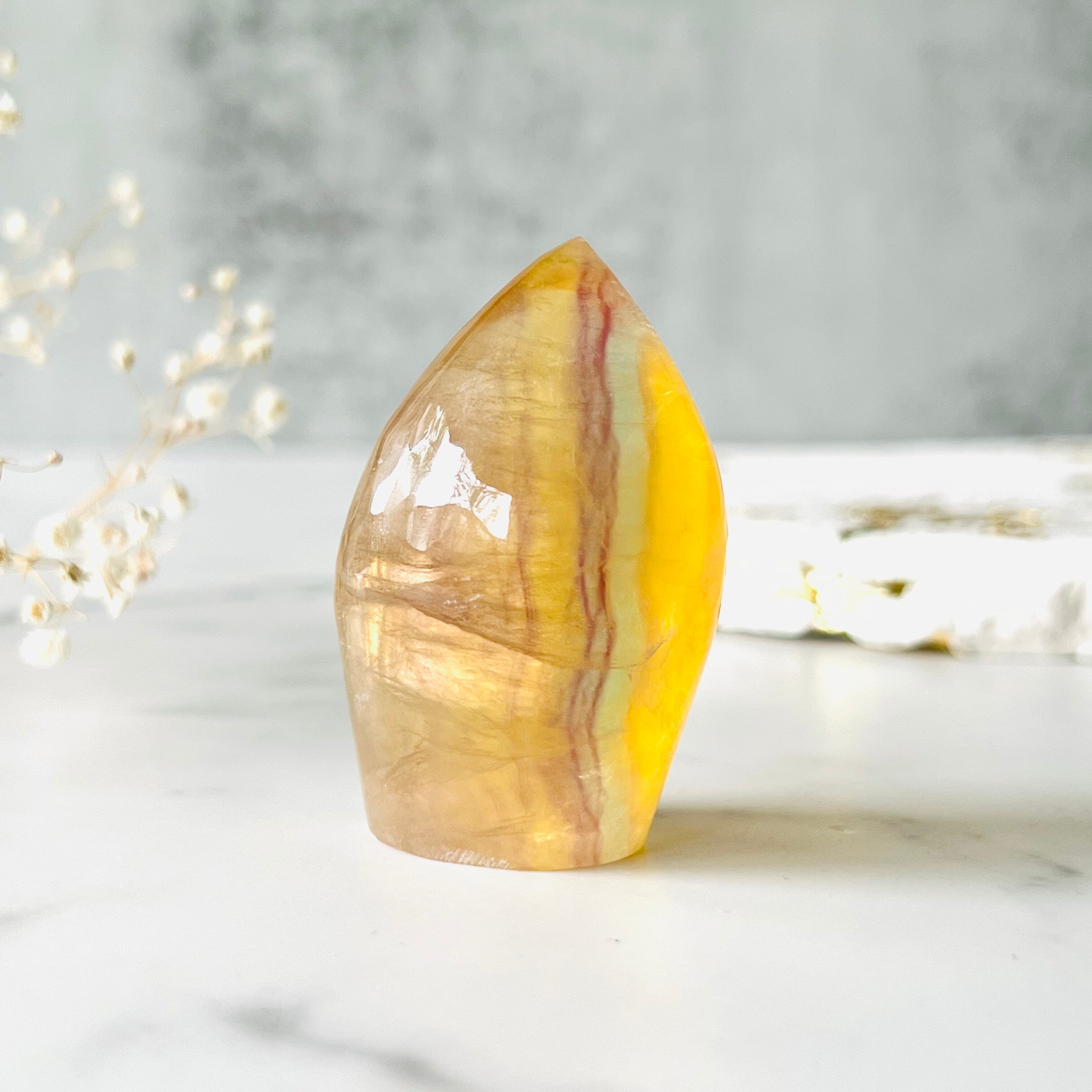 透明感のある黄色いフローライトで、コロンとした形が可愛らしいです。