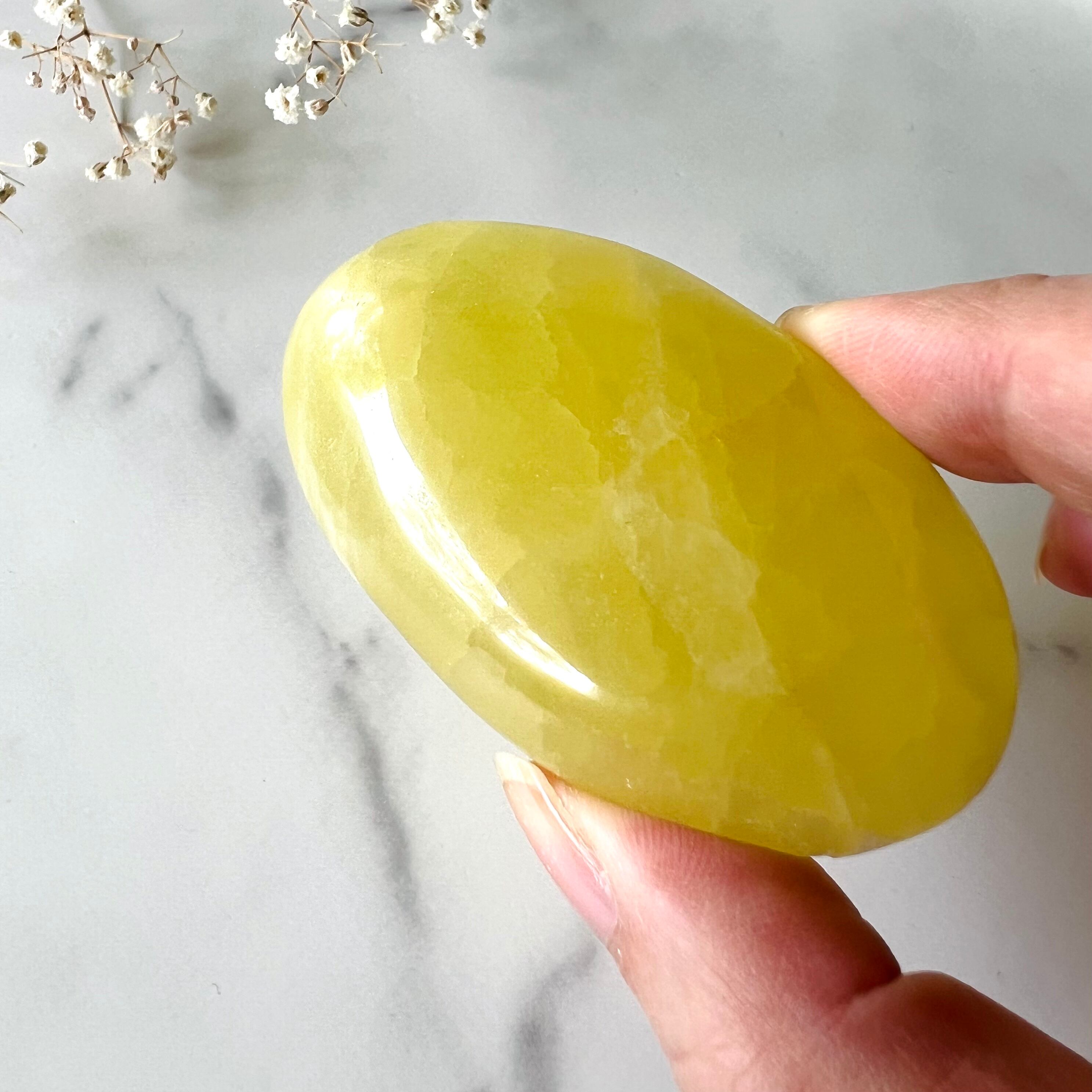 綺麗なレモンイエローのレモンカルサイトパームストーンです。カルサイトのほんのり透け感のある軽やかな質感と、美しい発色が魅力です。